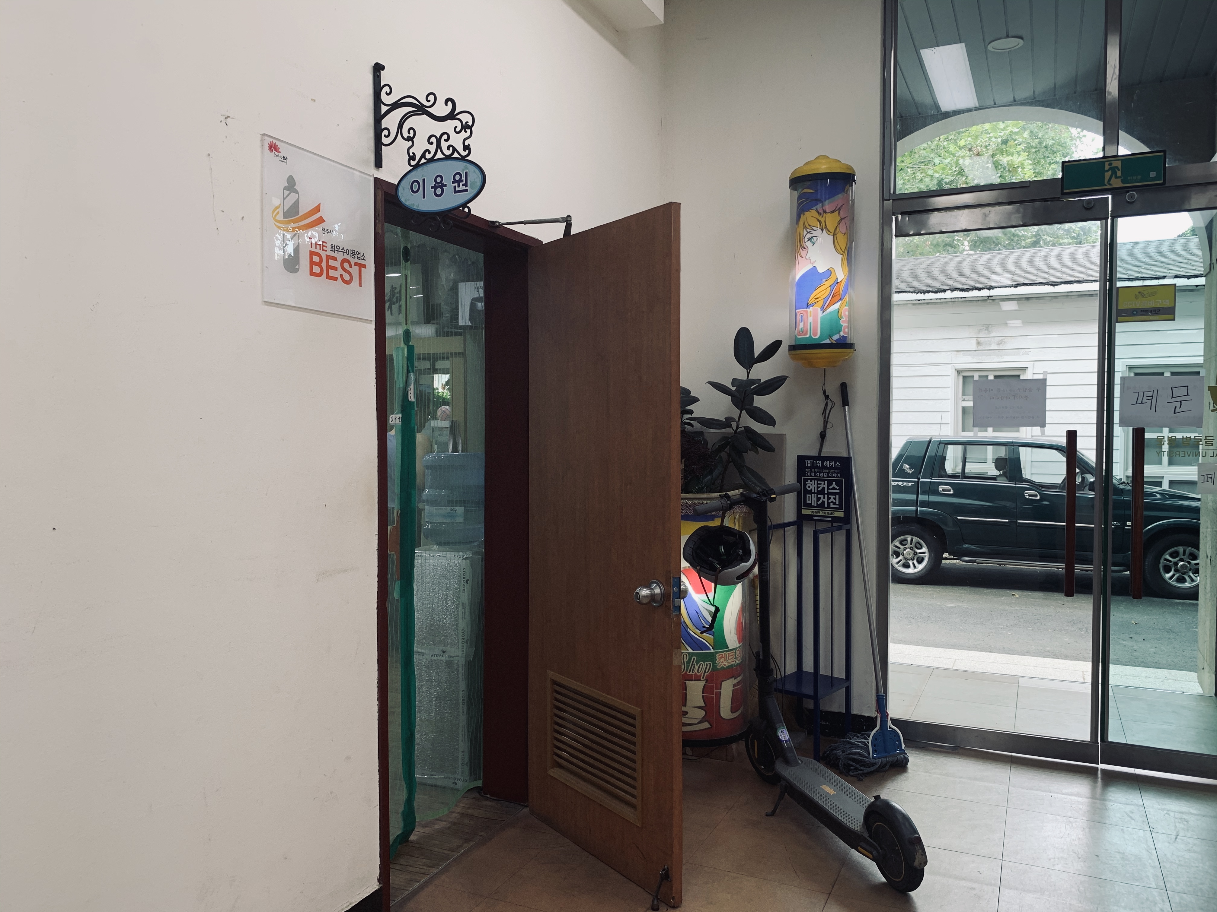 전북대학교 내 학생회관에 위치한 이용원입니다. 학생회관에는 2개의 이용원이 있는데, 하나는 커트 하우스(주로 여성을 위주로 이용하는 장소이나.... 대부분 젊은 남성이 이용하고 있고) 다른 하나는 이용원으로 어르신들이 많이 이용하는 장소입니다. 이 이용원은 예전 대학생 시절 종종 이용했던 장소인데, 졸업하고 꽤 시간이 지나 다시 방문하게 되었네요.