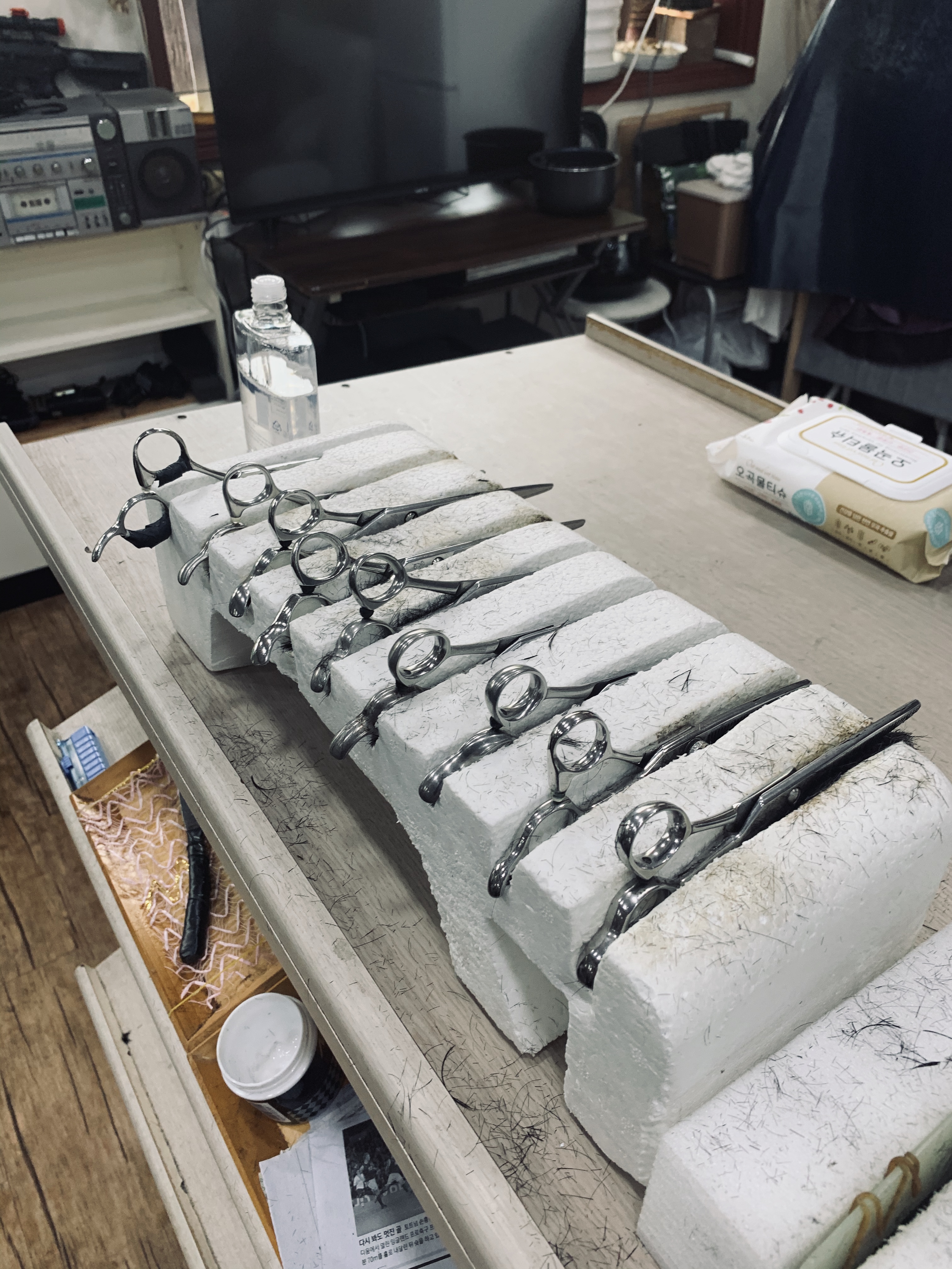 그리고, 오래된 유니온 프로 9500 드라이기와 모발 종류에 따라 사용하는 10가지(+이발기) 미용도구가 눈에 들어오더군요. 이용요금 사진을 찍으려고 했으나, 요금표가 안 보이네요. 머리를 다 깎고서 현금 10,000원을 지급하였습니다. 요금은 요금통에 쏙~~~ 넣어달라고 하시네요.