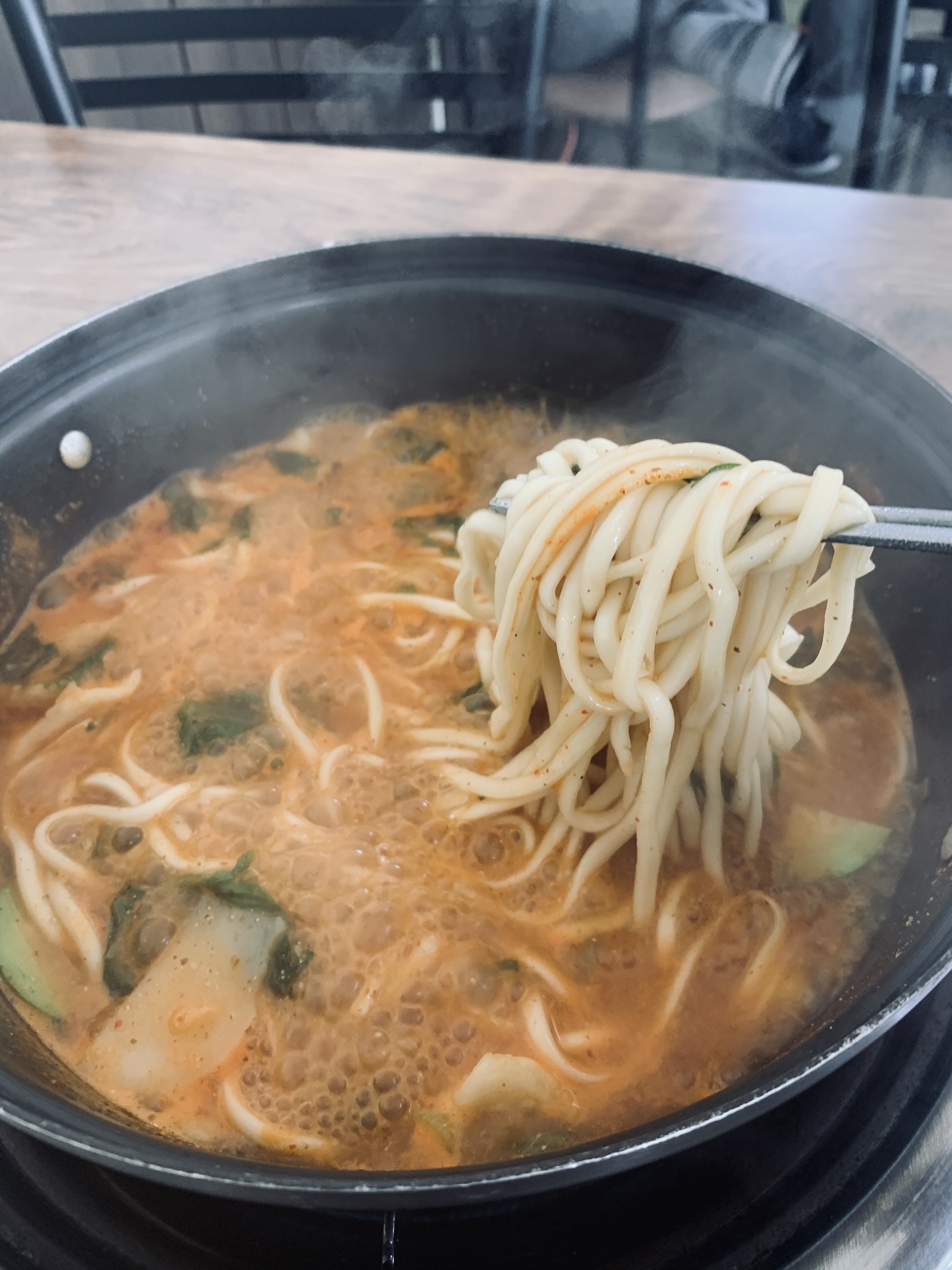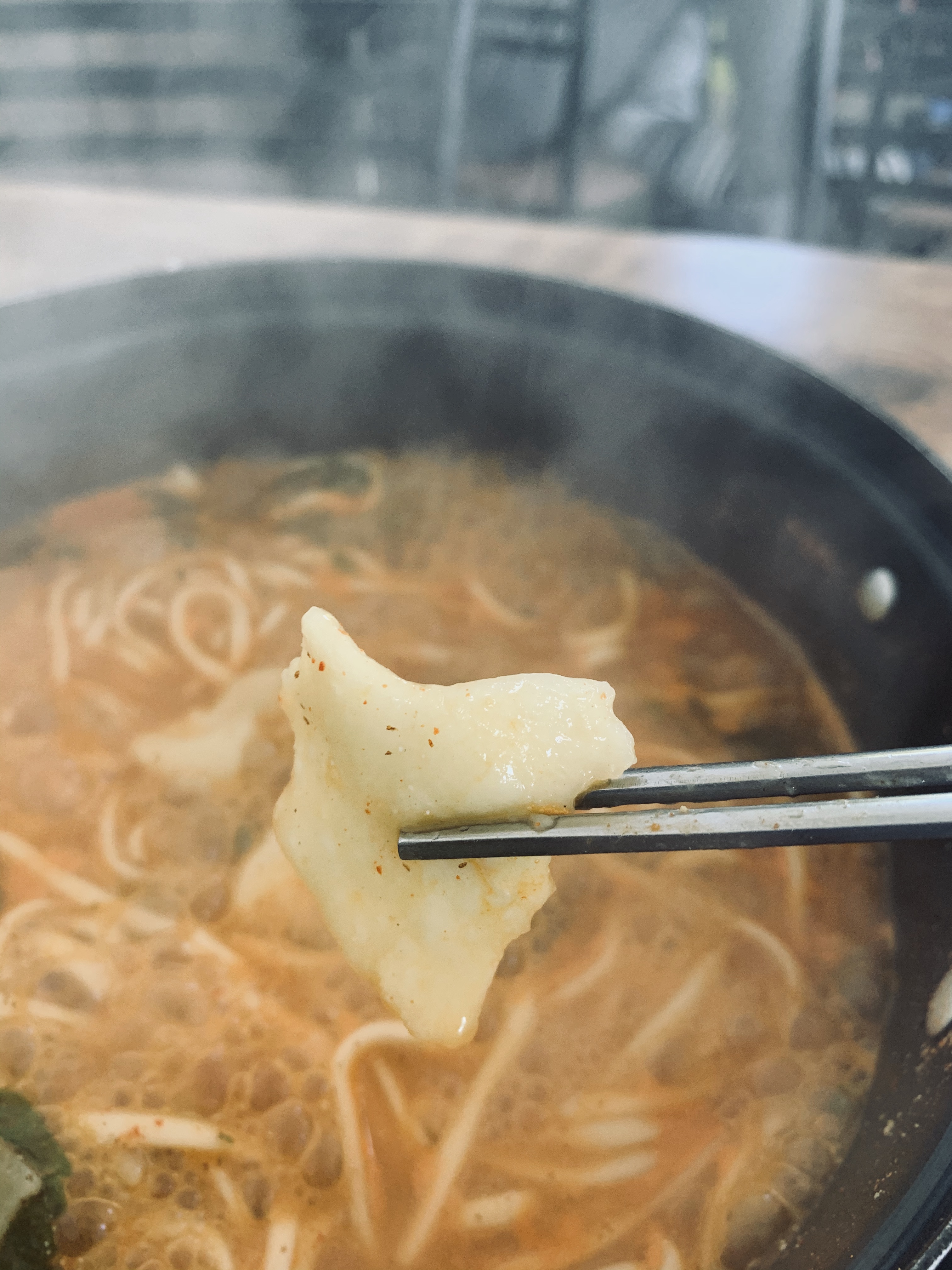 칼국수가 익기 전 국물을 맛보았는데..... 맹한 느낌의 국물 맛이 나더군요. 칼국수 면과 수제비가 들어가 있는데, 양은 1인분으로 많은 들어가 있더군요. 칼국수가 좀 익었을 때 국물을 먹어보니!!! 처음에 먹었던 국물 맛과 사뭇 다른 느낌이더군요. 심심하던 국물은 근 적 근 적한 어죽의 느낌의 농도로 변하며, 약간의 매콤함과 진한 국물 맛을 느낄 수 있었네요.