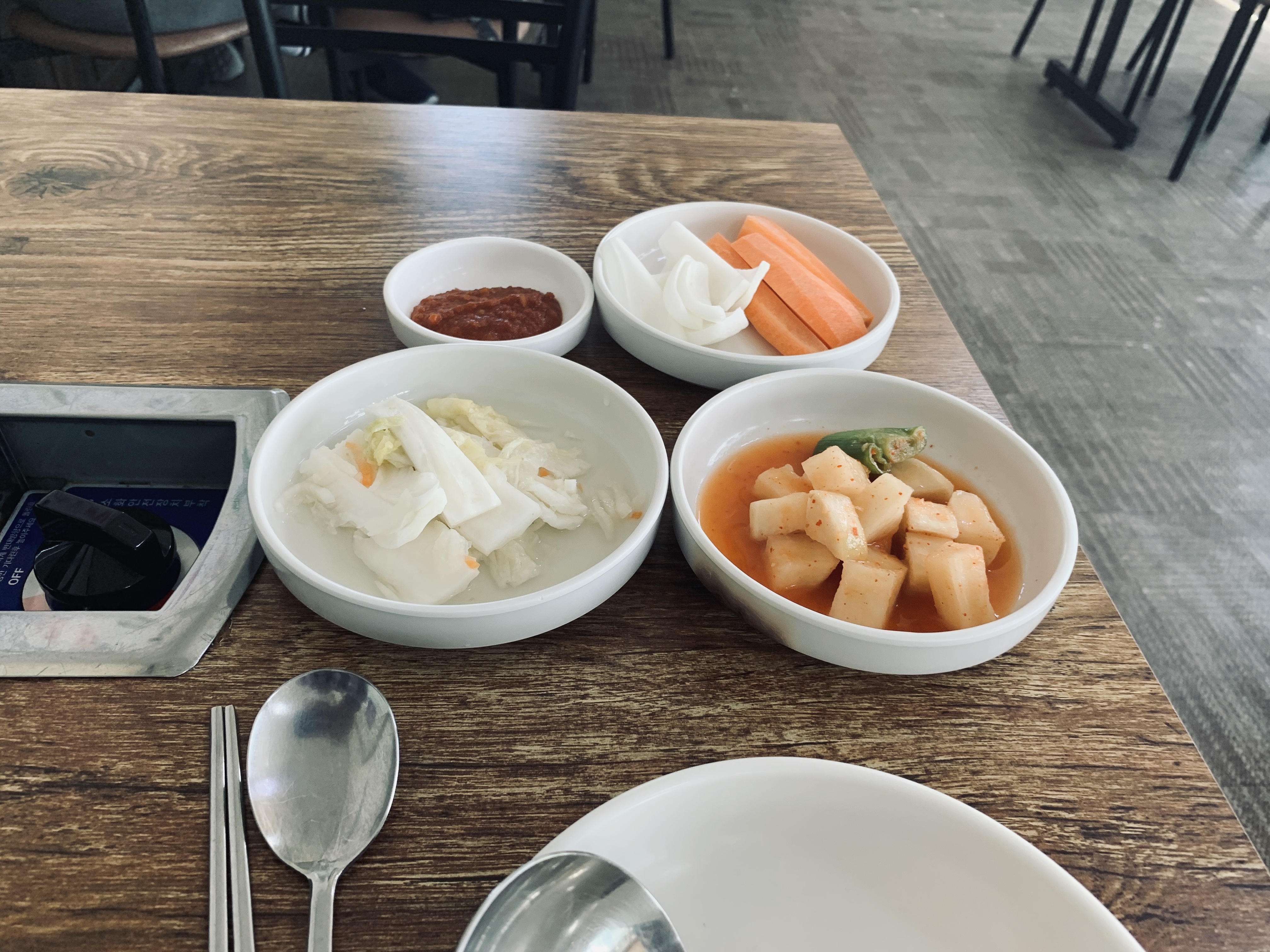 어죽 칼국수 1인분 7,000원인데, 그릇에 칼국수가 나올 거라 생각했는데, 넓은 냄비에 나오네요. 기본 반찬으로 깍두기, 물배추 김치, 양파와 당근이 나오네요. 깍두기는 좀 심심한 맛이라 제 입맛에는 안 맞았는데, 물배추 김치는 삼삼하니 칼국수와 먹기 좋더군요.