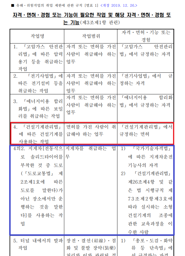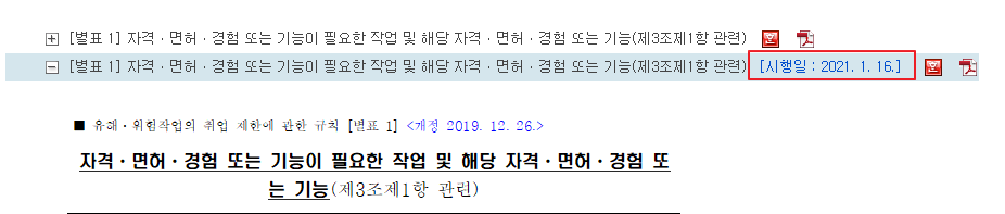 - 관련 법령 : 유해 위험작업의 취업 제한에 관한 규칙 별표 1