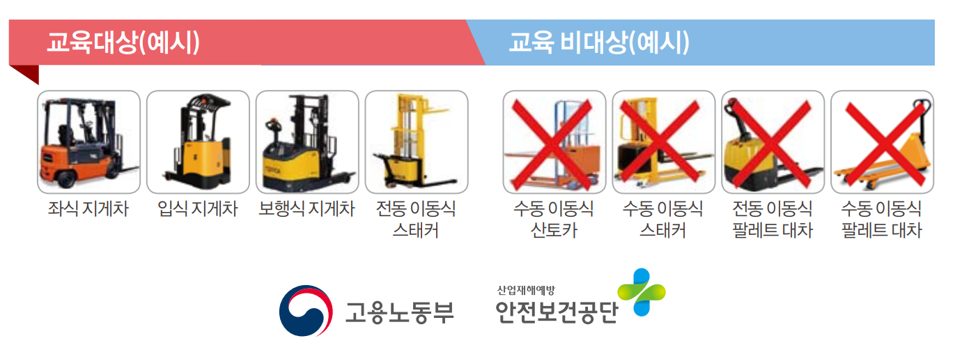 - 아래의 교육 비대상의 지게차의 경우 운전면허 자격이 없이 사업장 내에서 운행이 가능한 지게차입니다.