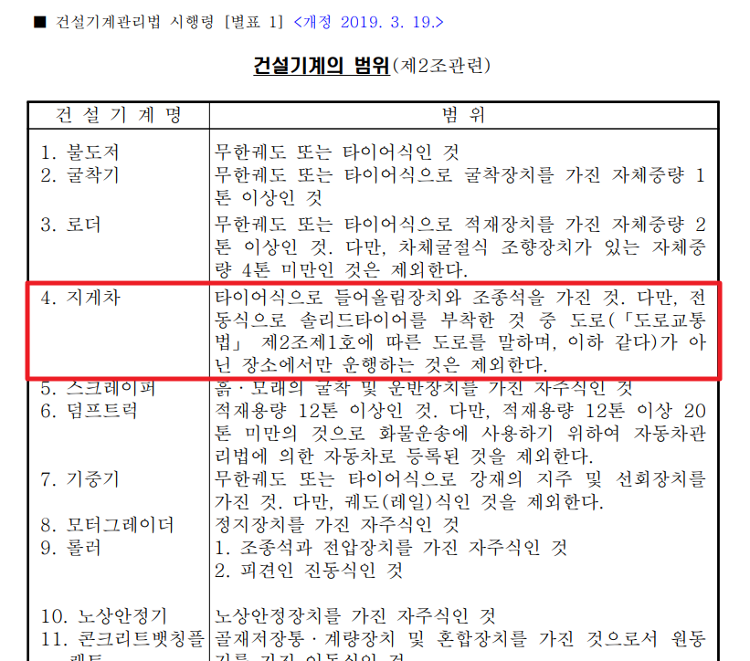 - 관련 법령 : 건설기계 관리법 시행령 별표 1 건설기계의 범위