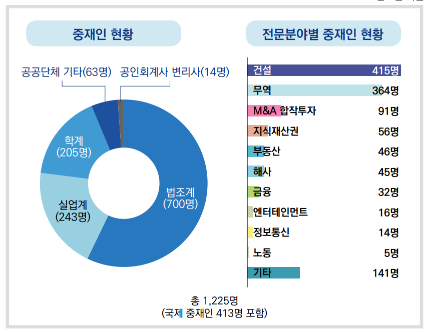 ○ 소송의 경우 전문분야에 지식이 있는 분들의 자문을 통하여 전문분야에 대한 이해와 판결을 진행하기에 소송이나 중재의 판결 결과는 크게 다르지 않다고 생각합니다. 대한상사중재원의 전문분야 중 건설분야 중재인이 가장 많이 있네요. 아무래도 건설 부분의 분쟁이 많이 있어서 그런가 봅니다.