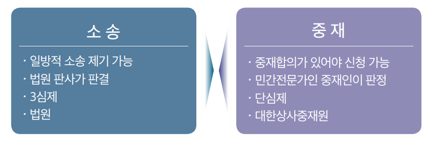 ○ 소송은 대한민국 법원에서 진행하고 있으며, 각 지역에 위치한 지방법원에서 진행하고 있습니다. 중재와 다르게 분쟁 외 모든 사건에 대하여 판단하고 있습니다.
