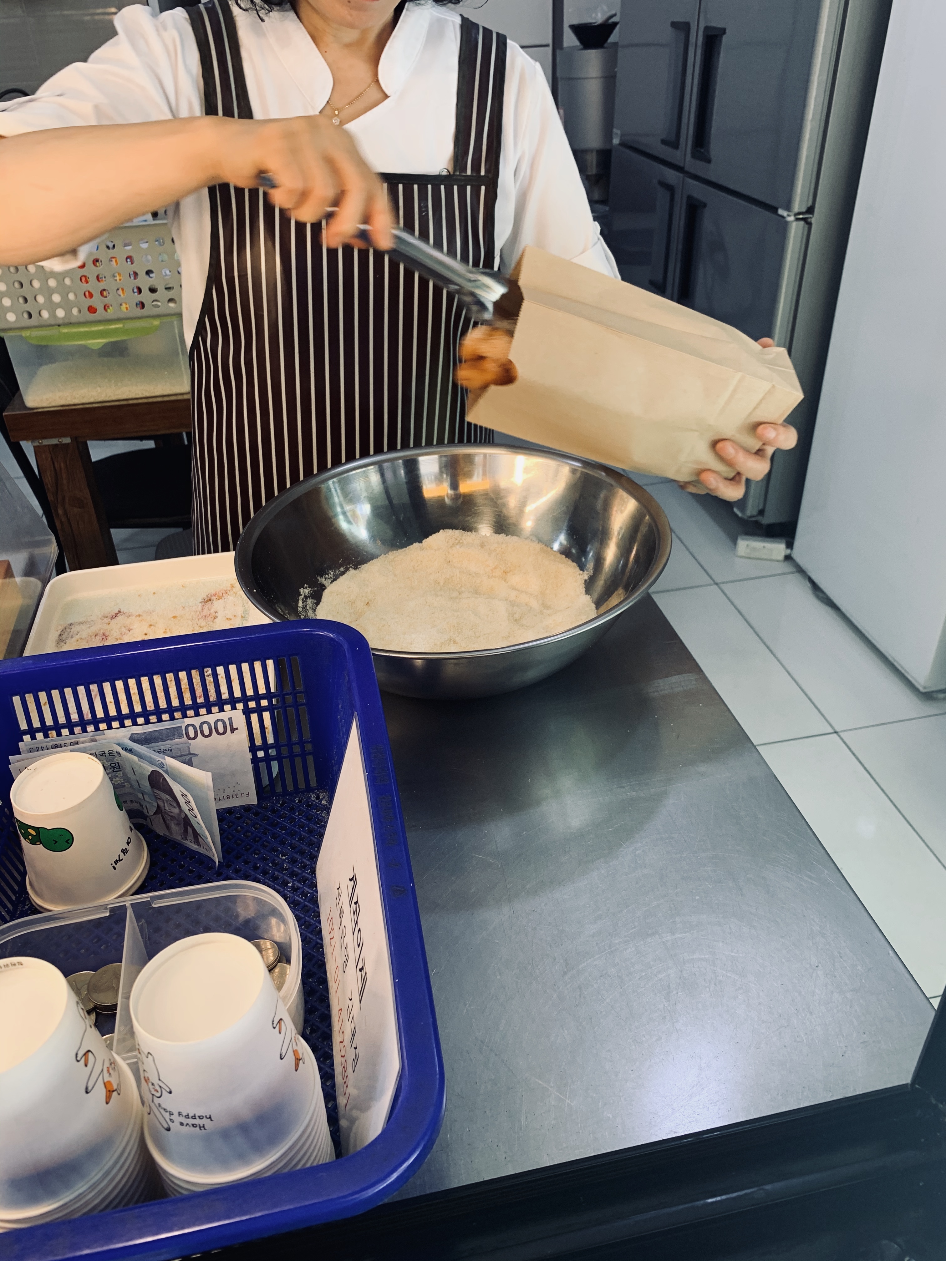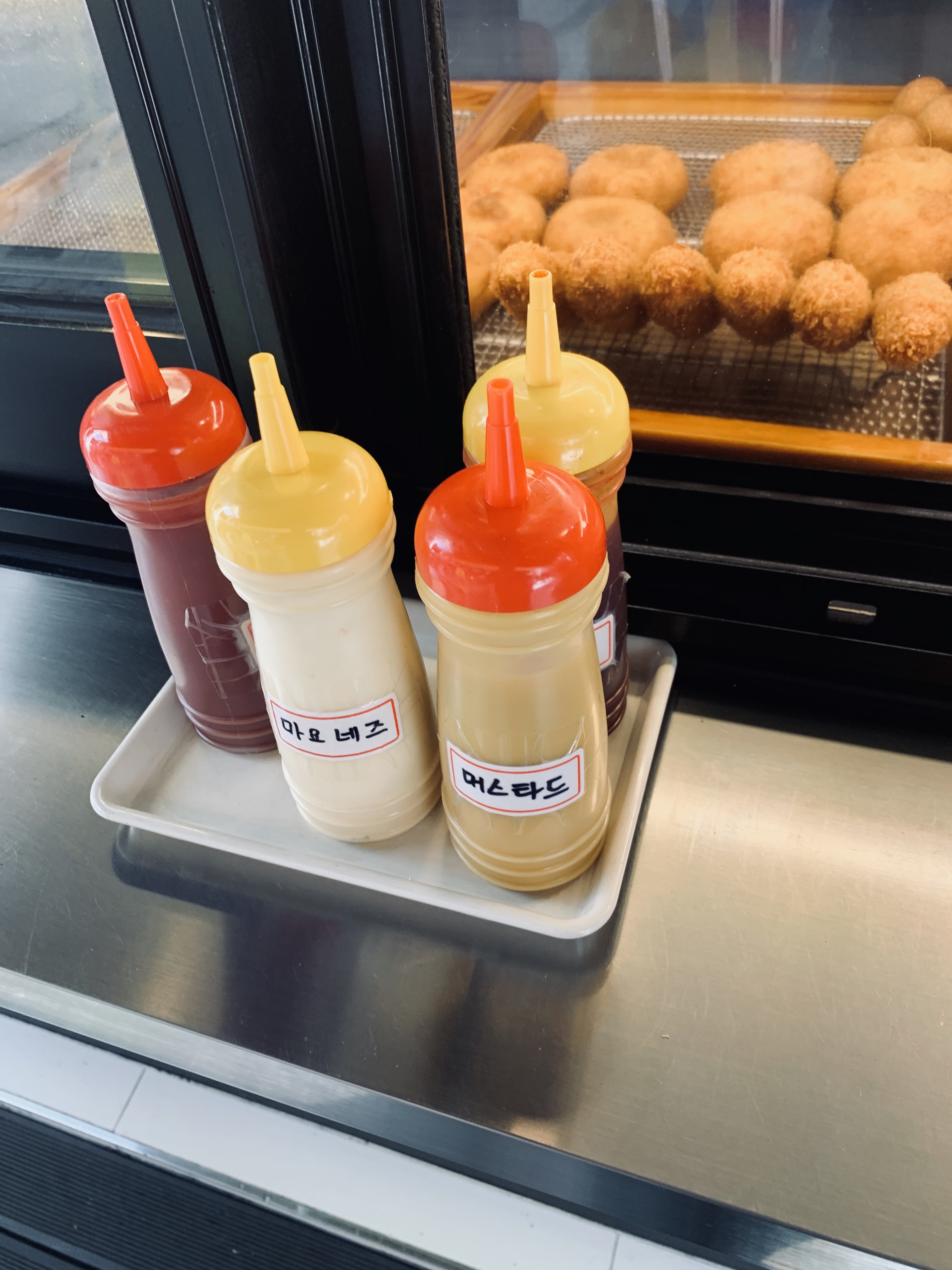 도넛 용 다양한 소스가 보이네요. 꽈배기를 맛보고, 맛이 괜찮으면 맛보려고 잠시 미루어 두고 꽈배기를 맛보았습니다. 꽈배기는 쌀짝 푸석한 느낌이 있었지만, 식감은 그리 나쁘지 않았습니다. 좀 더 찹쌀 느낌이 나리라 생각했었는데, 그렇지는 않더군요. 부드러운 맛보다는 빵에 가까운 식감이었네요.