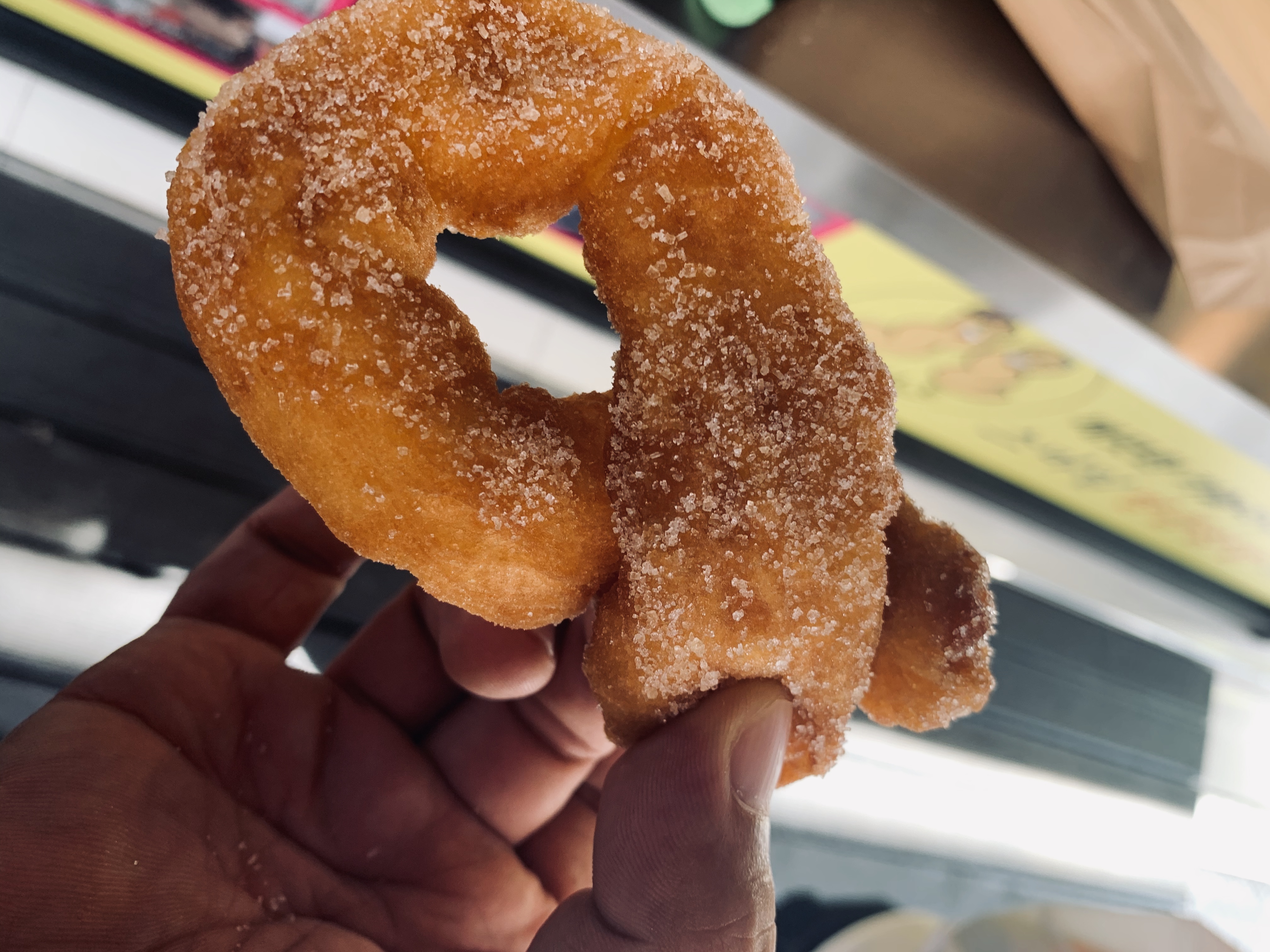 꽈배기 외 팥 도넛, 핫도그 크로켓, 치즈볼 등 판매하고 있더군요. 간판에 꽈배기 전문점이라 꽈배기 3개 2천 원에 주문했네요. 주문과 동시에 미리 튀겨진 꽈배기 설탕에 묻혀서 주 포장해주시네요.