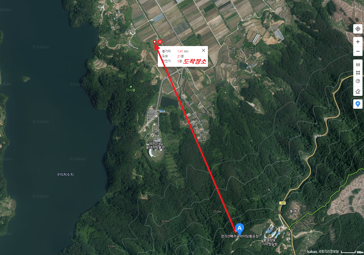 경각산 패러글라이딩 활공장에서 도착의 직선거리 1.4km입니다. 직선거리는 먼 거리는 아지니만 차량으로 이동하려면 6km는 더 되는 거리입니다. 패러글라이딩 활공 후 곧바로 차량으로 도착지로 이동하는 이유가 있었더군요. 패러글라이딩 도착지에서 장비와 사람들을 태워 사무실로 이동하여 내려주고... 다음 타임의 체험자를 태워 또 활공장으로 이동하고.... 이렇게 빠르게 움직여야 시간 단위로 체험을 운영할 수 있겠더군요. 한 시간 동안 이루어지기에 좀 버거운 시간이라 각 타임별로 지연이 되나 봅니다. 그래서 아이가 체험한 4시 타임이 5시경 체험하는....ㅎㅎ
