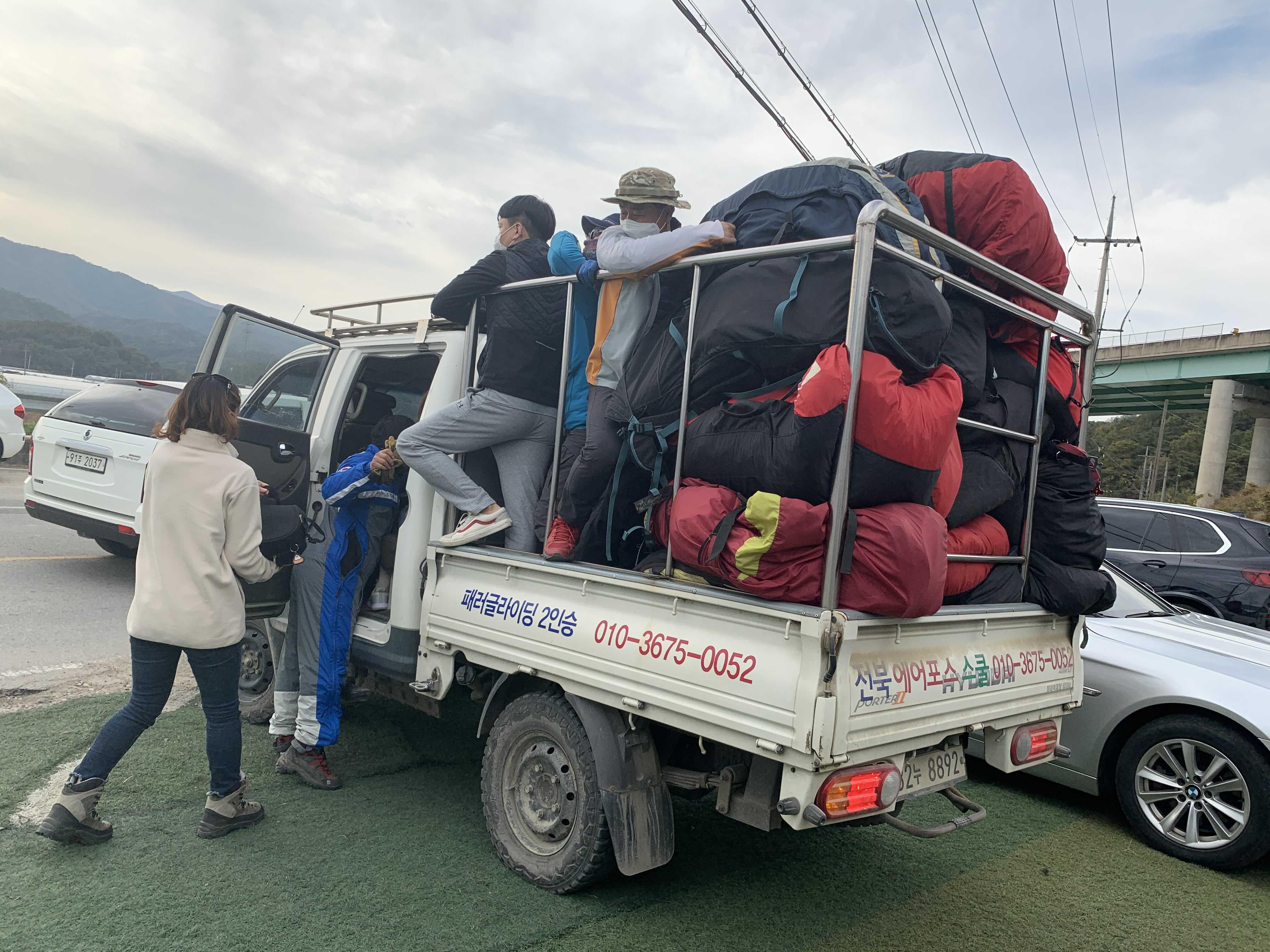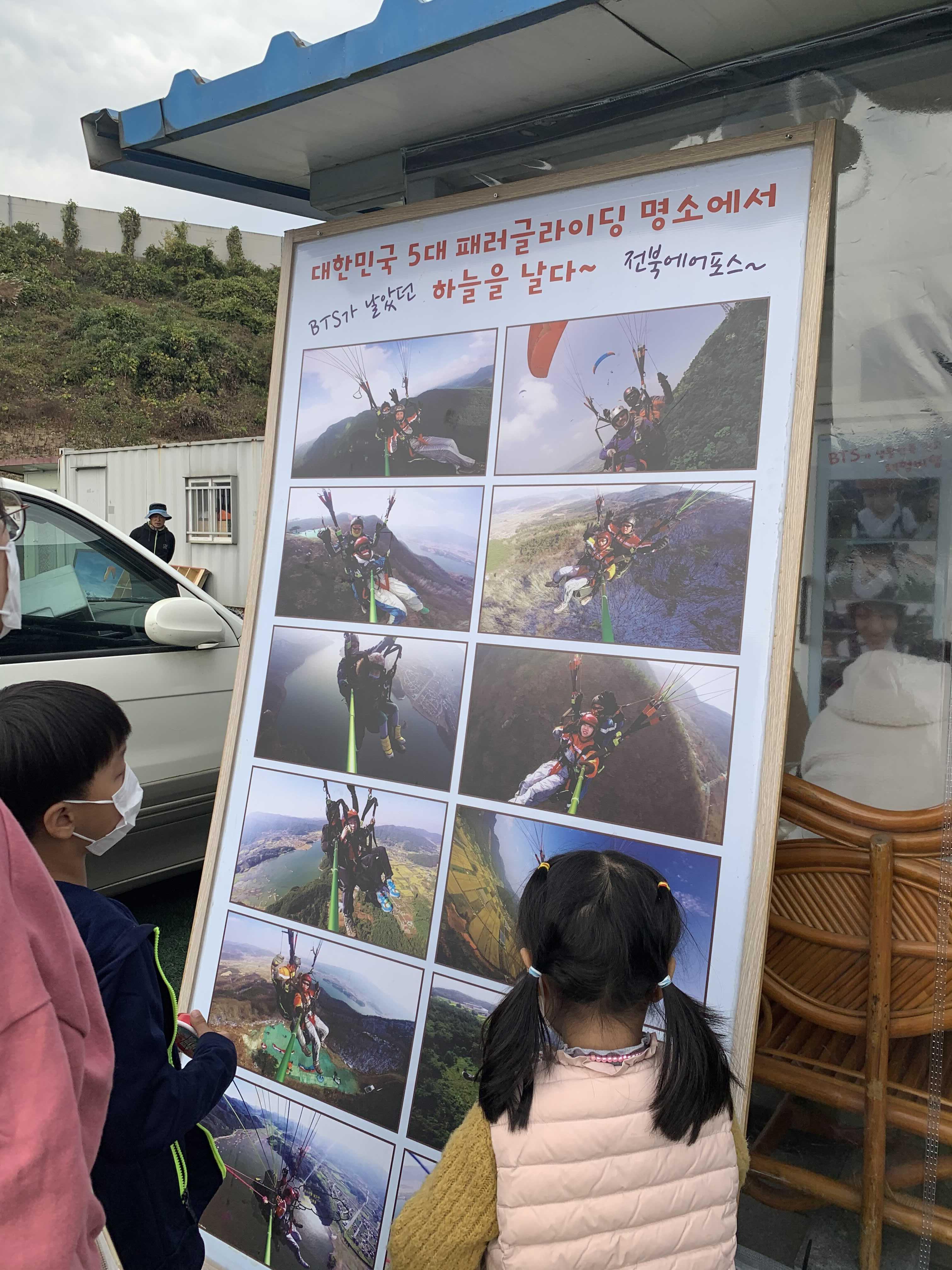 체험 장소에는 예전 BTS도 체험한 사진이 걸려있더군요. 아이의 체험시간이 다 되었지만, 이전 체험이 지연되어서 약 4시 30분이 다 되어서 패러글라이딩 활공장(경각산 신활공장)으로 향했습니다. 용달차량을 이용하여 이동하는데, 가파른 지역을 용달차량 4륜 구동으로 올라가더군요.ㅎㅎ 이렇게 가파른 언덕을 어떻게 오를까? 걸어가나 생각했었는데.... 차량으로 정상까지 올라가는 거 보니 신기하더군요.