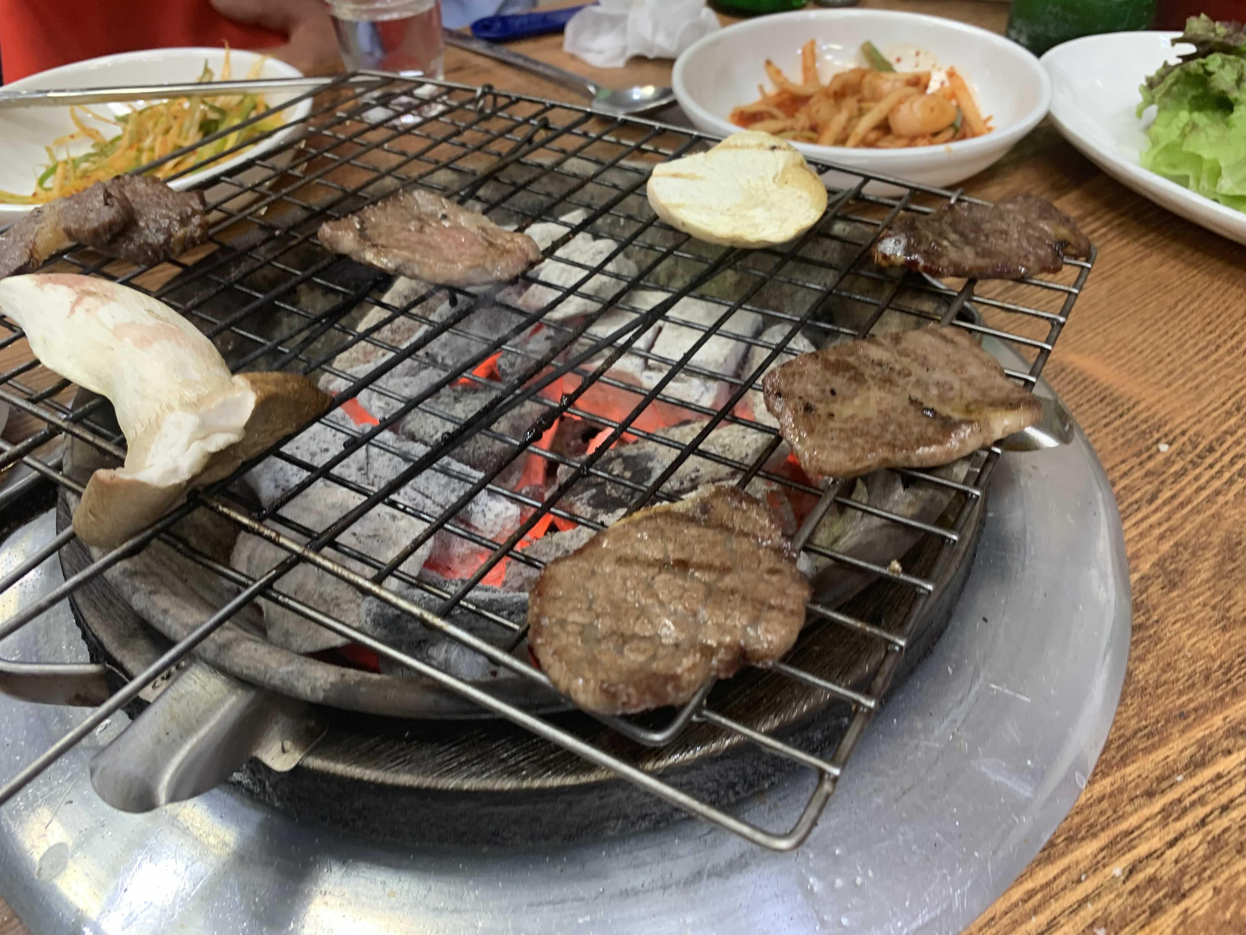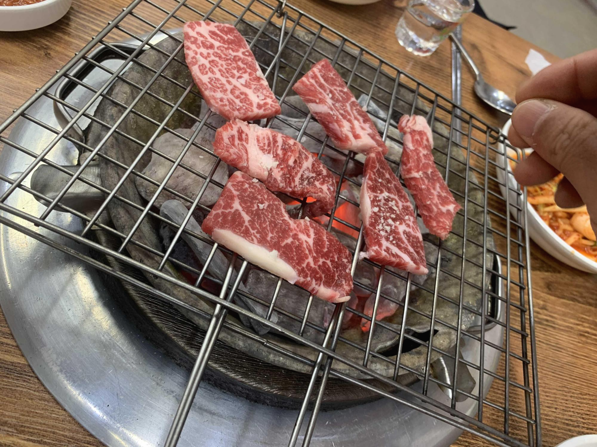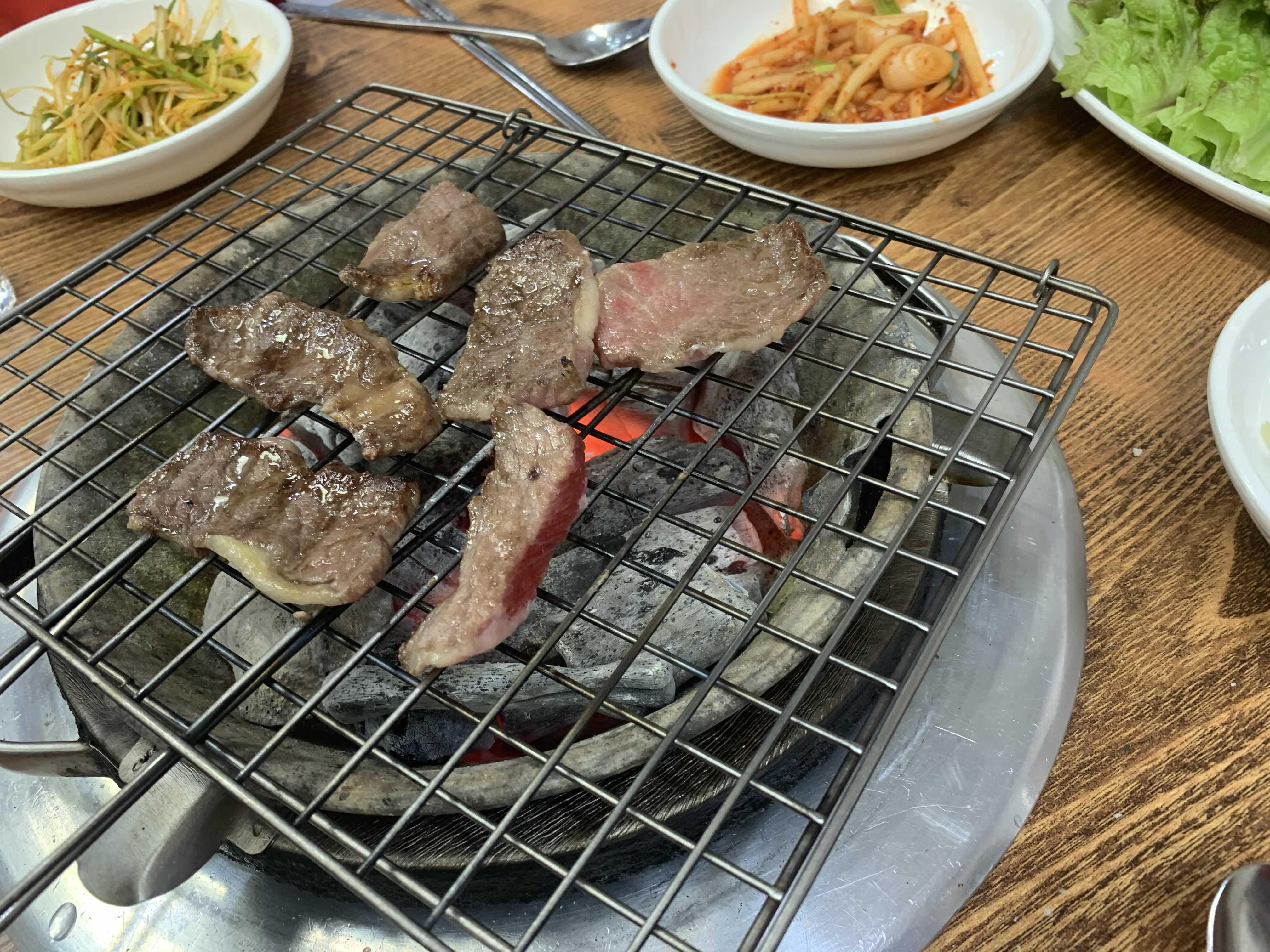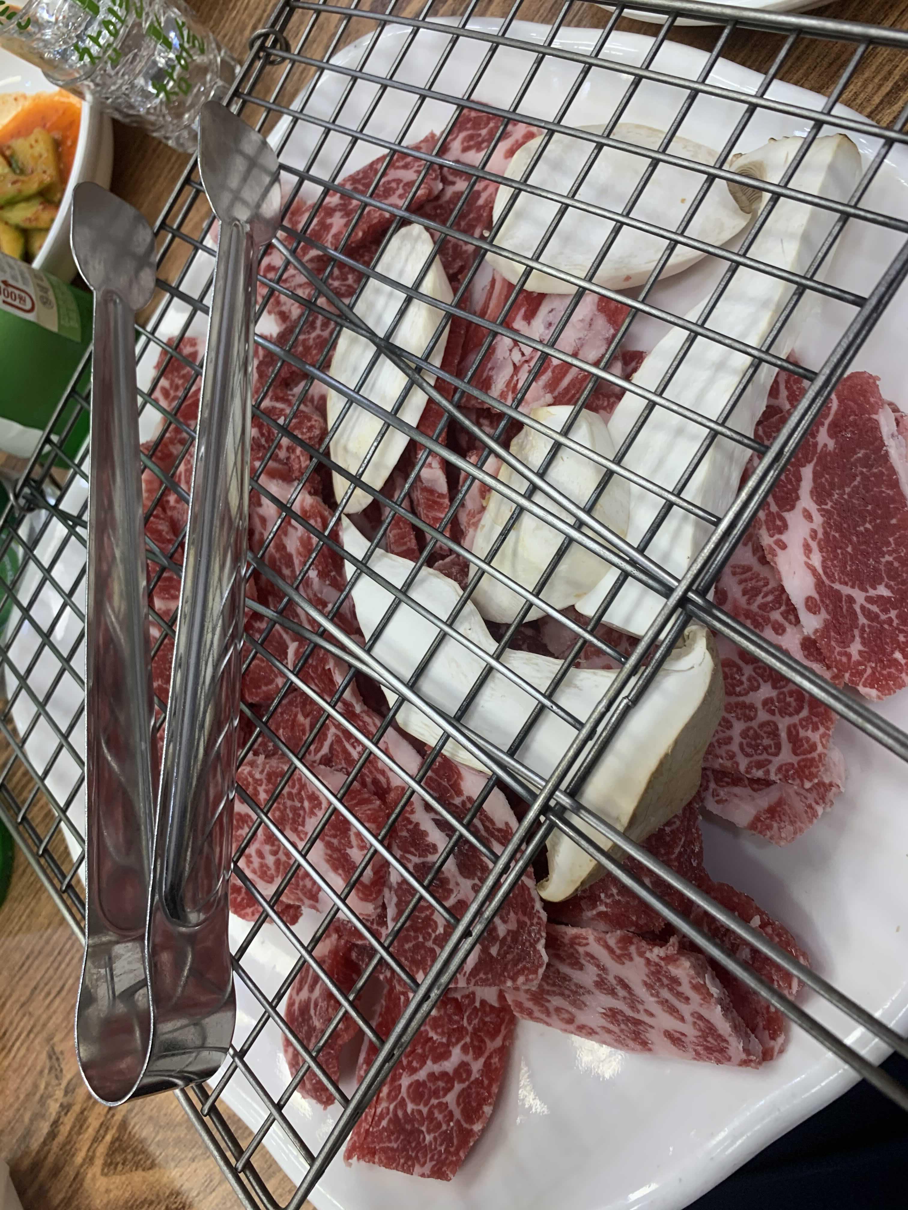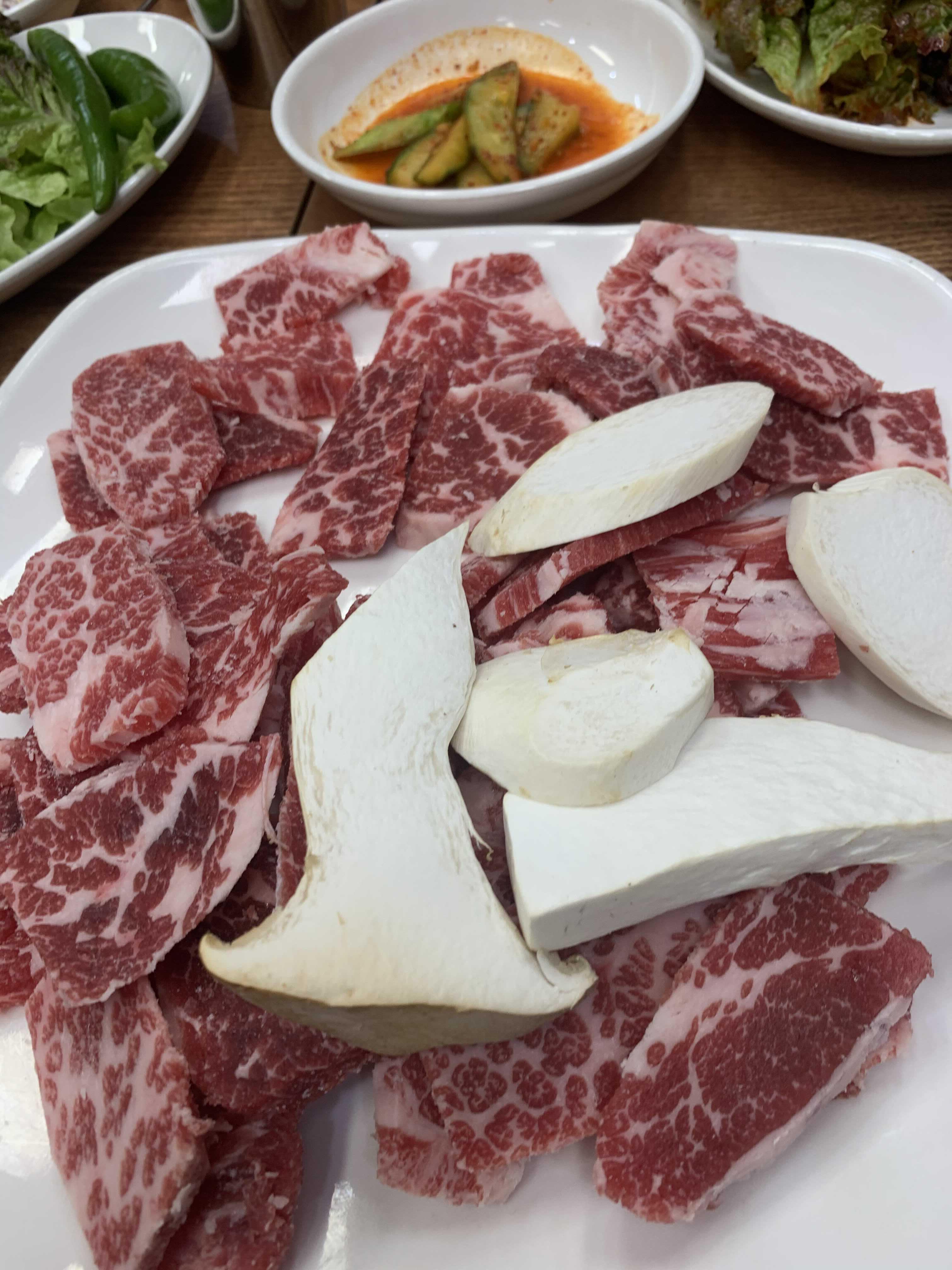 소고기는 한입에 먹기 좋을 사이즈로 잘라서 나오는 게 좋더군요. 덩어리로 나오는 등심!!! 큰 덩어리를 한 번에 구워서 첫 고기는 맛이 좋으나, 마지막 먹는 고기는 수분이 빠져 딱딱한 고기를 먹습니다. 하지만, 이런 식으로 고기가 한입 사이즈로 잘라 나오면, 먹을 수 있을 만큼만 구워서 바로 먹으니 맛이 좋을 수밖에 었더군요. 일본의 개인화로(고기 1~2점 올려서 구워 먹는)에서 먹으면 고기가 맛있는 이유가 바로 구워서 바로 입으로! 이 동선이 최적의 한우를 먹는 동선이죠!!ㅎㅎ
