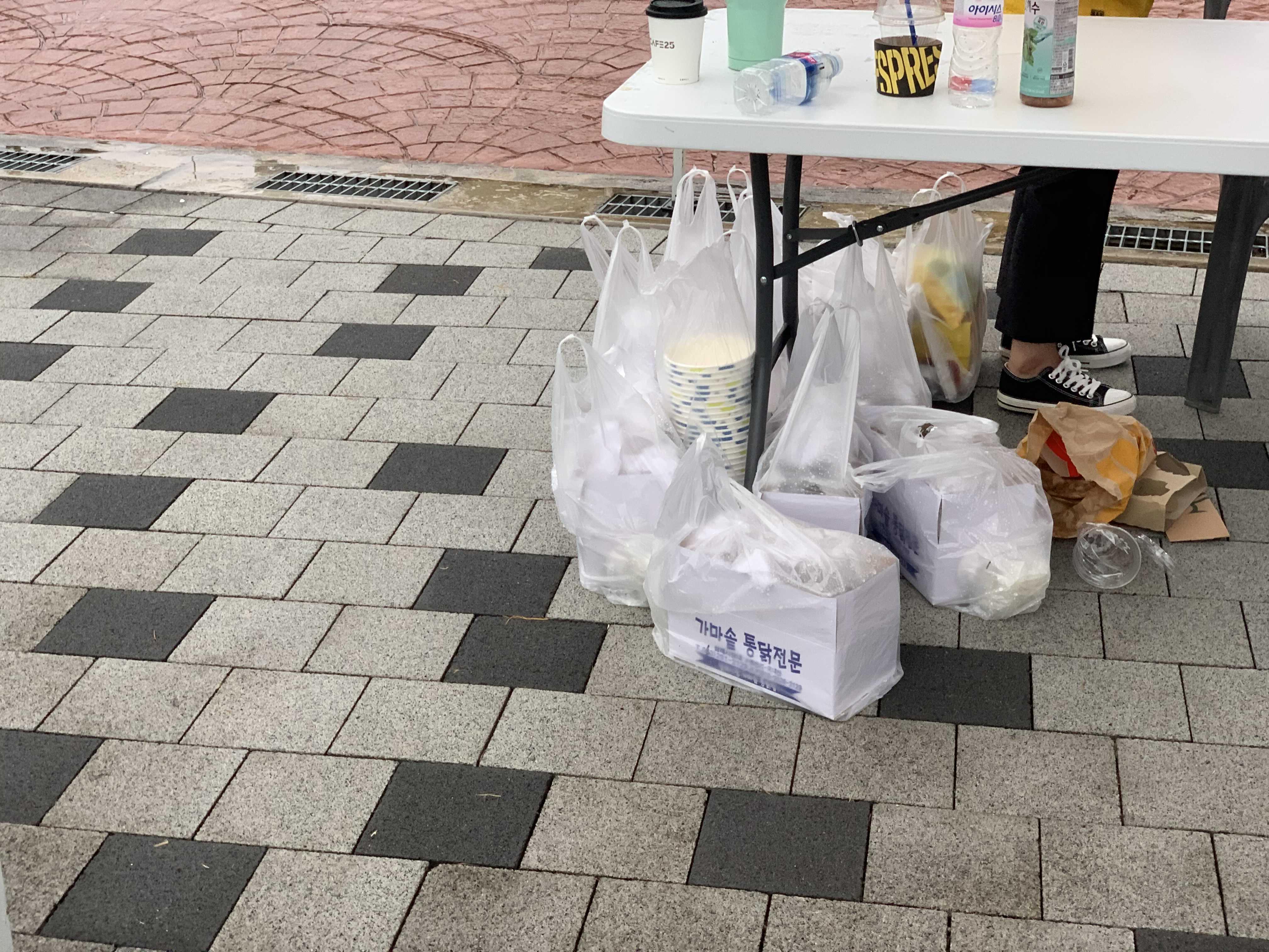 경기장을 나서며, 입장했던 장소를 지나가는데.... 경기장에 반입하려 했던 치킨이 눈에 들어오더군요. 코로나 19로 인해 경기장 음식물 반입이 안되는데... 사전에 인식하지 못한 분들이 있으신 거 같더군요.