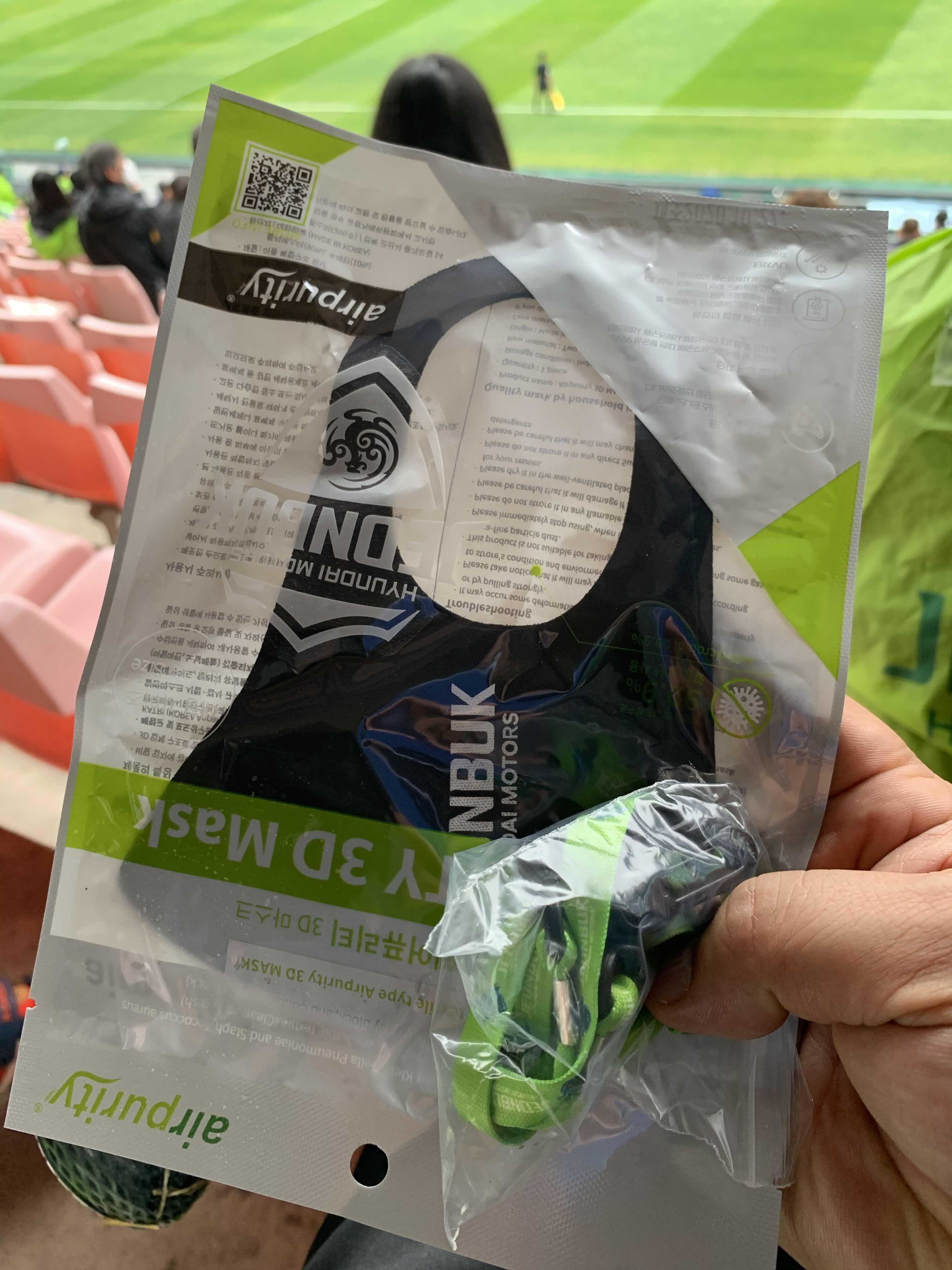 전주 월드컵경기장에서 직관하면..... 항상 기념품?을 나누어 주는데, 이번 경기에서는 마스크를 기념품으로 나누어 주더군요. 지난번에 나누어 주었던, 녹색 마스크도 좋았는데 이번에는 검정 마스크를 나누어 주시더군요. 땡큐! 전북 현대^^