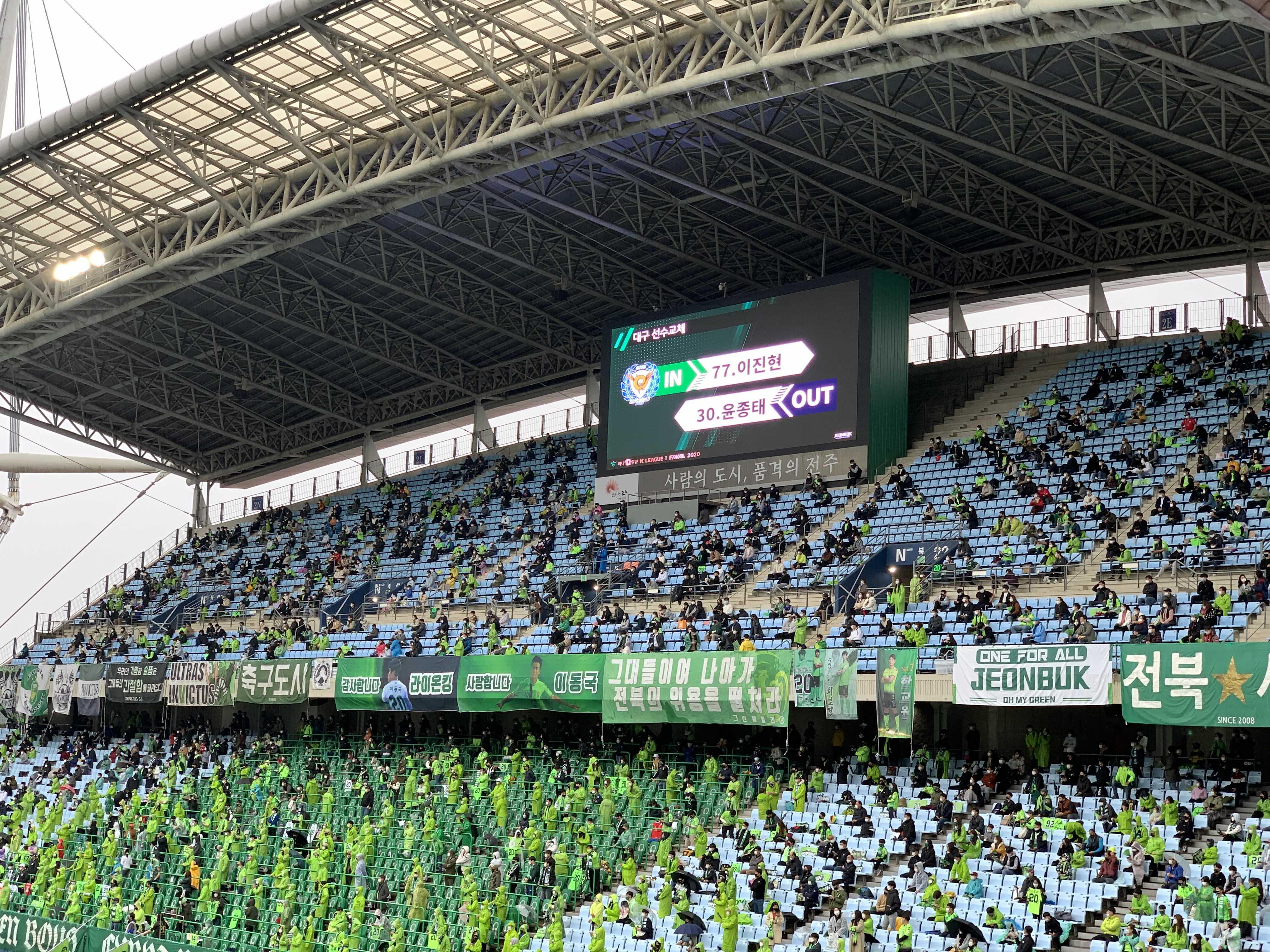 대구 FC 선수 교체로 공격이 좀 살아나는 듯하더니, 전북 현대의 선수 교체로 이번 경기의 멀티골 조규성 선수와 김보경 선수가 교체되었습니다. 그리고, 쿠니 모트 선수와 신형민 선수의 교체되어 전북 현대는 승리의 굳히기에 들어갔습니다.