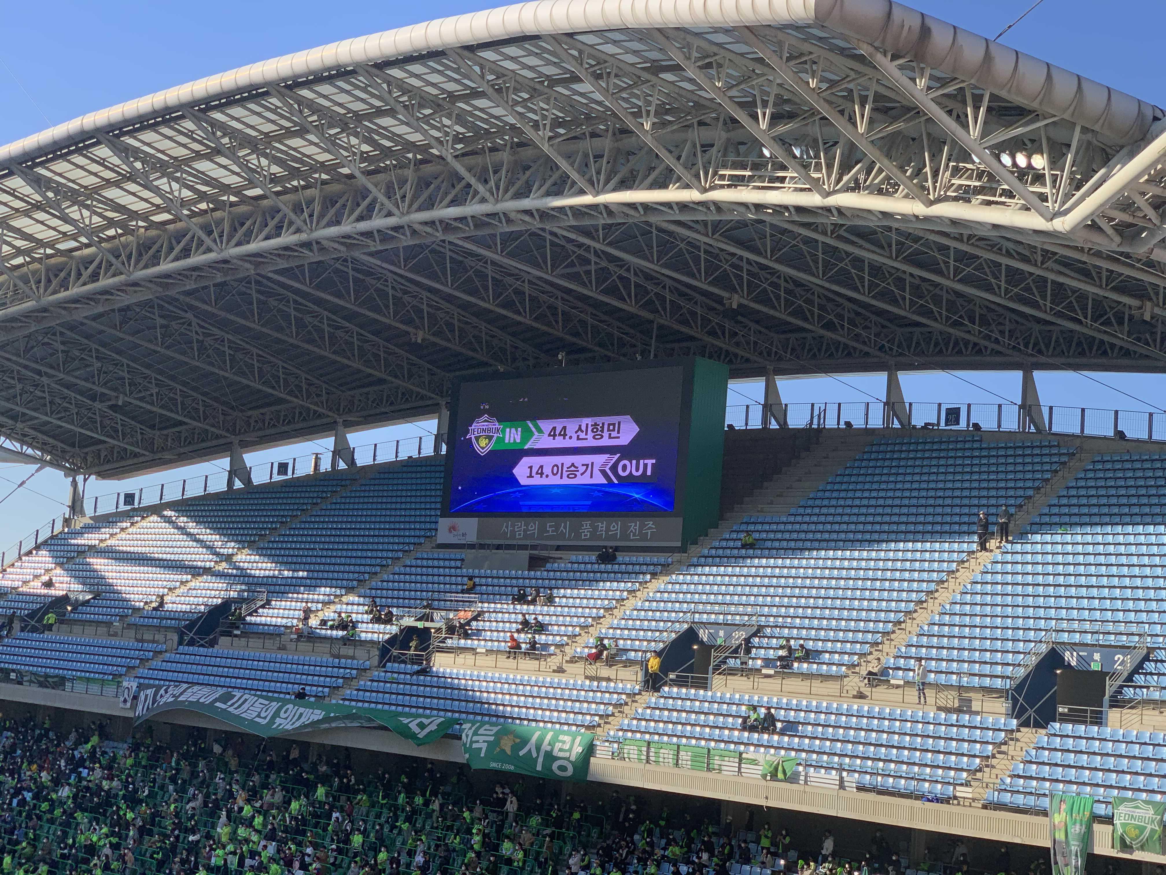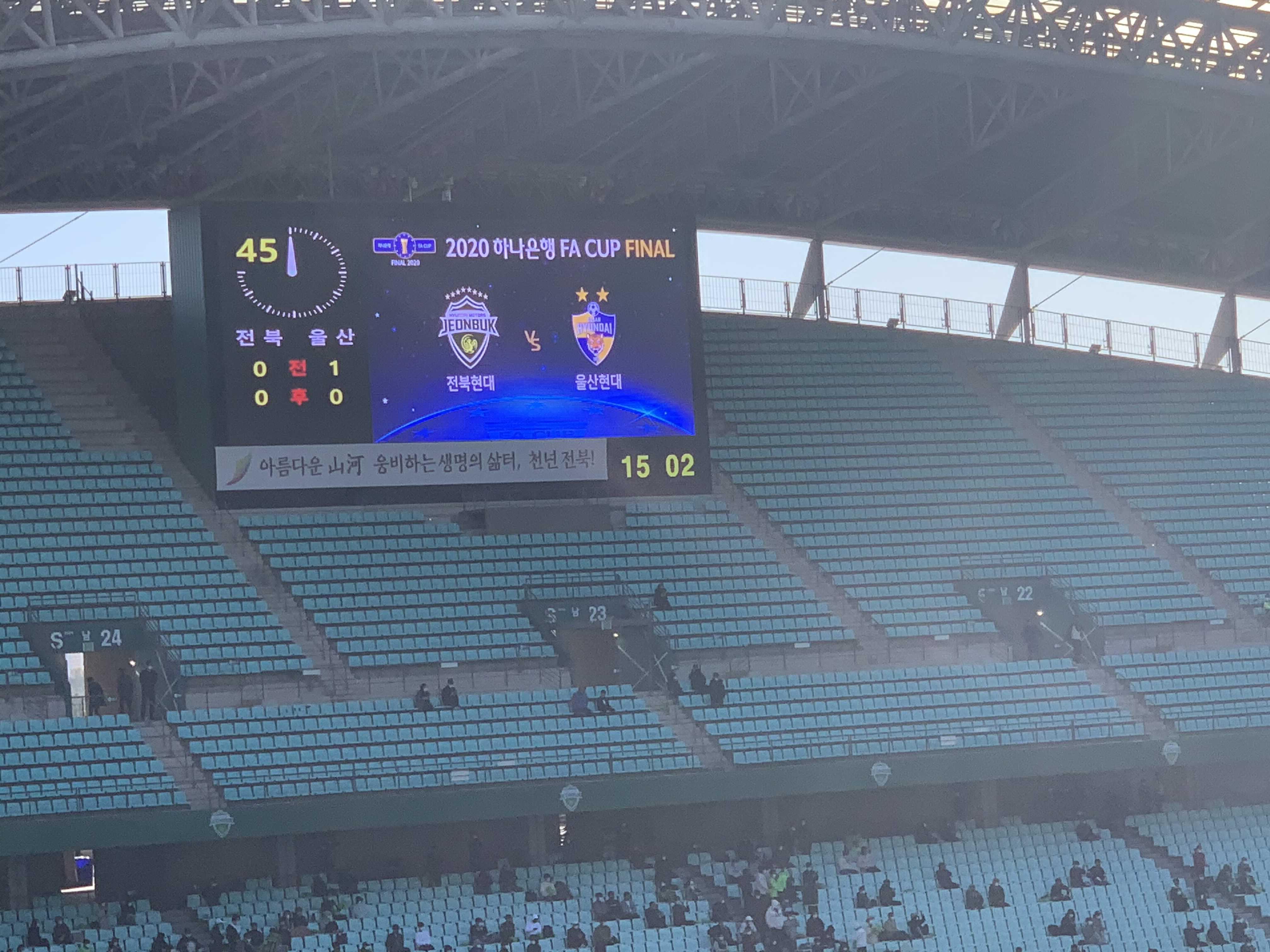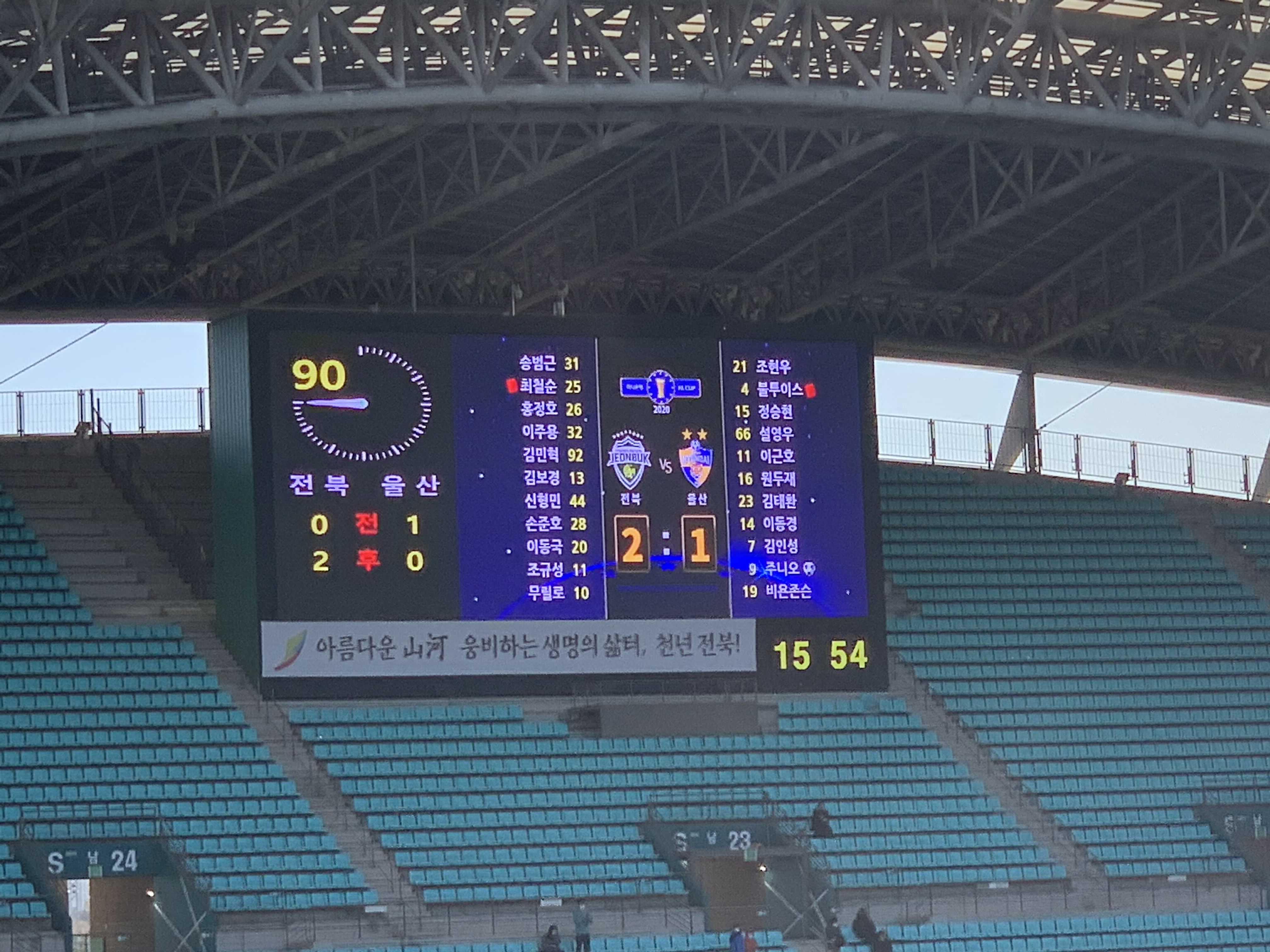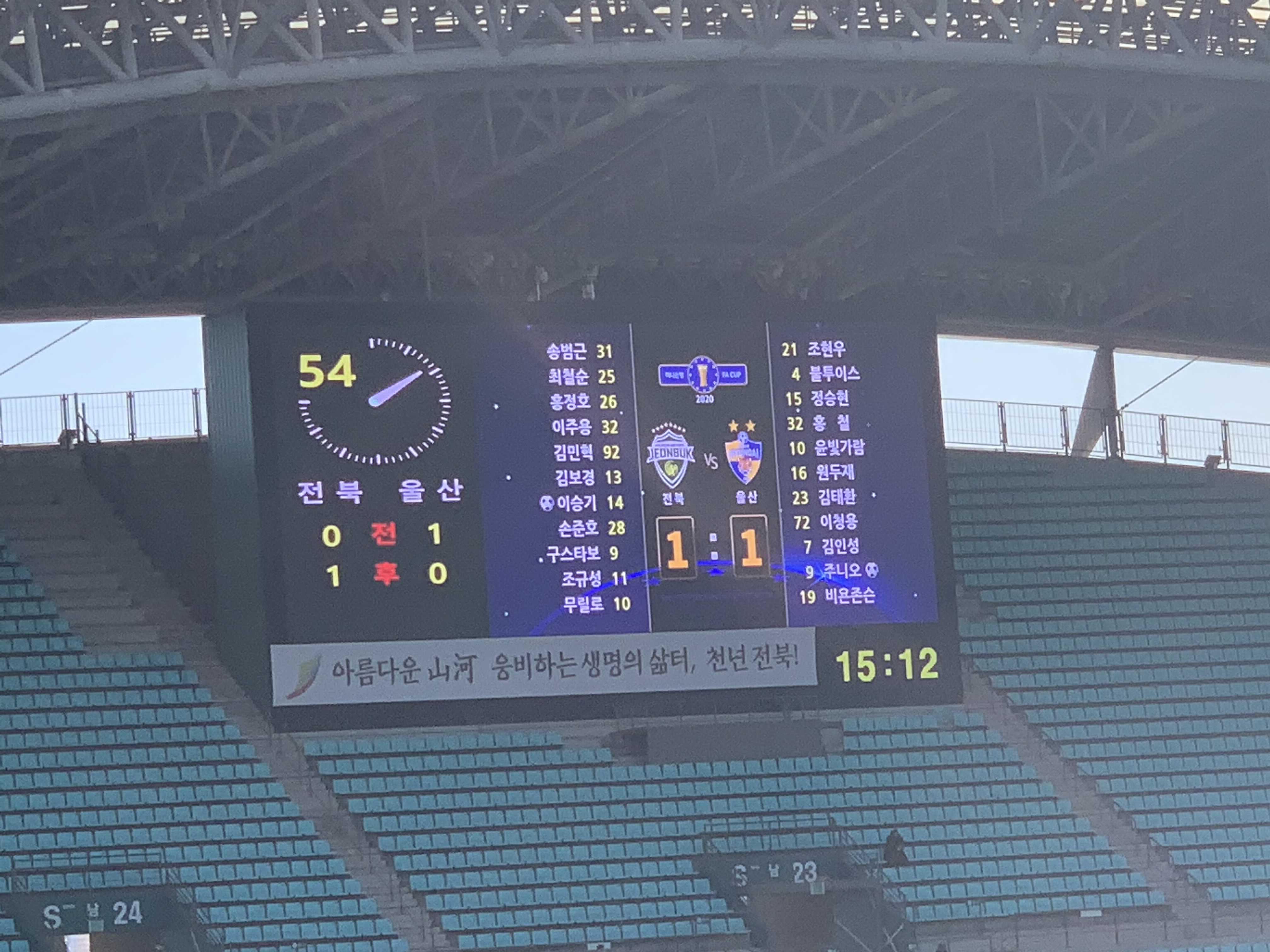 전반전은 울산 현대의 추가골이 나오지 않아 다행이라는 생각이...... 울산 현대! 평소와 다른 분위기의 경기력을 보여주더군요. 이번 경기에서도 하프타임 이벤트로 코나 경품 추첨이 진행되더군요. 최근 3경기 연속으로 코나 경품 추첨!!! 및 그 외 이벤트 상품을 추첨하더군요. 후반전 선수 입장.... 전북 현대 한 명의 선수가 좌측으로 가더군요(경기 시작 위치를 착각한 듯.... 평소와 다른 쪽에서 시작하니;;;)