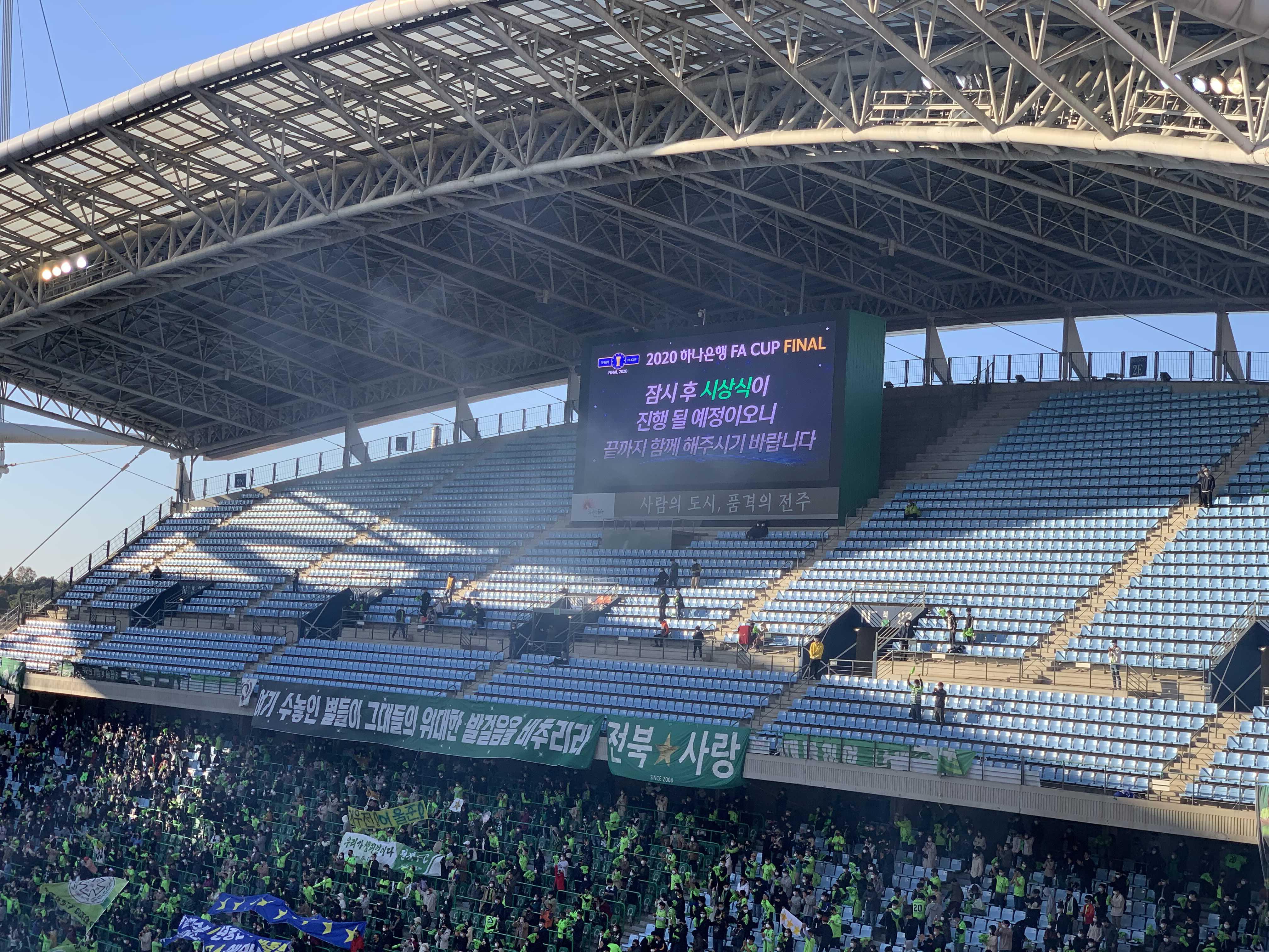경기 후 우승 시상식이 진행되었고, FA컵 득정왕은 전북 현대 쿠스타보, MVP는 이승기 선수가 수상했습니다. 4년 동안 축구 홈경기 직관하며 FA컵 경기는 처음으로 직관하는데(주로 주말에 진행되는 프로리그만 직관해서;;;) 첫 직관에서 우승 시상식도 보게 되었네요. 날씨가 추운 관계로 시상식은 집에서 TV로 시청하기로 하고 집으로 향했네요.
