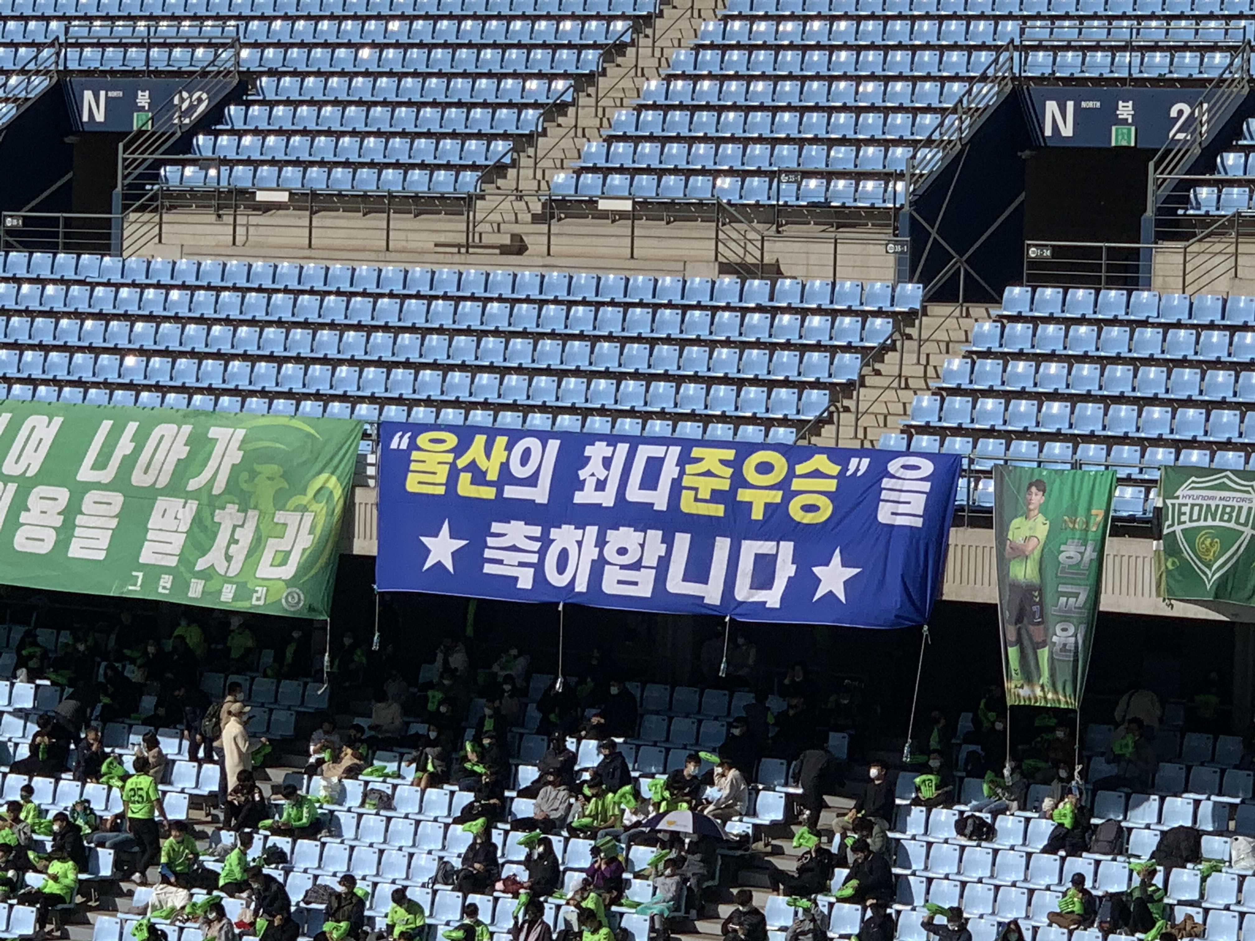 서포터스에는 평소에 보이는 플래카드와 이번 경기를 위해 준비한 플래카드가 눈에 들어오더군요. "울산의 최다 준우승을 축하합니다." 축하는 축하지만......