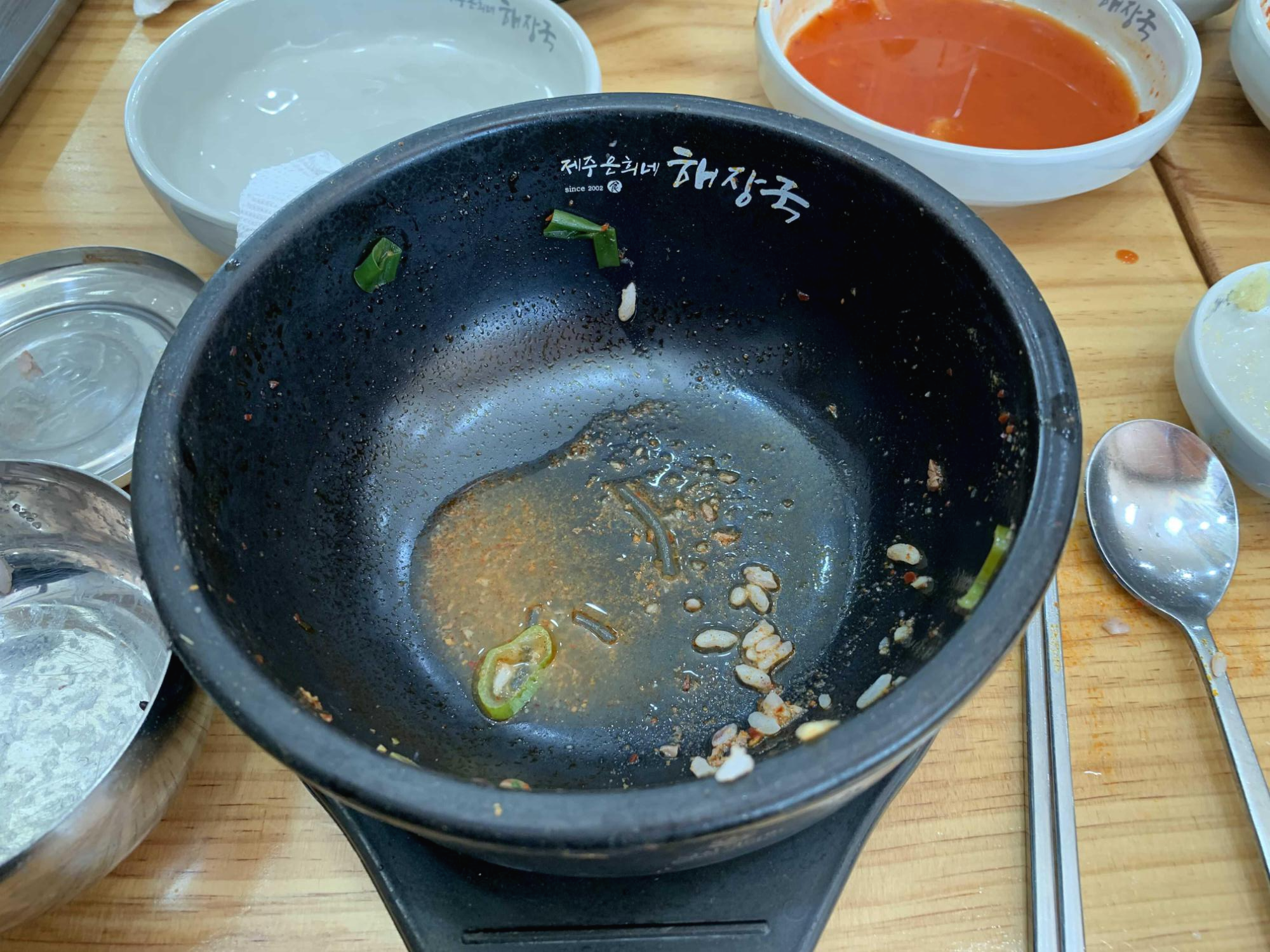 해장 국물이 괜찮아 바로 밥을 말아 해장국 한 그릇 뚝딱 해치워 버렸습니다. 마지막 남김없이 뚝딱! 아쉬운 점이라면 간 마늘을 넣지 말고 드시기를 권해드리고 싶습니다. 마늘을 넣더라고 마늘즙은 최대한 안 들어가게.... 마늘장아찌 냄새가; 마늘만 안 넣었더라면 완벽한 한 그릇의 해장국이지 않을까 생각해 봅니다.
