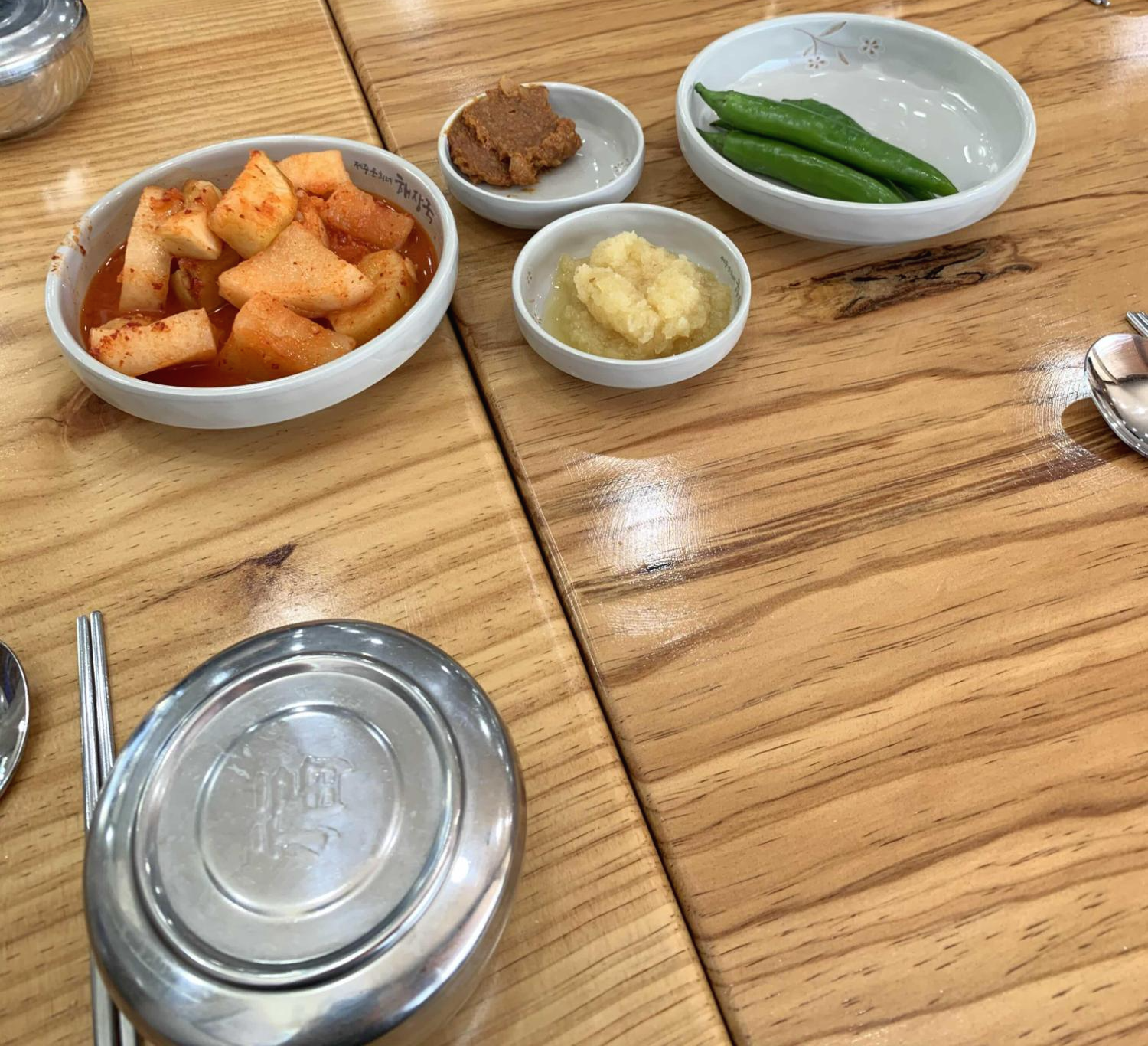 해장국은 6~8천 원 정도인데, 이곳은 가격이 9,000원으로 약간 비싸게 느껴지더군요. 해장국을 주문하고 나온 깍두기와 간 마늘이 나오더군요. 해장국 식당에서 흔히 안 보이는 간 마늘! 이 간 마늘이 신의 한 수?를 해줄 것 같은 느낌이 들더군요.