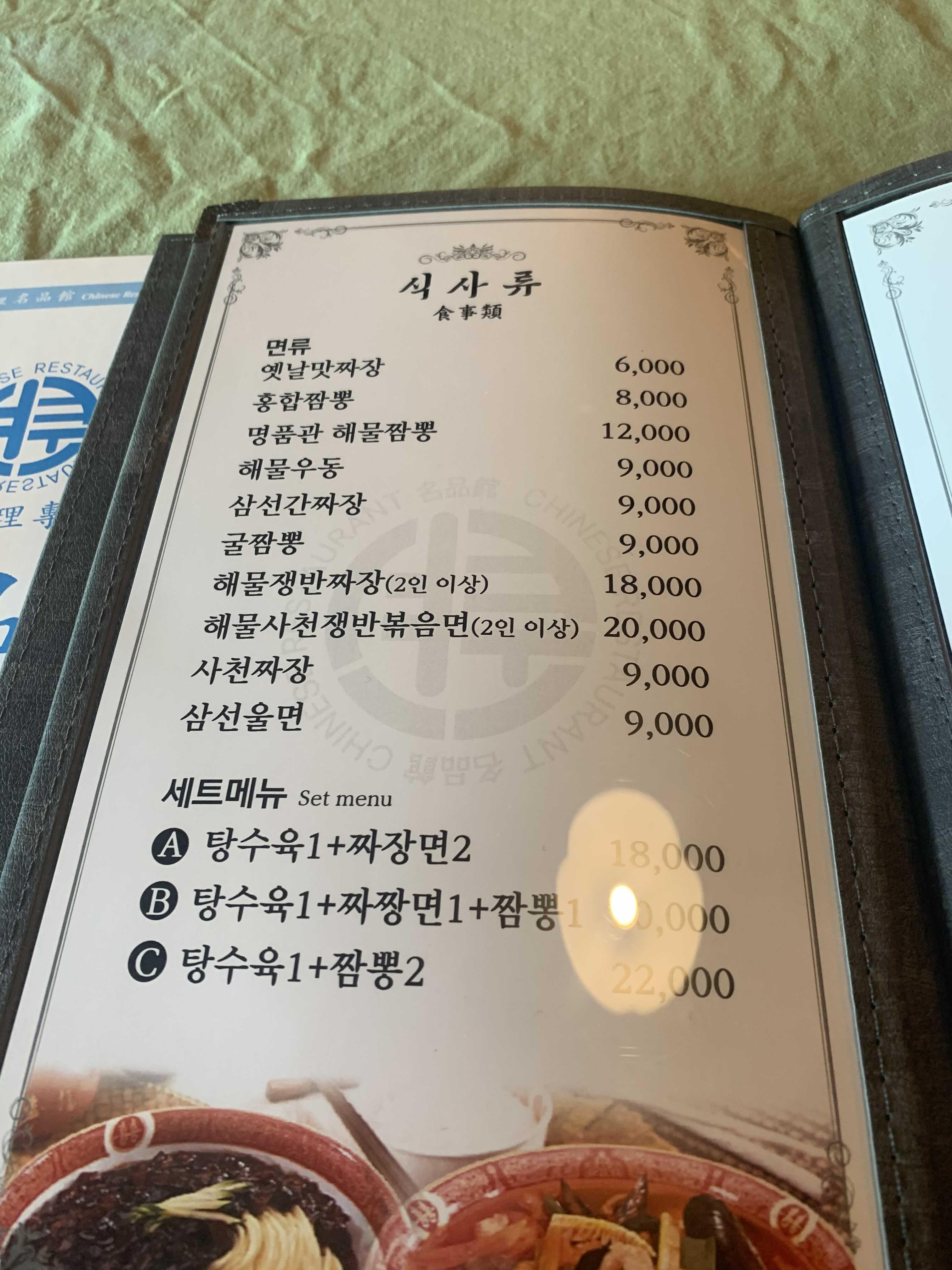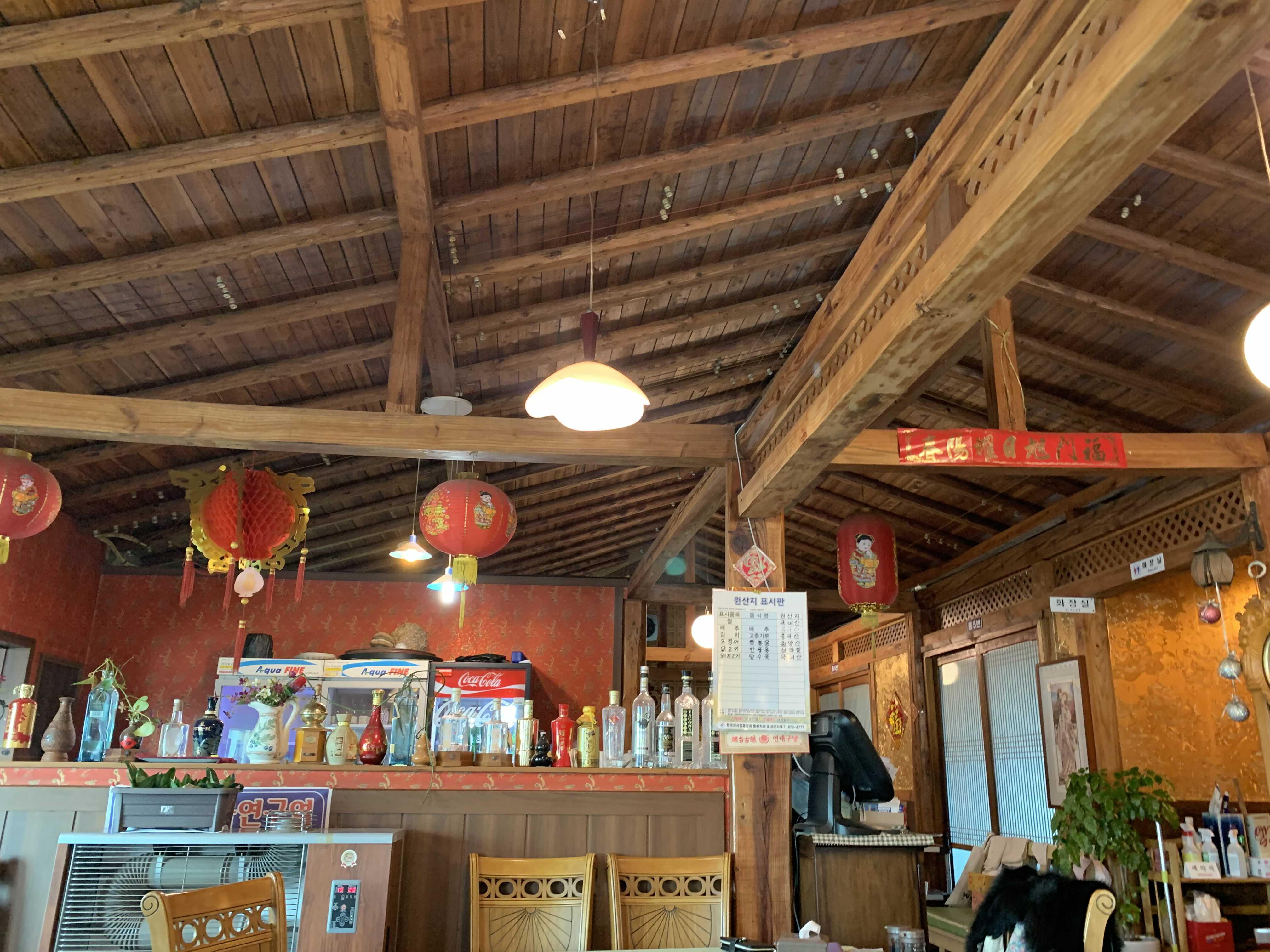 코로나 19 영향인지 약간 이른 점심시간인지는 모르겠으나 홀 내부에는 손님이 많이 없더군요. 메뉴판을 스캔해주고 손짜장을 주문하려다 얼큰한 국물이 당겨서 짬뽕을 주문해 보았습니다. 건물 지붕은 빨간색의 목재로 되어있고, 내부 또한 나무 쪽 판으로 마감이 되어 있어서..... 오래된 산장? 카페의 느낌의 분위기를 풍겼네요.