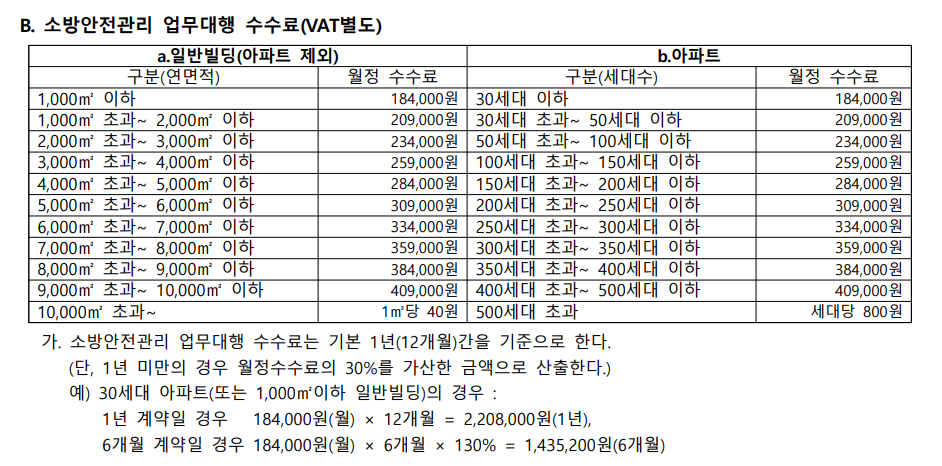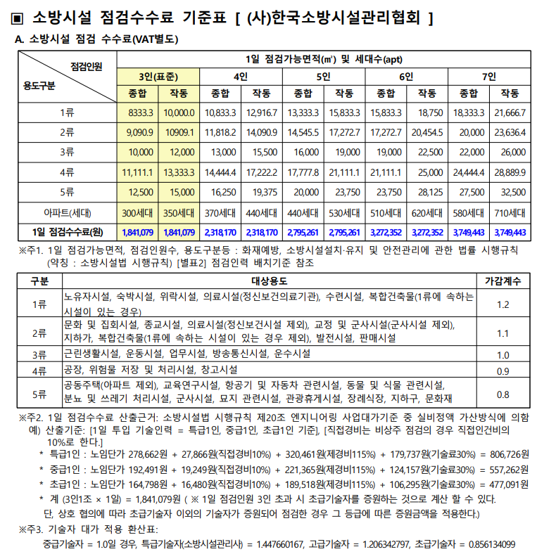 소방시설 안전점검(종합, 작동) 및 소방안전관리 업무대행 대가 산출 방법 중 가장 간단한 방법은 (사)한국소방시설관리협회에서 재공 하는 수수료 기준표를 참고하여 대가를 산정하는 방법입니다. 일반적으로 많이 사용하는 방법이기는 하나.... 시설관리를 좀 한다는? 원가절감이 필요한 기관?이나 정확이 대가를 산정하고 싶다면 2번을 참고 바랍니다.