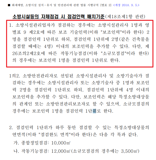 소방시설 법 시행규칙 별표 2(점검인력 배치기준)에 서술되어 있습니다. 해당 점검인력의 경우 소방시설관리사 1명에 보조 기술인력 2명인 점검인력 1 단위로 정의하고 있습니다.