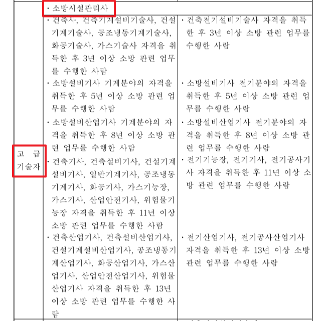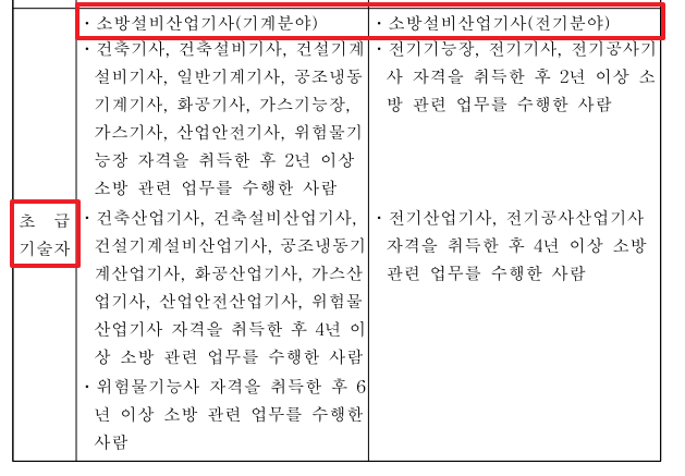 소방시설 법 시행령 별표 9 및 소방시설 공사업법 시행규칙 별표 4의 2에는 소방기술자의 기준이 서술되어 있습니다. 해당 자료에 따르면 소방시설관리사는 "고급기술자", 보조 기술인력은 "초급기술자"로 되어있습니다.