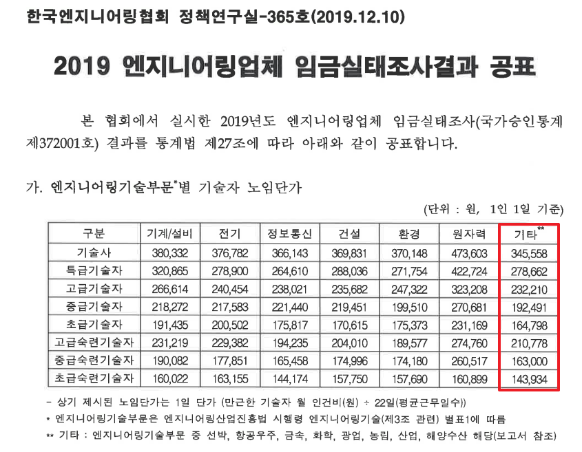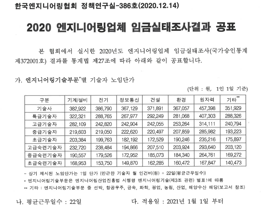 * 직접인건비의 경우 1번 2번 비교를 위해 "2019 엔지니어링업체 임금실태조사 결과 공표" 기준으로 작성하였습니다. 현재 2020년도 자료가 발표되었습니다.(해당 자료는 아래 참조)