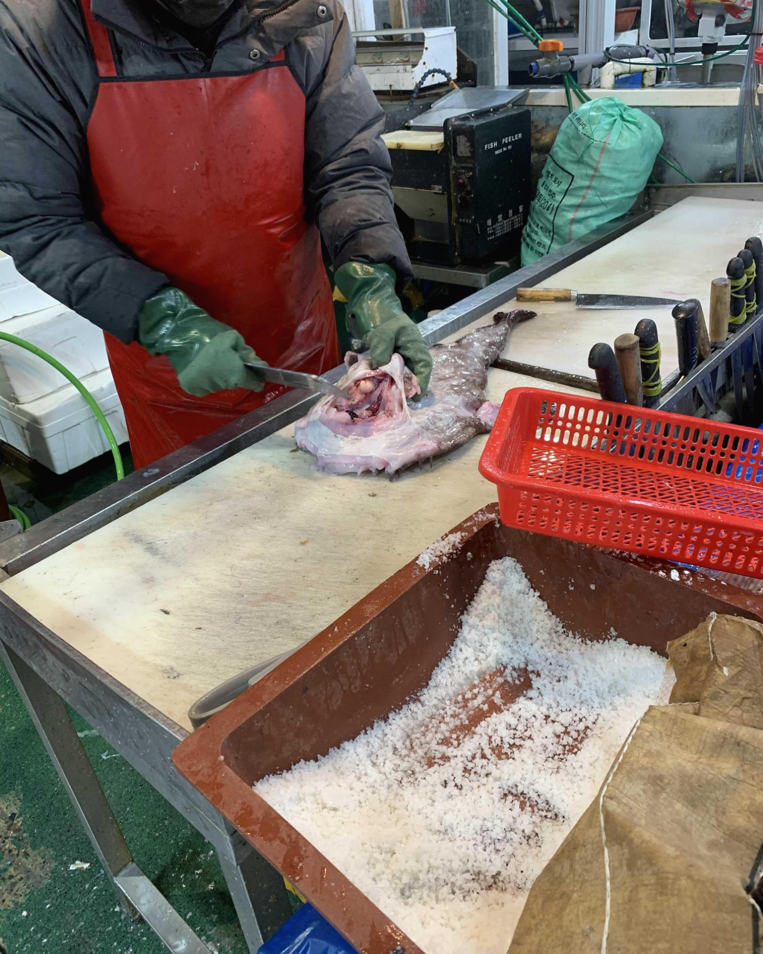 나름 싱싱해 보이는 아귀 3.5만 원 한 마리 구입하고 반절은 아귀찜, 반절은 아귀탕으로 사용하려고 반절씩 포장했습니다. 포장하며 탕에 들어갈 재료도 담아달라니... 서비스로 미더덕, 조개, 홍합을 넉넉히 담아주시더군요. 아귀 손질하는 모습을 지켜보니 버려지는 부분이 거의 없더군요.