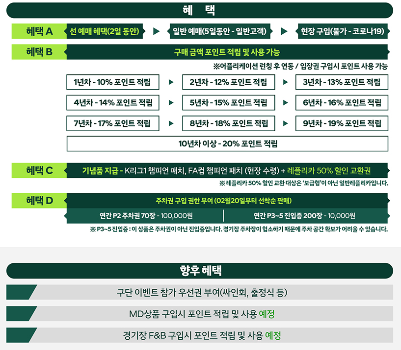 2021년도 전북 현대는 시즌권이 아닌 새로운 티켓?을 판매하고 있더군요. 멤버십 회원 모집을 개막전 티켓을 구매하며 알게 되었네요. 올해 도입되는 전북 현대 모터스 FC 멤버십은 시즌권의 개념? 보다는 선불 티켓이라고 보이더군요. 정해진 멤버십을 구입하고 티켓을 선 구매 기회가 주어지는 게 가장 큰 특징이더군요.