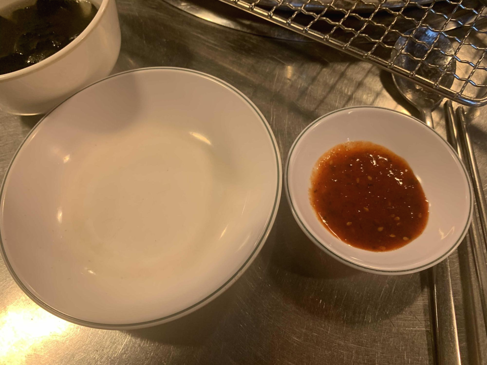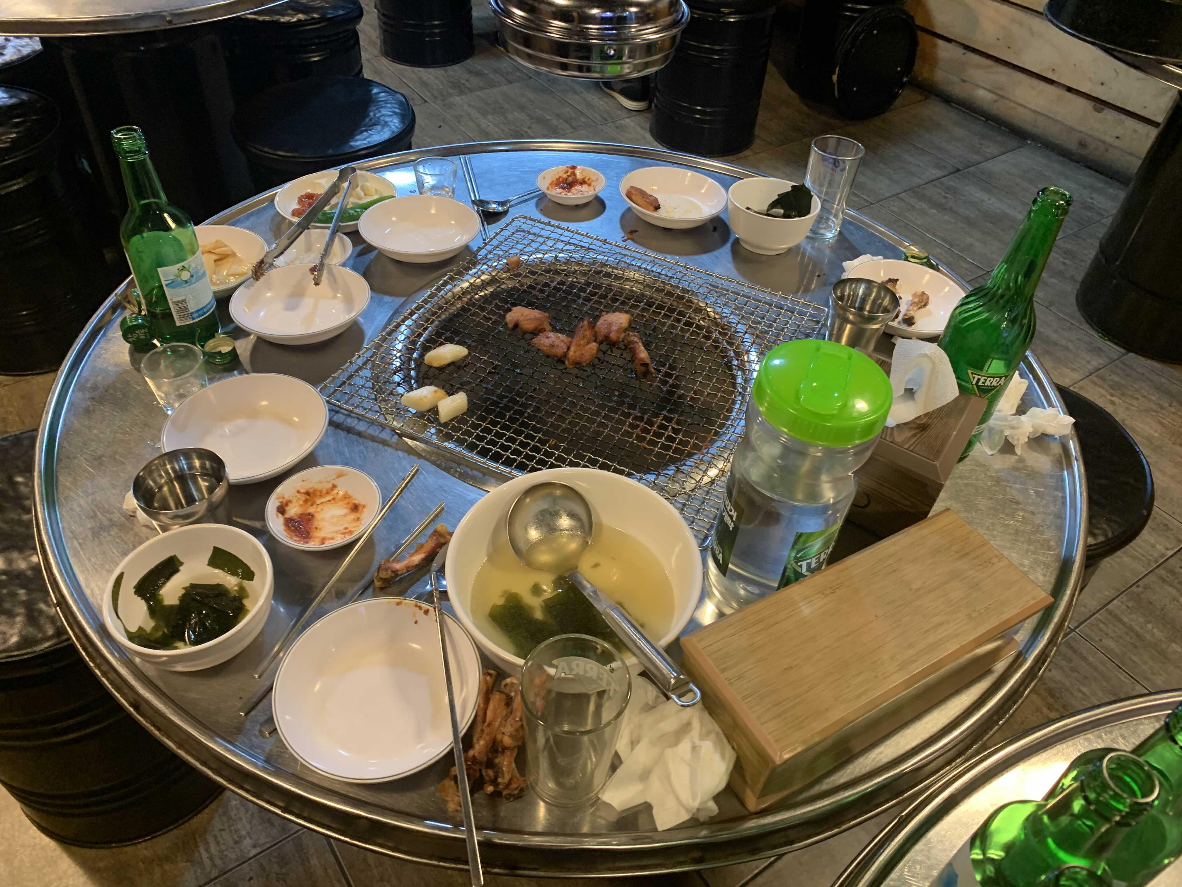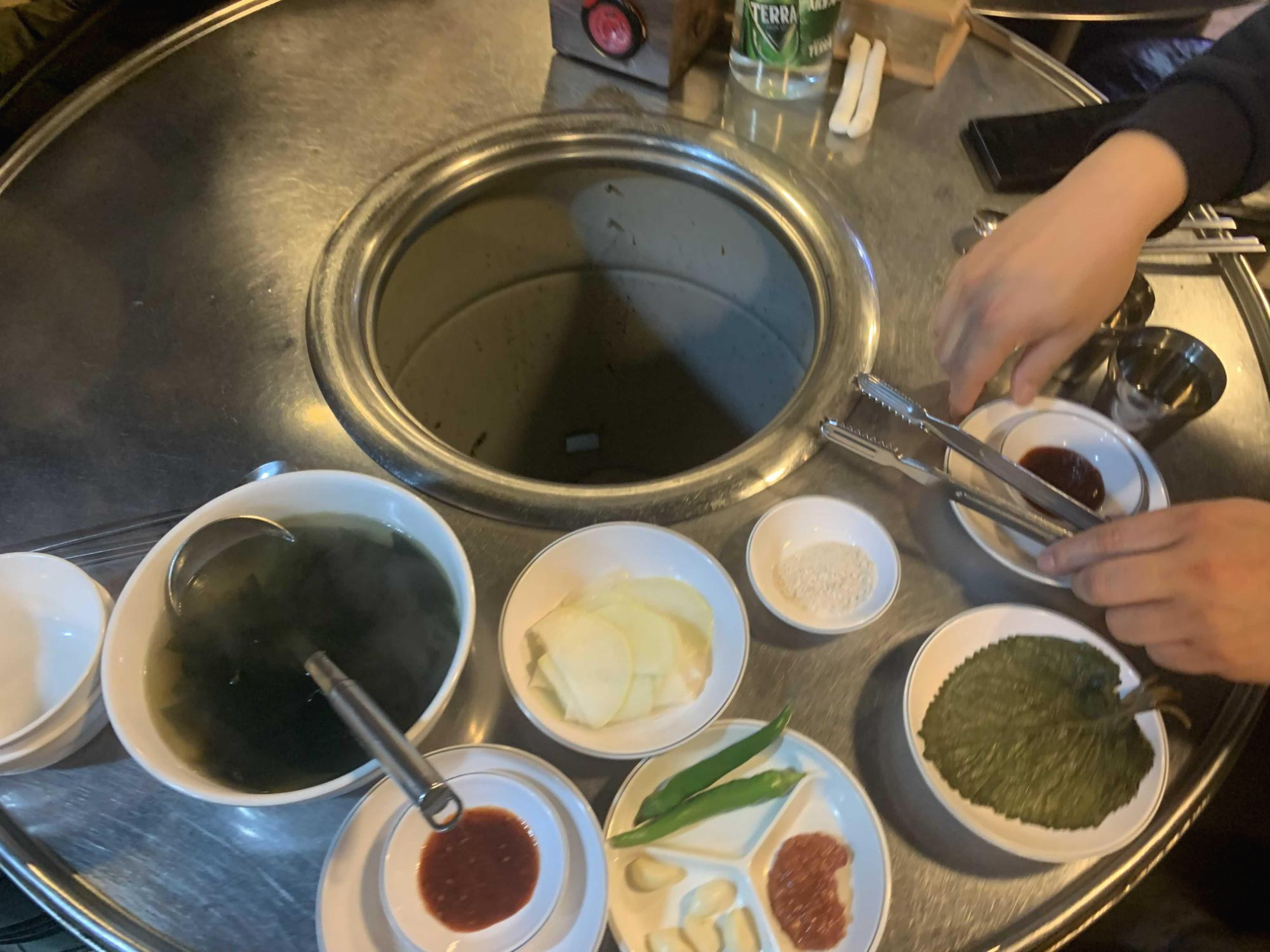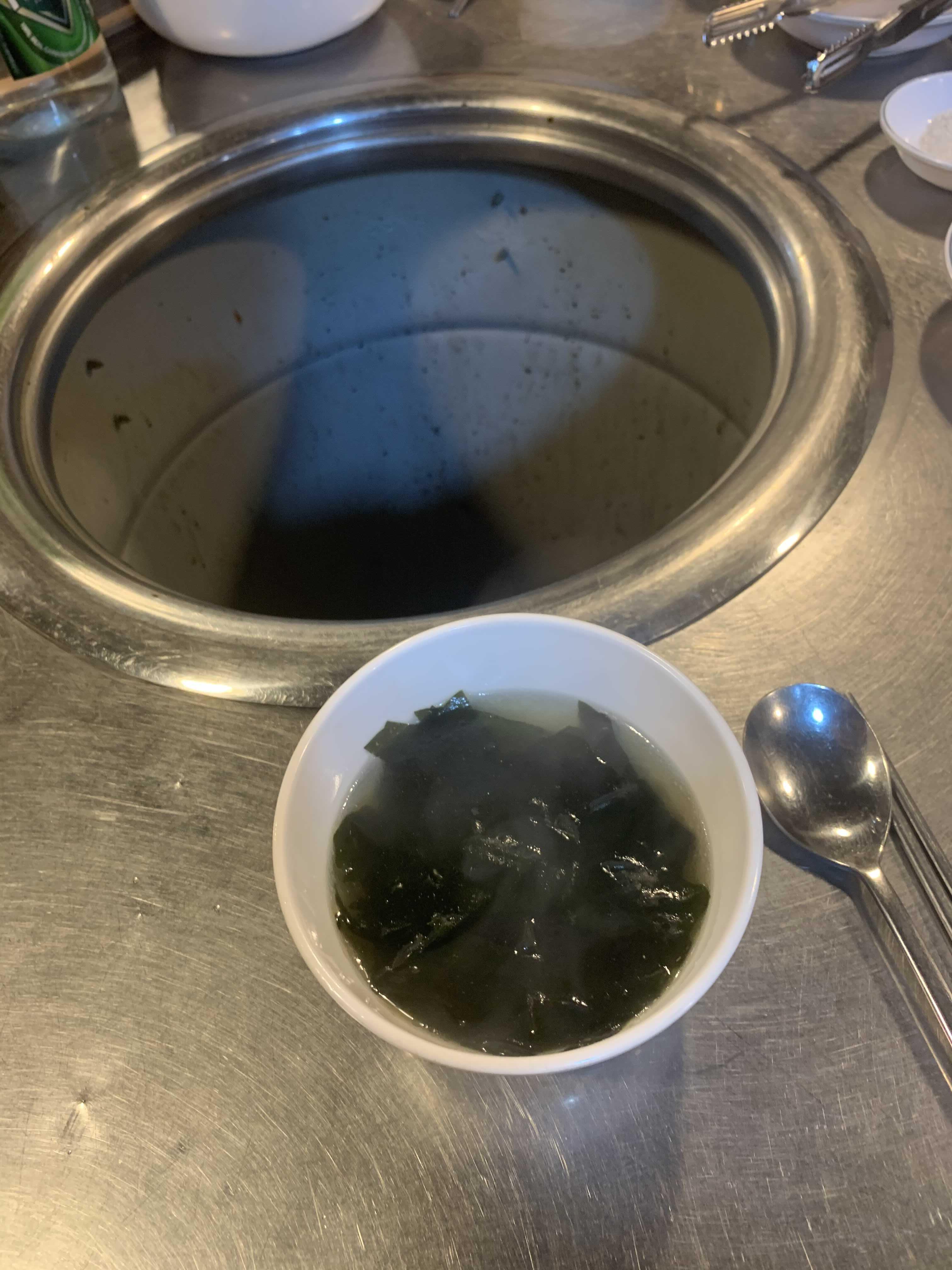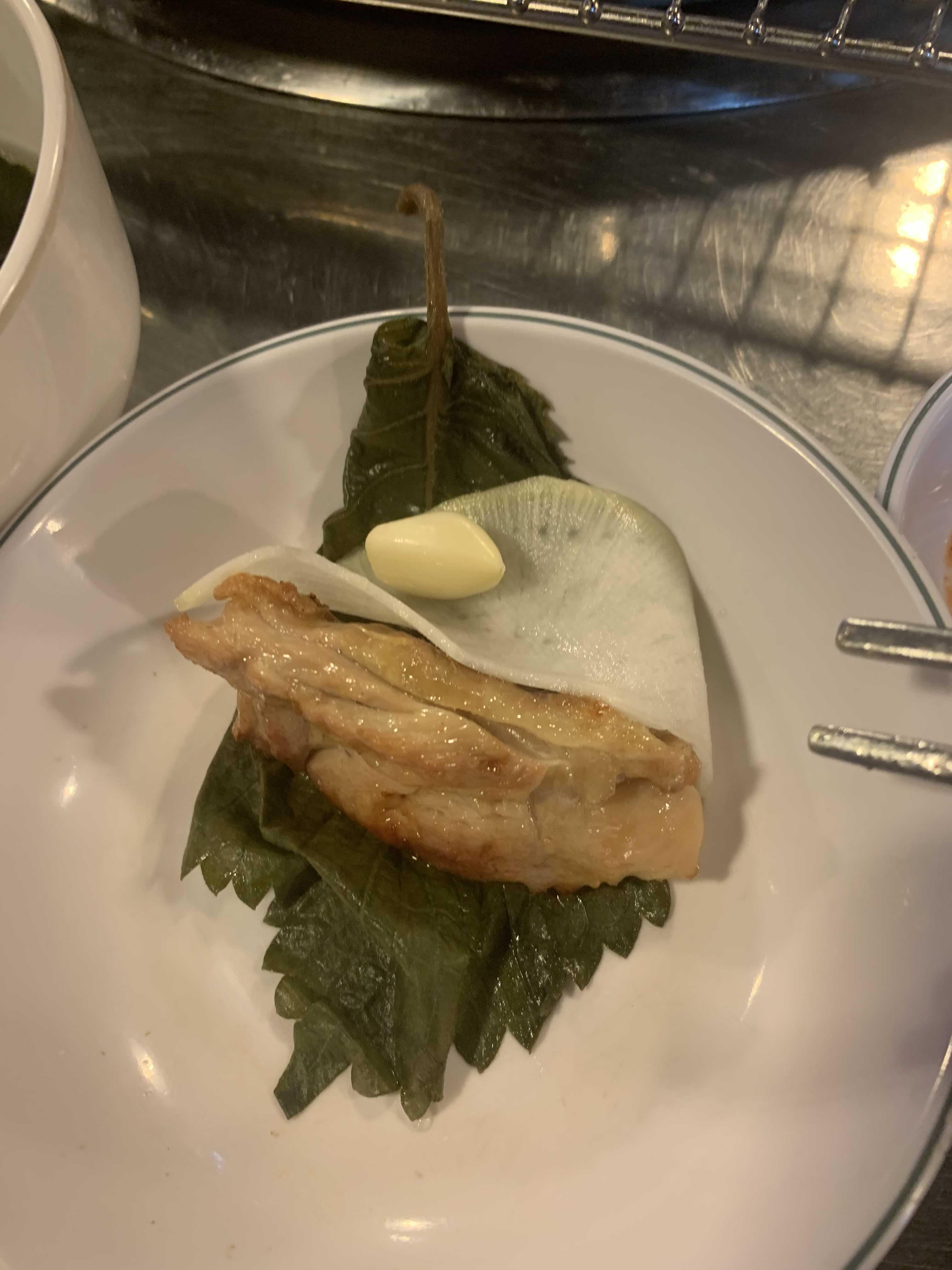 기본 세팅으로 미역국, 무쌈, 깻잎 저림과 양념장이 나오더군요. 이중 미역국이!!! 고기에는 역시 국물이 하나 나와야 구색이 갖추어 지죠^^ 미역국을 먹다 보니 주문한 소금 닭갈비가 나오더군요.