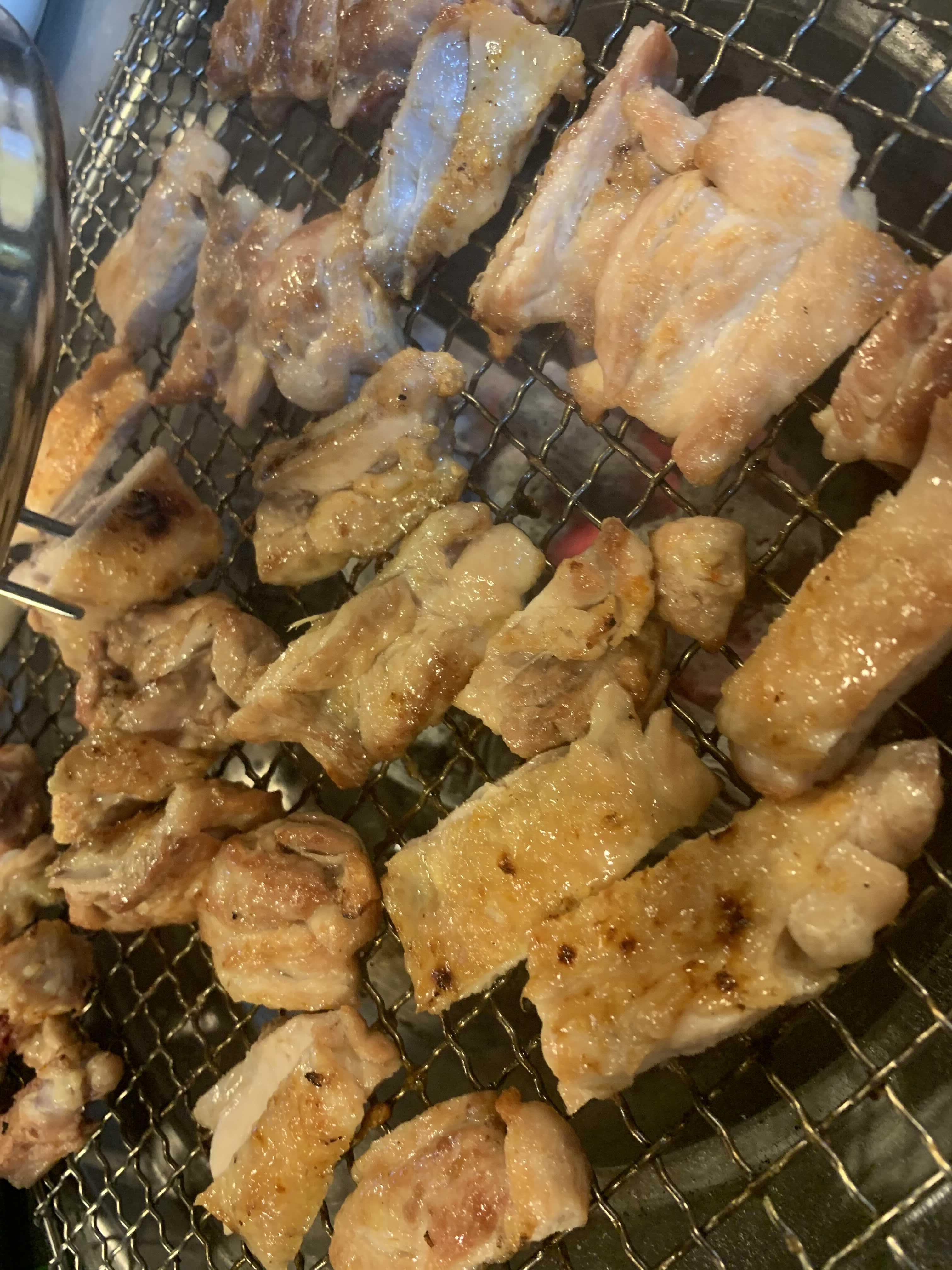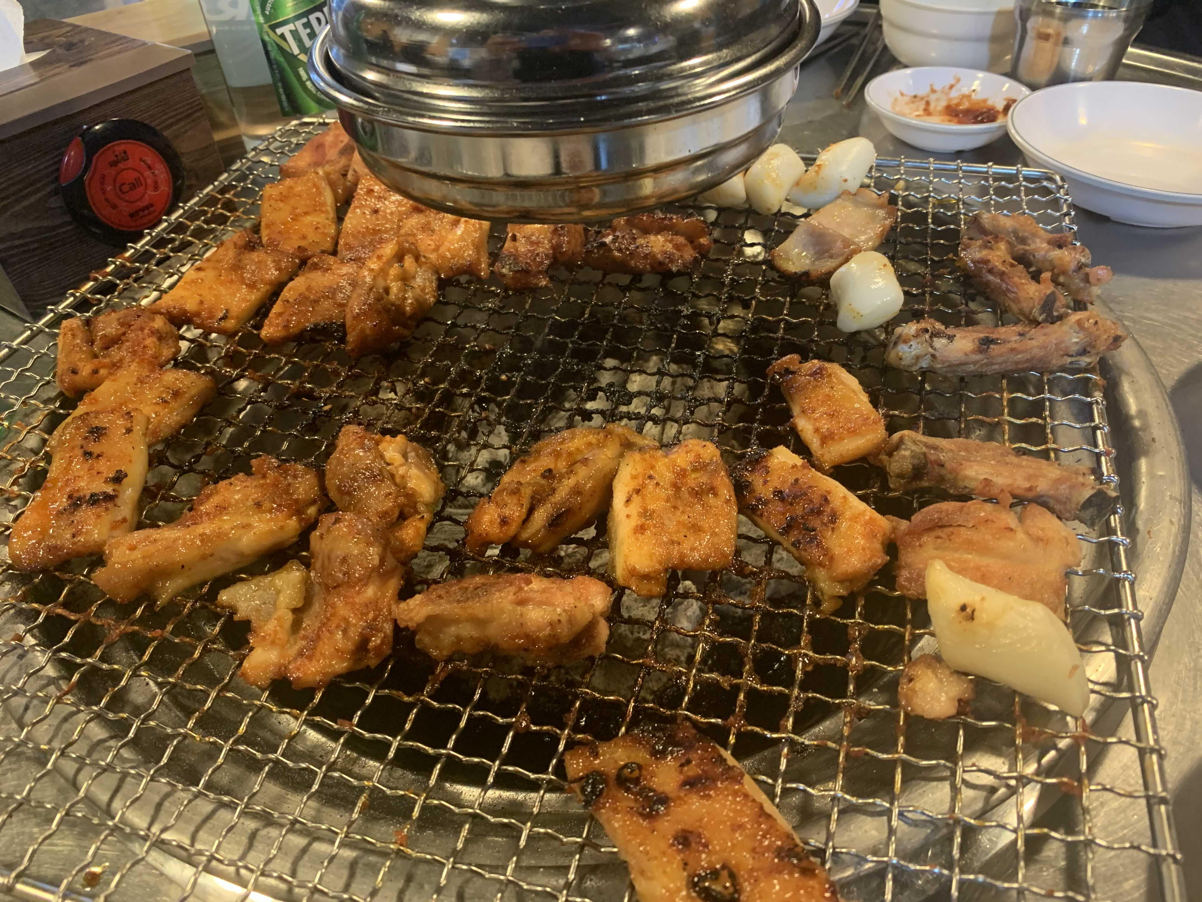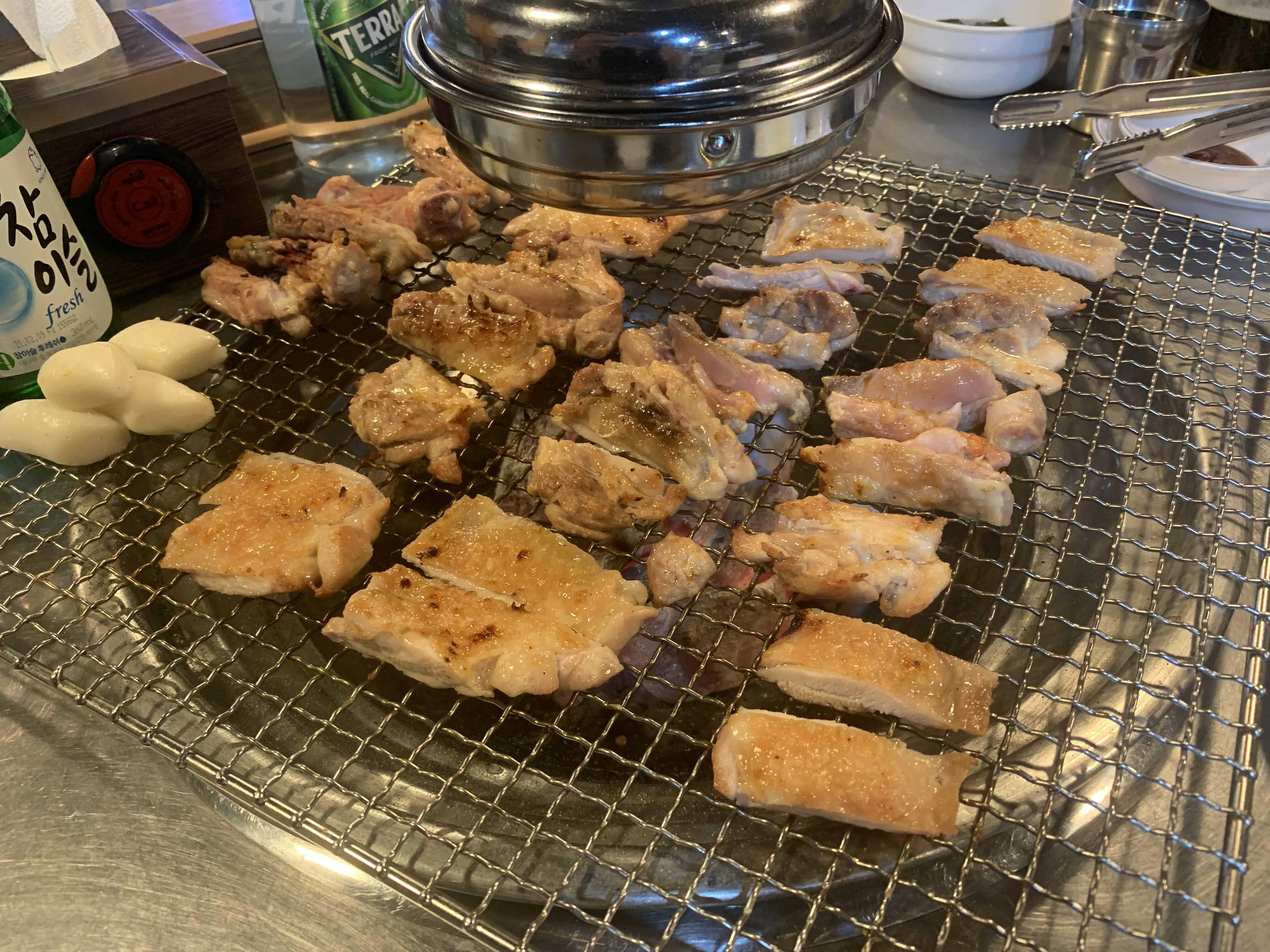 닭갈비는 초벌구이로 나와서, 바로 먹을 수는 없고 어느 정도 익혀서 먹어야 하더군요. 평소 닭갈비는 철판 닭갈비만 먹었는데... 그 철판 닭갈비는 이것저것 들어가.... 닭을 먹는 건지 닭에 곁들여진 "사리"를 먹는지 모를 정도로 사리가 많이 나오는데... 이건 닭만 나오니 닭고기 고유의 맛을 느끼겠더군요.