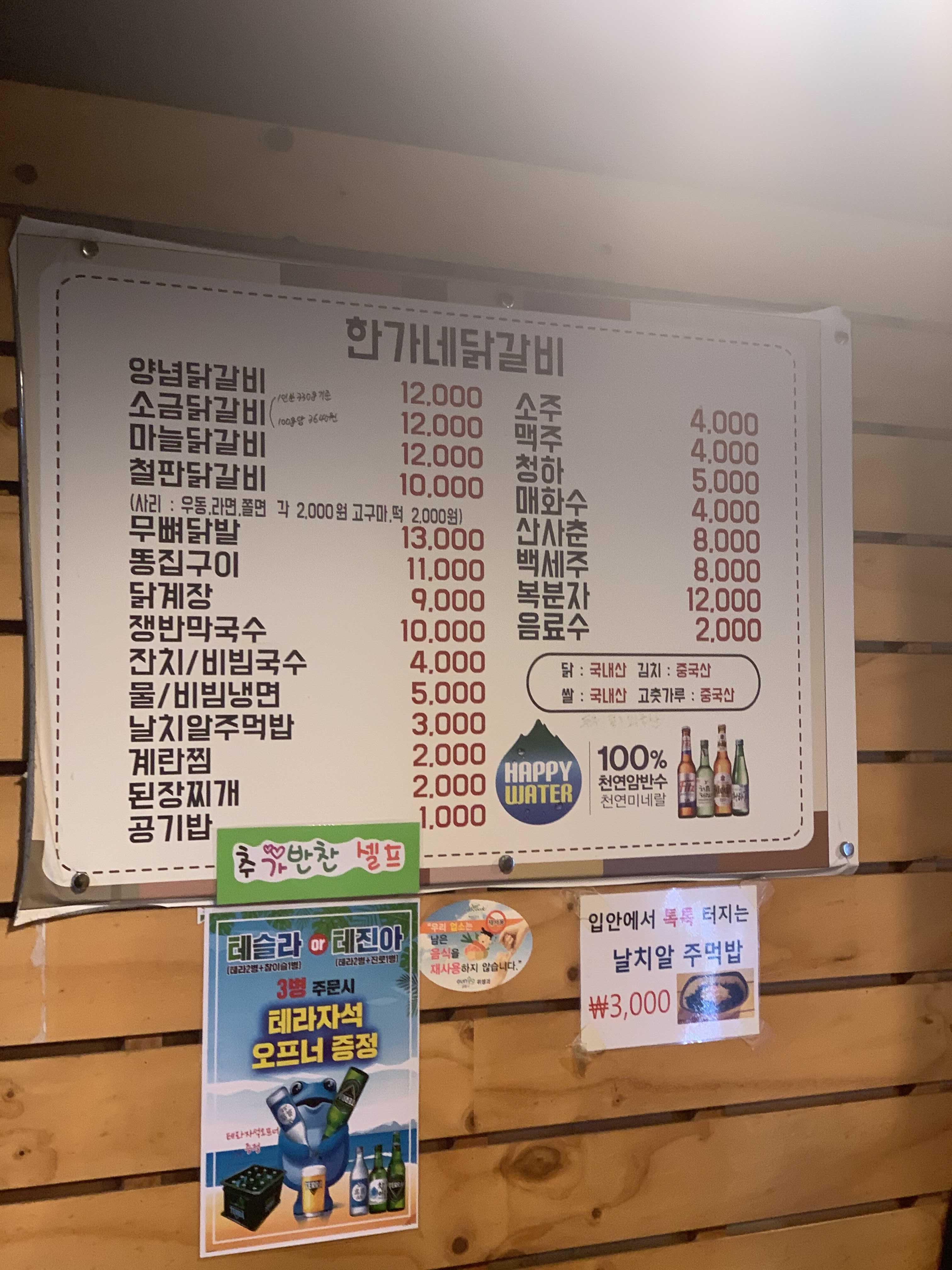 리뷰를 작성하며 메뉴판을 보니... 똥집이 보이네요. 그때 추가로 양념 닭갈비가 아닌 똥집을 주문했었으면..... 소금 닭갈비-> 똥집 구이-> 후식이 좋을 듯싶습니다. 처음이라 닭갈비만 먹어서... 닭갈비가 맛이 있기는 한데... 한 번에 많이 먹다 보니 좀 물리는 느낌이 들어서.. 음식은 역시 고루고루 섭취가 최고.ㅎㅎ