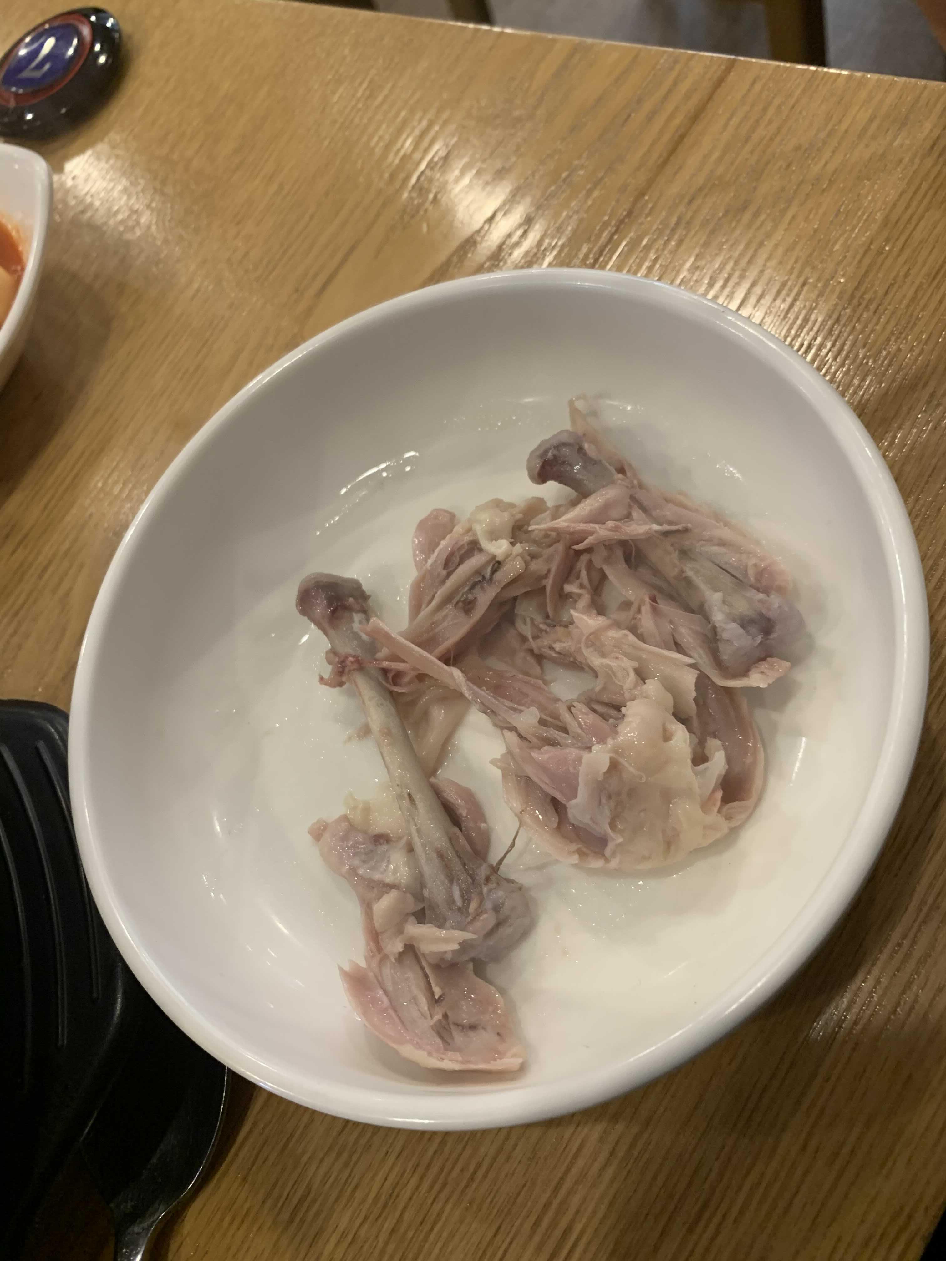 삼계탕이 나와 우선 국물부터 먹어보니 먹기 좋게 간이 딱 맞추어졌더군요. 바로 국물을 몇 번 먹고서 바로 고기를 뜯기? 시작했습니다. 닭뼈가 검은색일수록 신선도가 떨어지는 닭인데, 닭뼈 검은색이 많이 보이지는 않더군요.