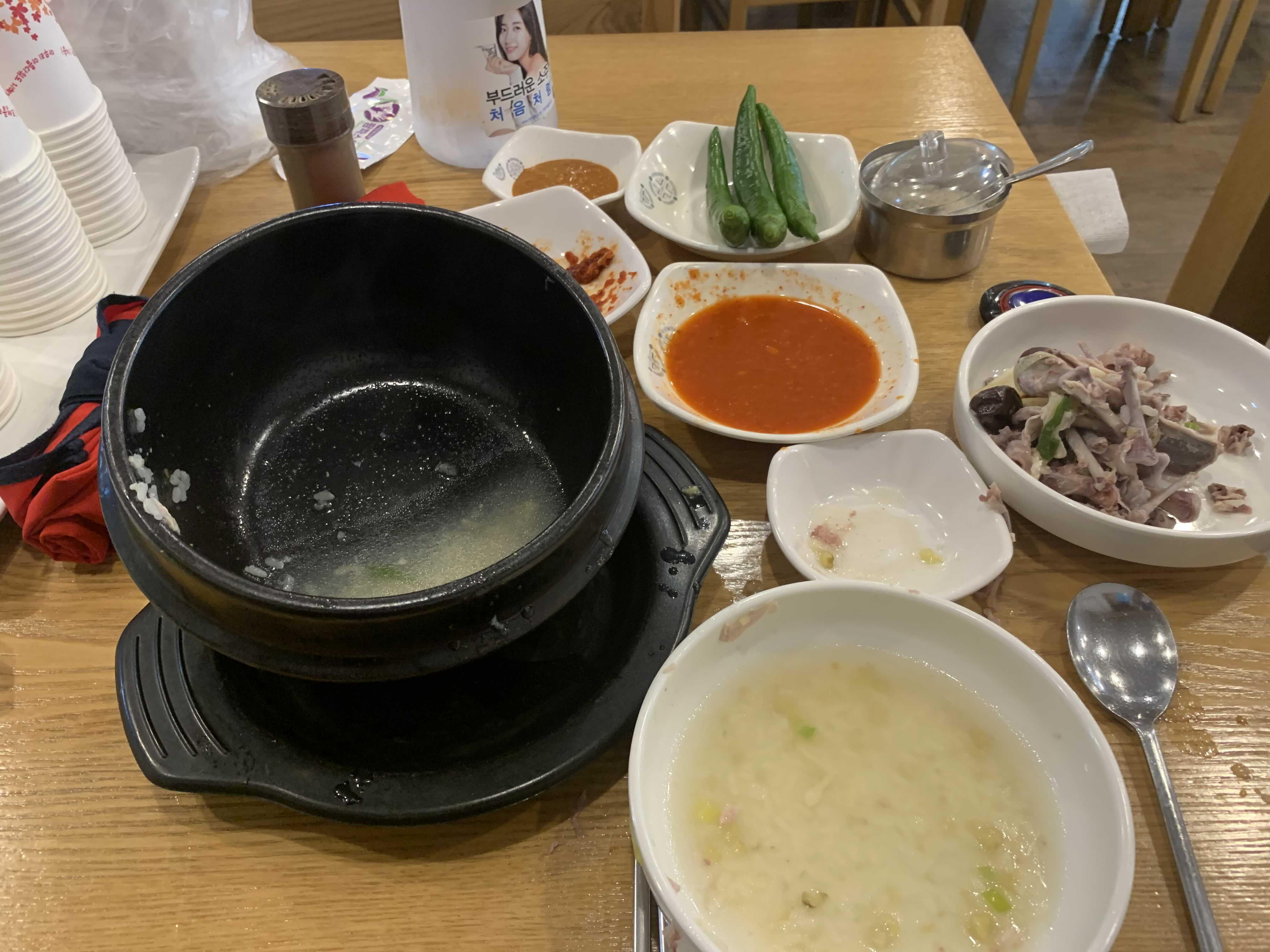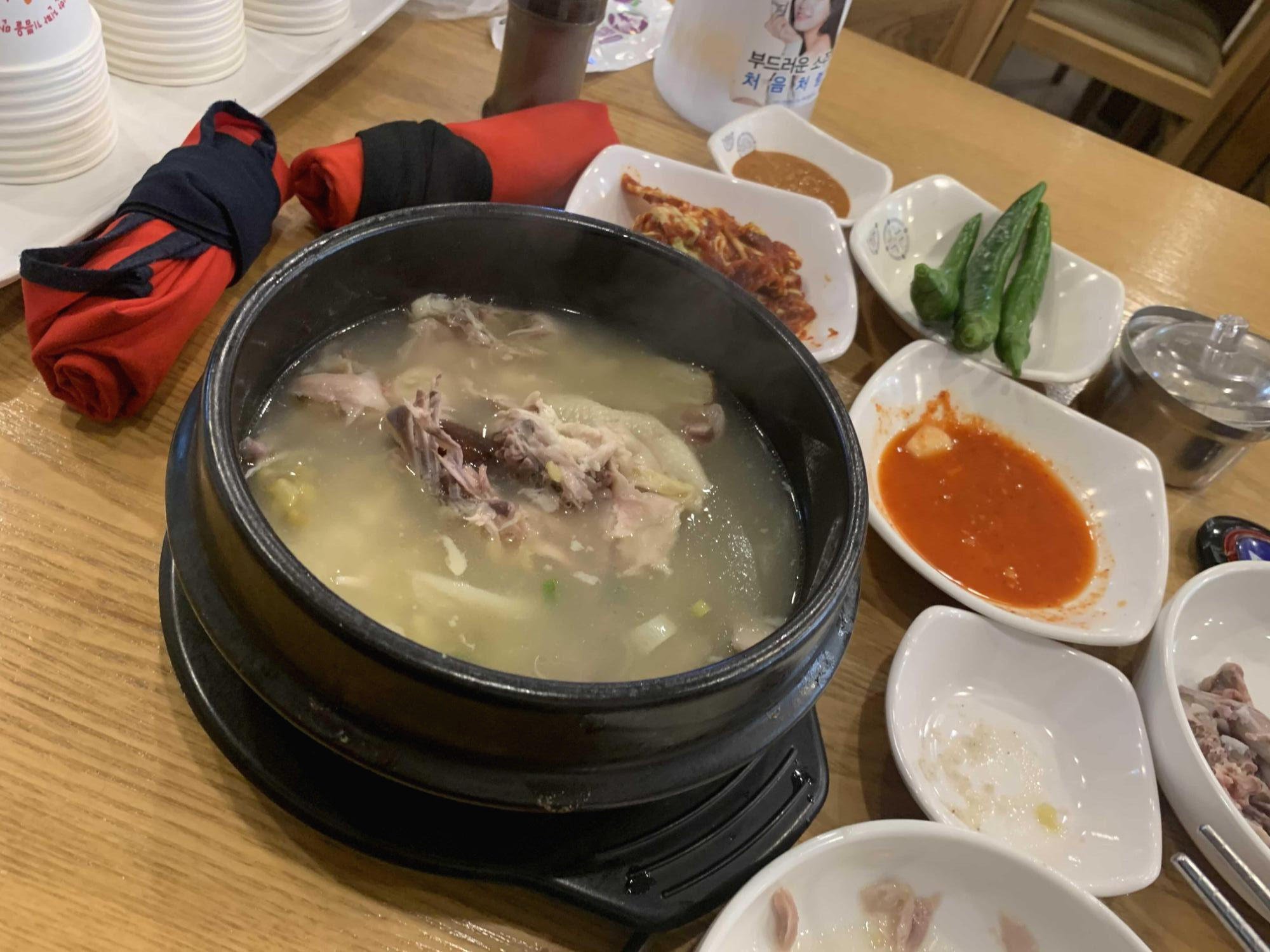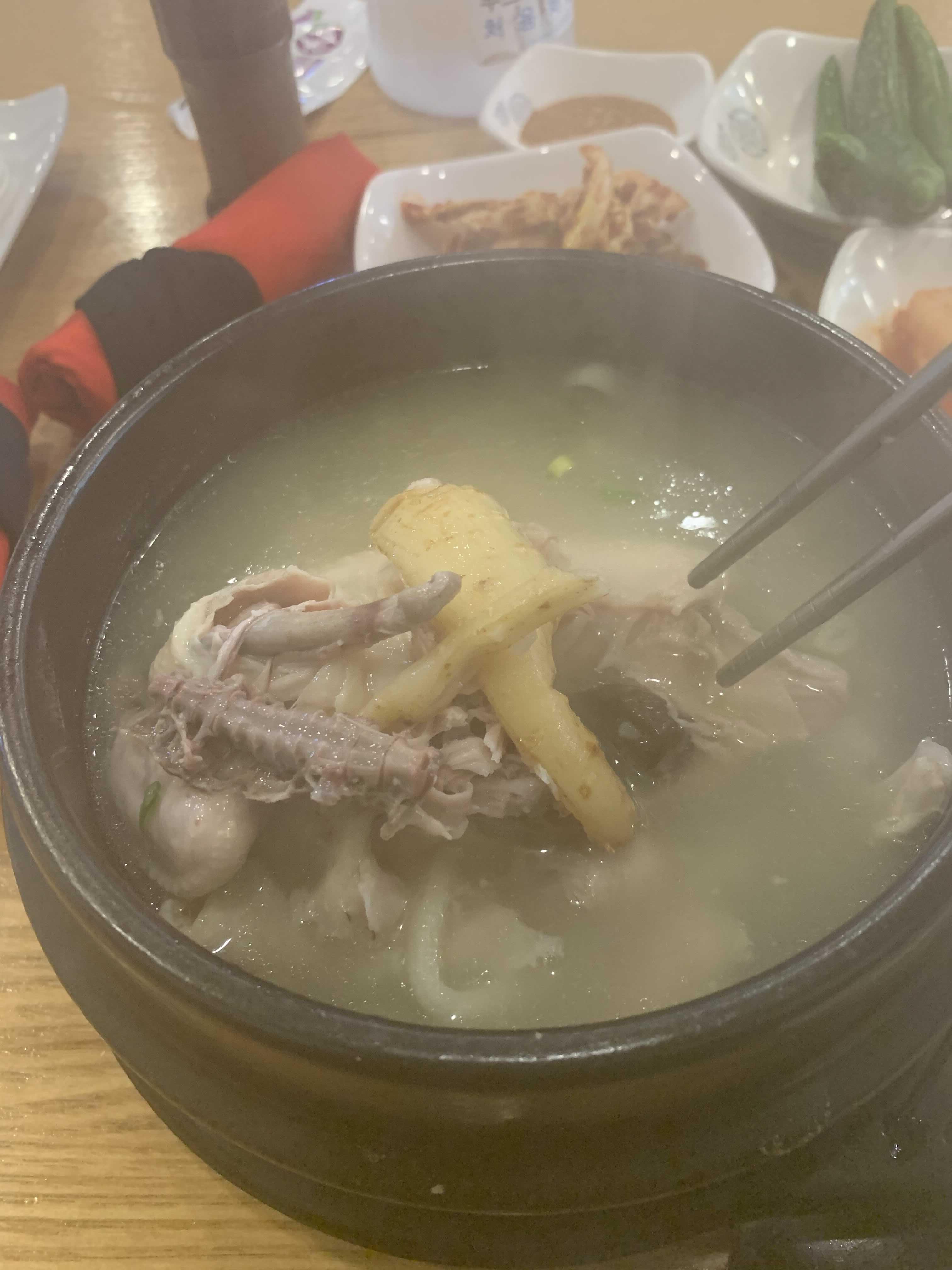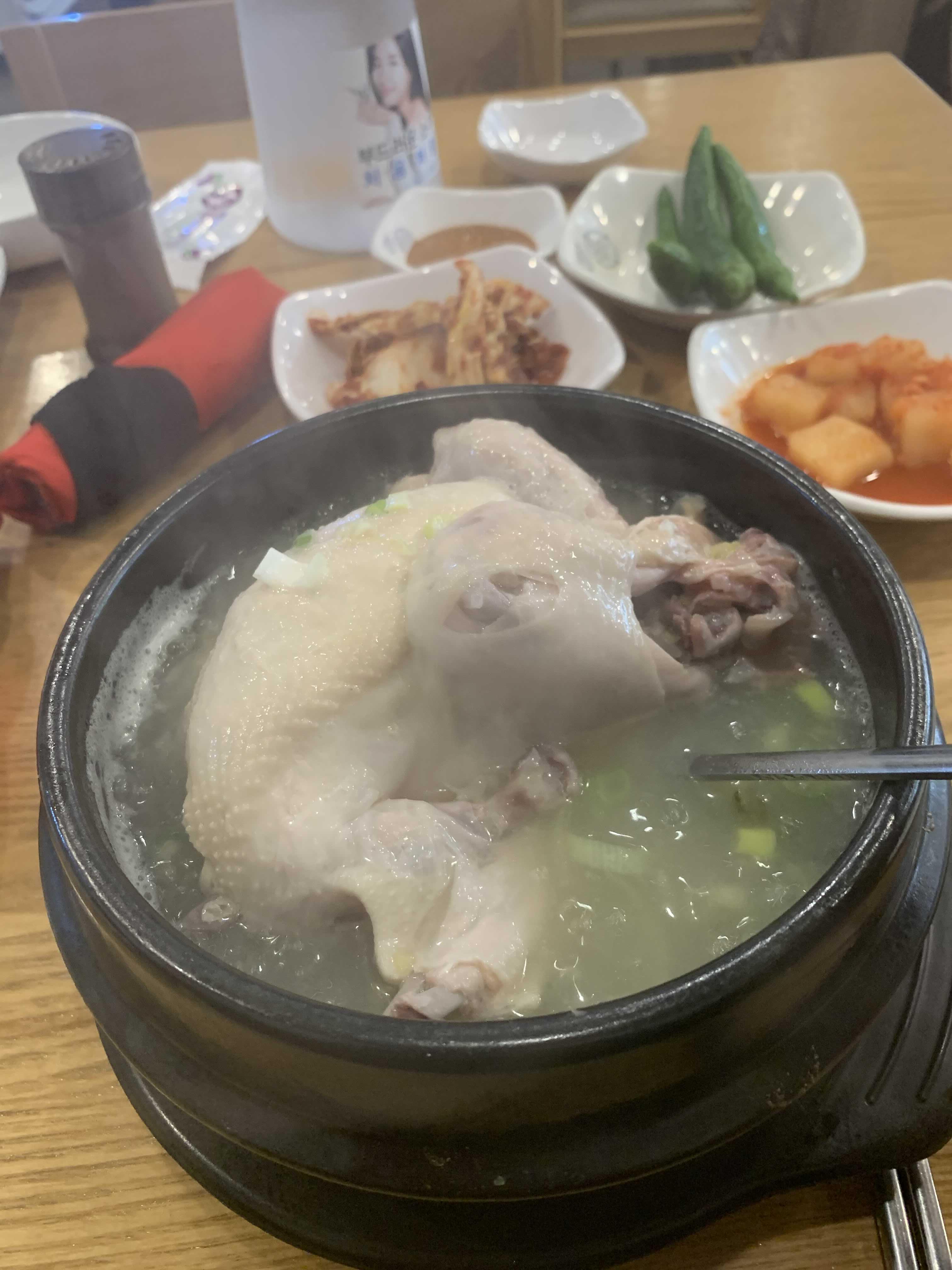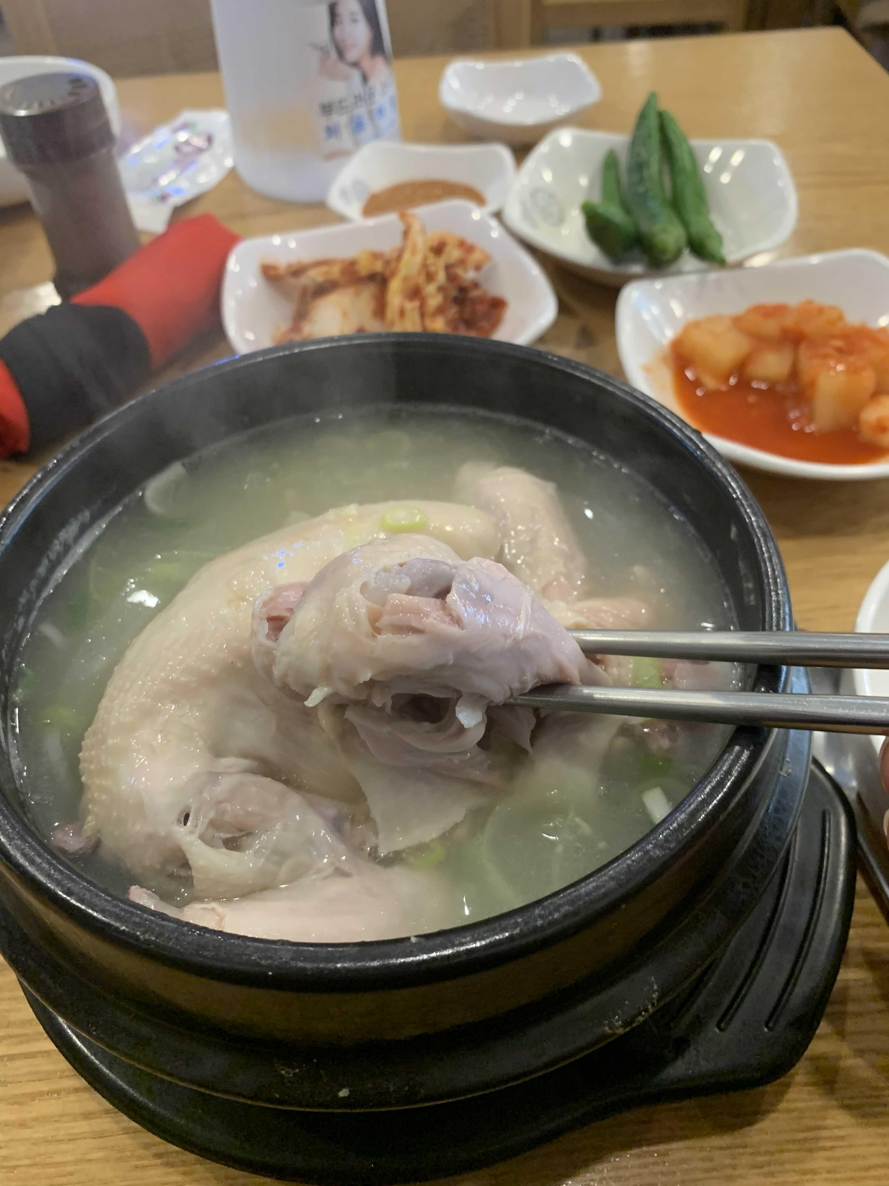 국물은 적절하게 간이 되어 있어서 그냥 먹어도 좋은 삼계탕! 기본 밑반찬으로 나온 배추김치는 비추, 깍두기는 맛있음! 13,000원 삼계탕으로 가격은 좀 비싸게 느껴짐, 밥양이 좀 적다는 느낌과 밑반찬이 좀 추가되어야겠다는 생각이 들었던 식당입니다.