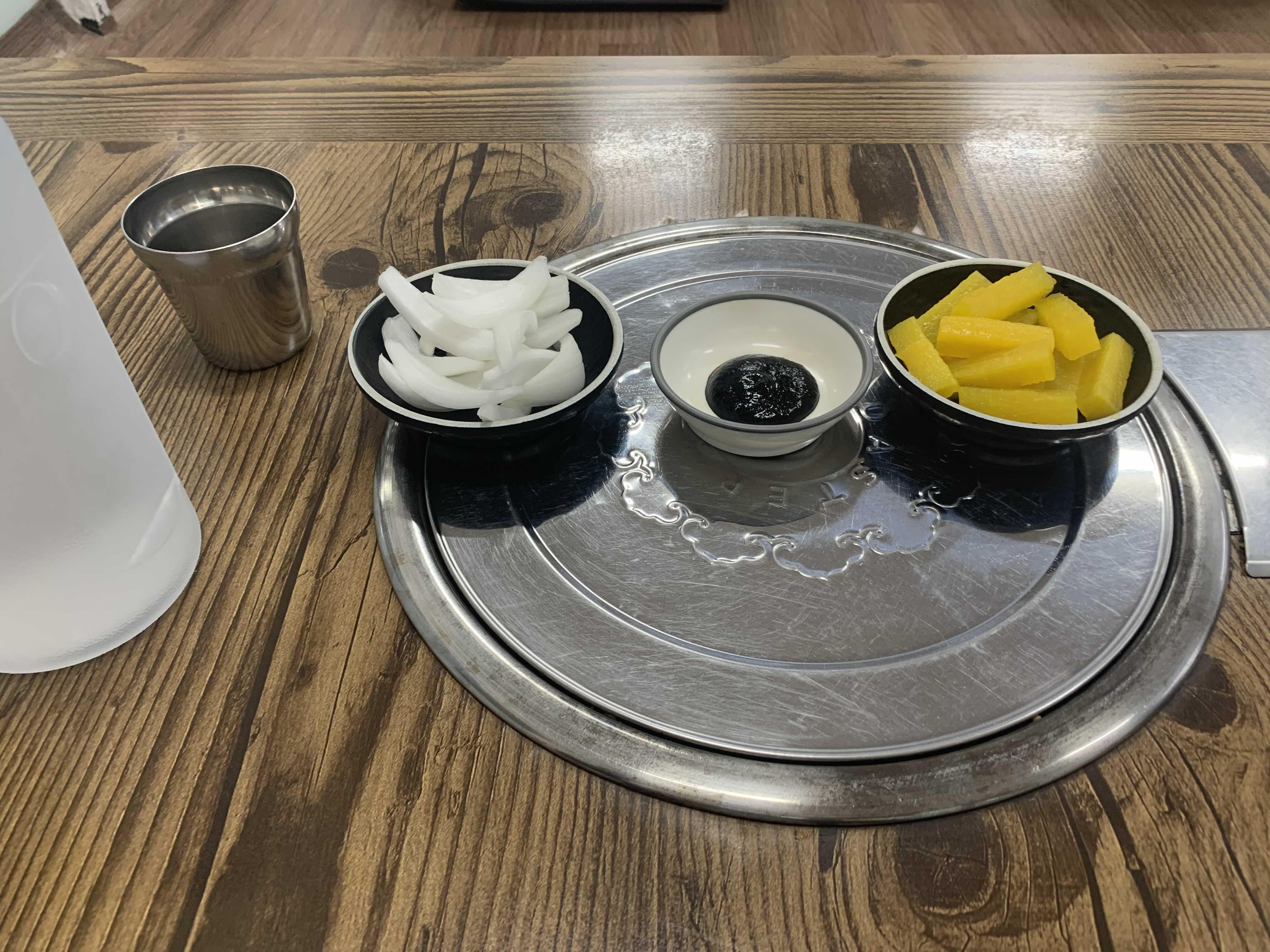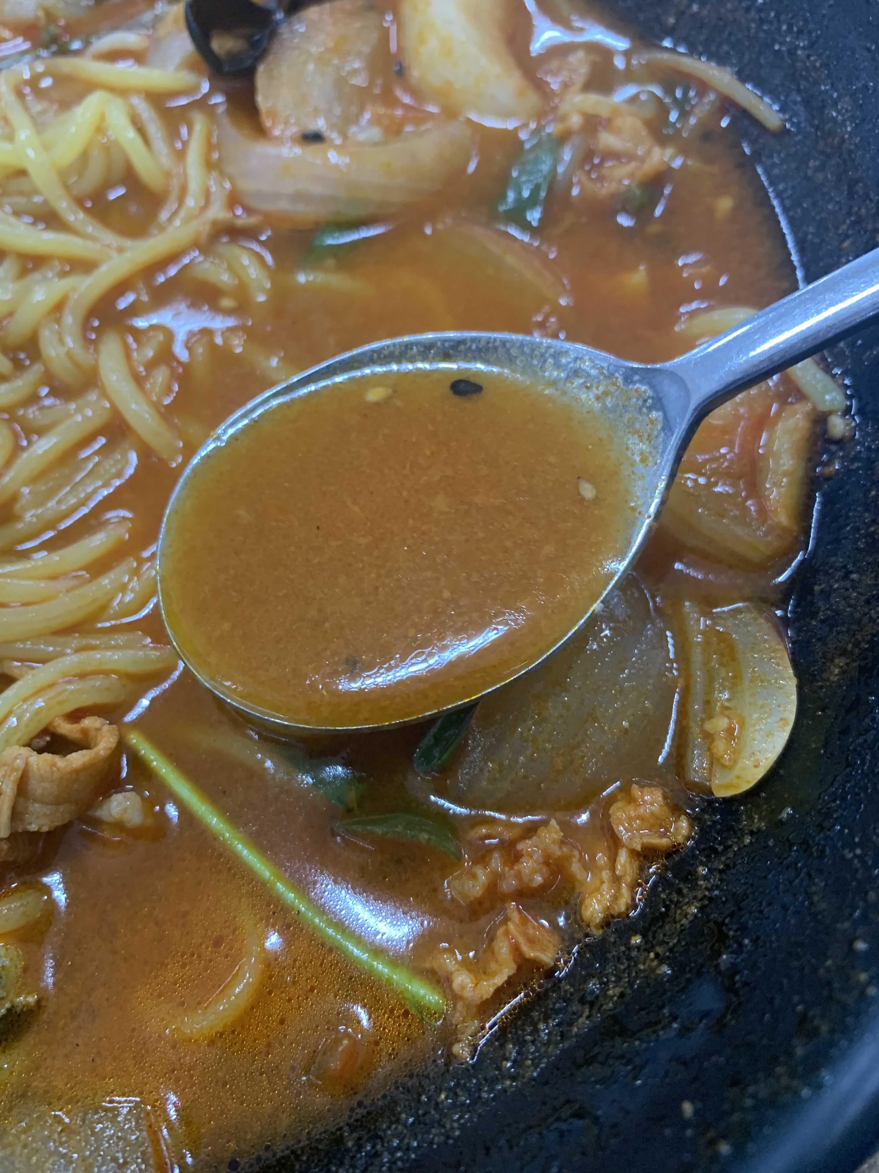 음식을 주문하고 잠시 후 밑반찬으로 단무지, 양파, 춘장이 나오고.... 조금 더 기다리니 짬뽕이 나옵니다. 짬뽕을 받은 순간!!! 양이 엄청 많더군요. 점심에 짬뽕을 먹으면.... 건더기 먹고 밥을 막아서 먹는데, 양이 많기에 공깃밥은 추가할 필요 없겠더군요. 건더기로는 부추, 숙주 그리고 고기가 들어있습니다. 고기는 2가지로 소고기(차돌박이), 돼지고기(전지 또는 후지로 추정되는 살코기)가 들어있더군요.