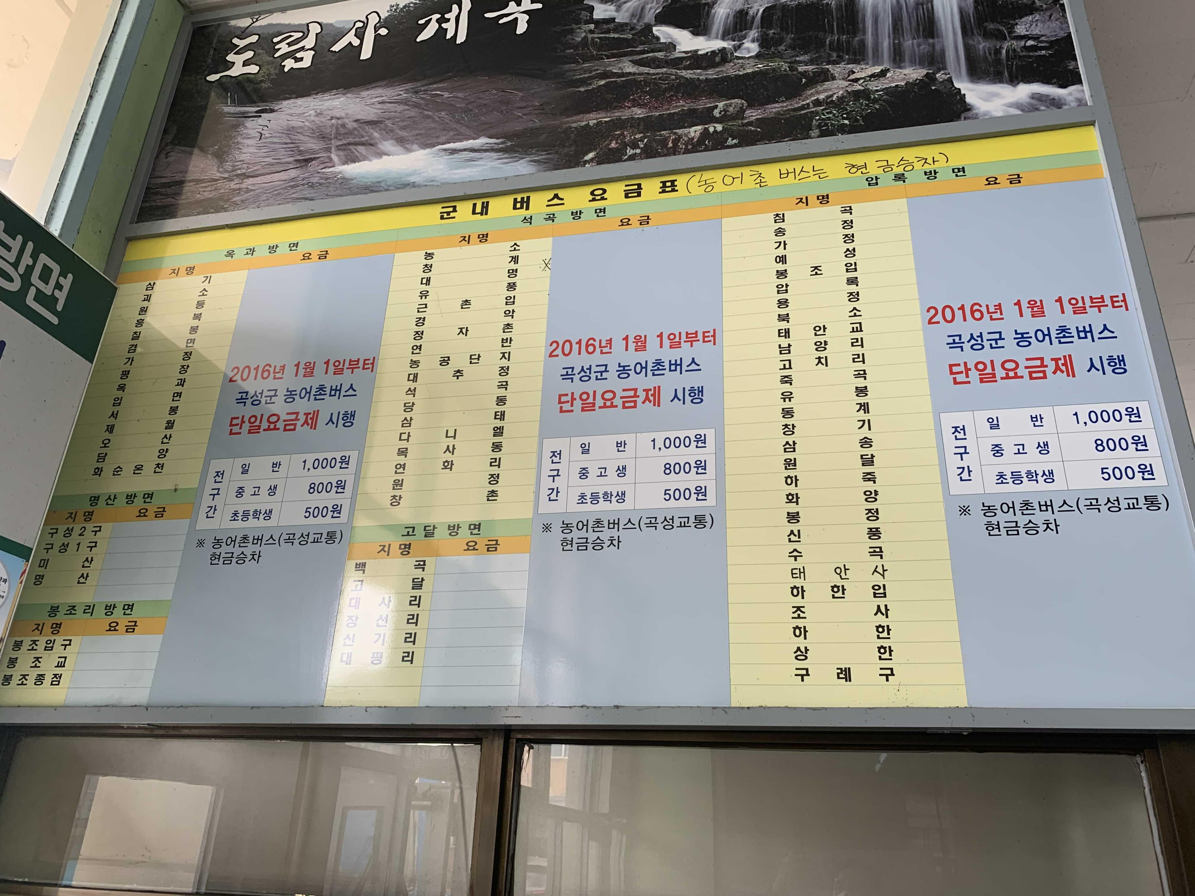 곡성군내 버스는 농어촌버스로 구분되며 거리와 상관없이 단일요금제로 운영하고 있습니다. 1,000원!! 현금만 가능하며 일반적으로 사용되는 후불교통카드는 안되더군요.