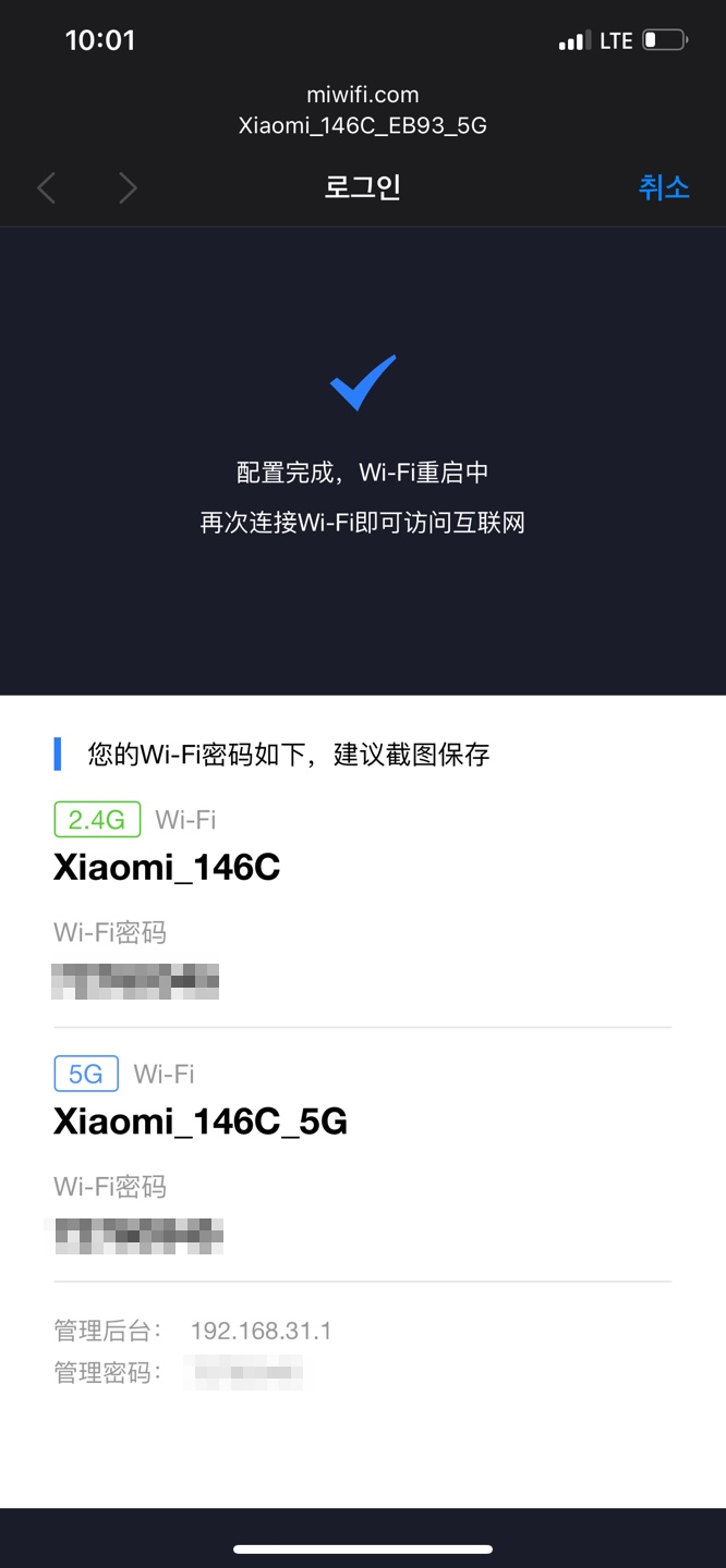 외부 디자인은 상당히 깔끔하더군요. 사진으로는 묵직한 느낌이지만, 들어보면 상당히 가볍습니다. 빈 깡통 느낌이^^ 공유기에 전원과 인터넷을 연결해주면 별다른 세팅 없이 공유기가 작동됩니다. 와이파이 중 "Xiaomi_146C_EB93" 클릭하면 공유기 비밀번호를 물어보며, 만들고 싶은 비밀번호를 입력하면 와이파이가 2.4G와 5G 2개가 생성되더군요.