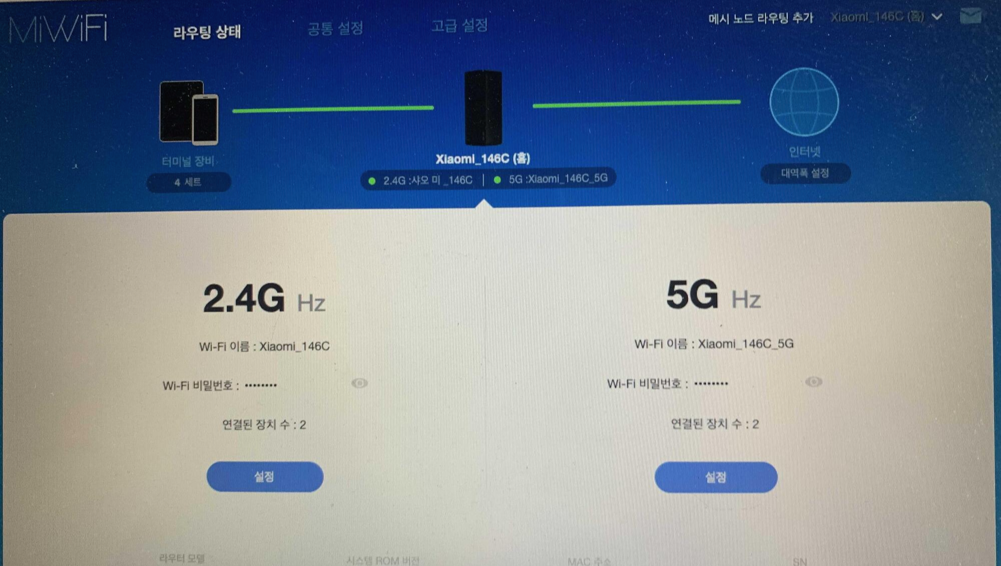기존 공유기보다 속도는 2배 가까이 속도가 나오더군요. 아쉬운 점이 핑!!! 핑이 꽤 높게 나오는데... 기존 공유기는 외부에 노출된 안테나 3개(2.4G용 2개, 5G용 1개)로 2.4G 속도는 빠르지는 않지만 반응속도는 좋았었는데..... 디자인에 너무 신경 쓰다 와이파이 품질은 그리 좋지 못한 거 같더군요. 그리고..... 설정!!! MI-WIFI 앱을 이용하여 설정할 수 있는데? 앱에서 공유기를 잡히지 않더군요. 그래서 MI-HOME을 이용하여 공유기에 접속하려 했으나...... 역시나 안되더군요.