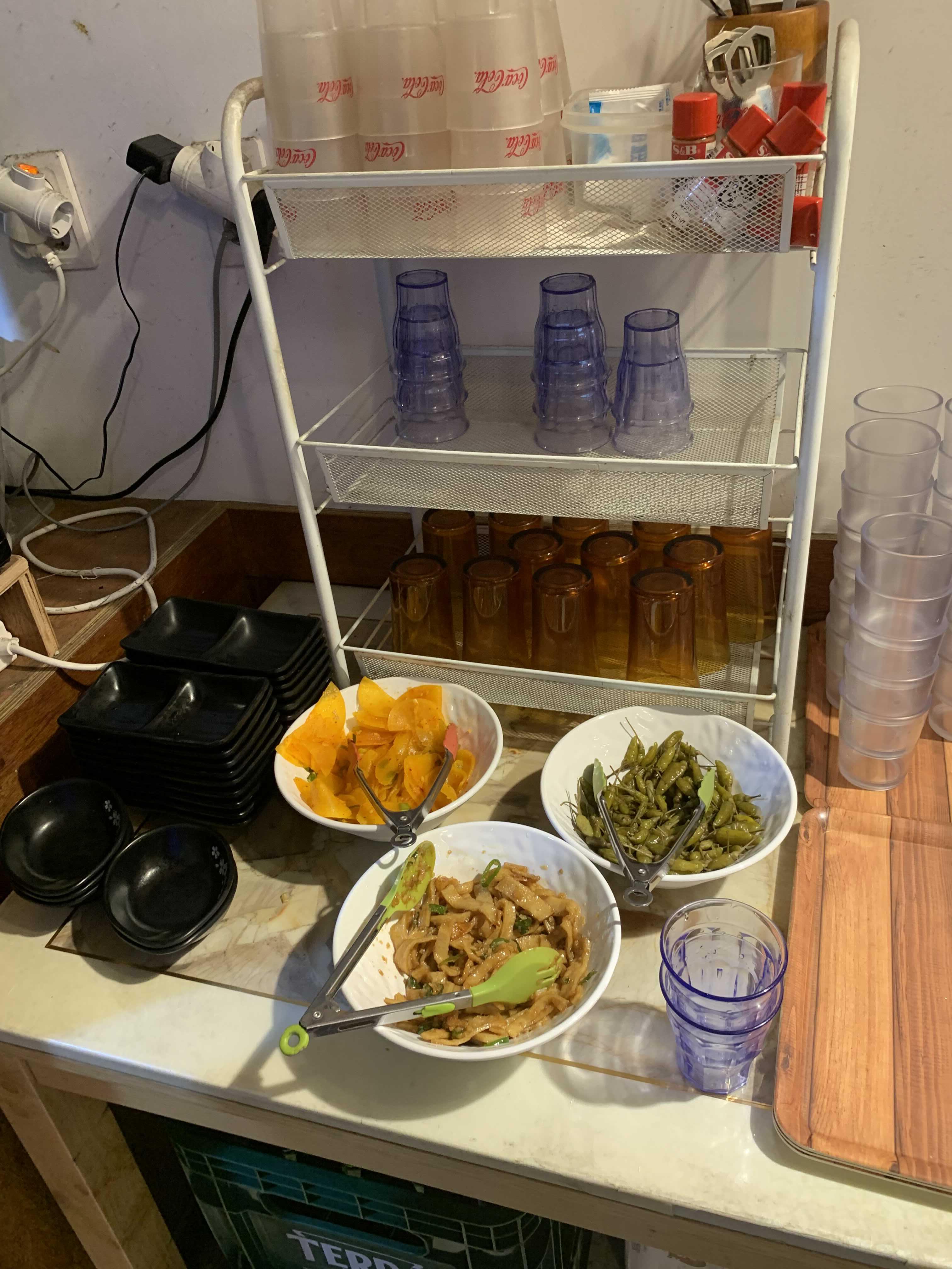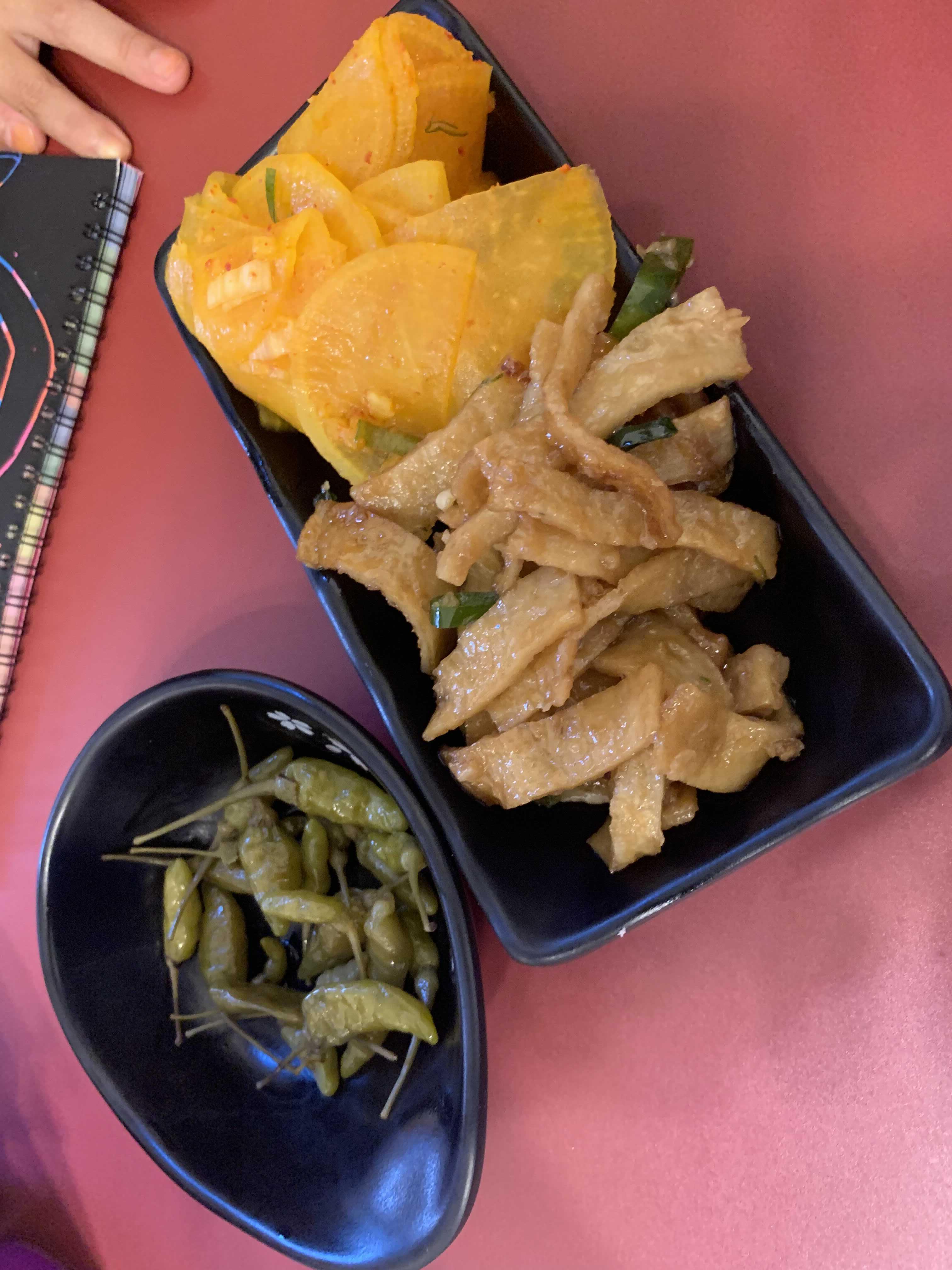 음식 가격으로는 돈가스 9,000원, 텐동 9,500원, 마제 소바 9,000원으로 저렴하지도 비싸지도 않은 수준이더군요. 음식을 기다리며 셀프바에는 밑반찬 3종(어묵볶음, 단무지, 고추?) 세트가 준비되어 맛보았습니다. 특히 어묵볶음.... 매콤함과 짭조름하여 입맛 다시기에 좋더군요. 먹다 보니.... 한 그릇 더 가져다 먹었네요. 어묵볶음을 먹으며... 음식에 대한 기대도 올라갔습니다.