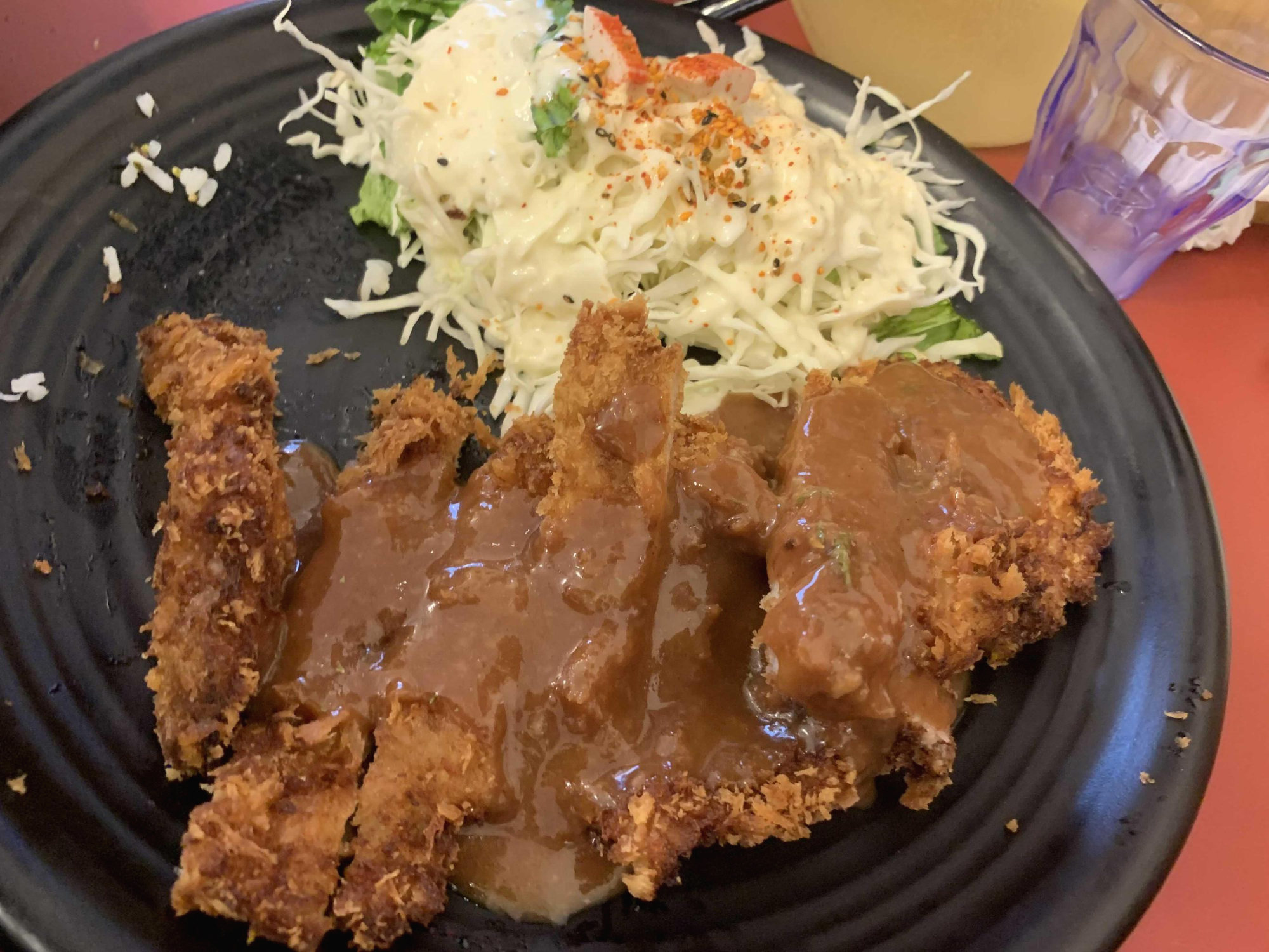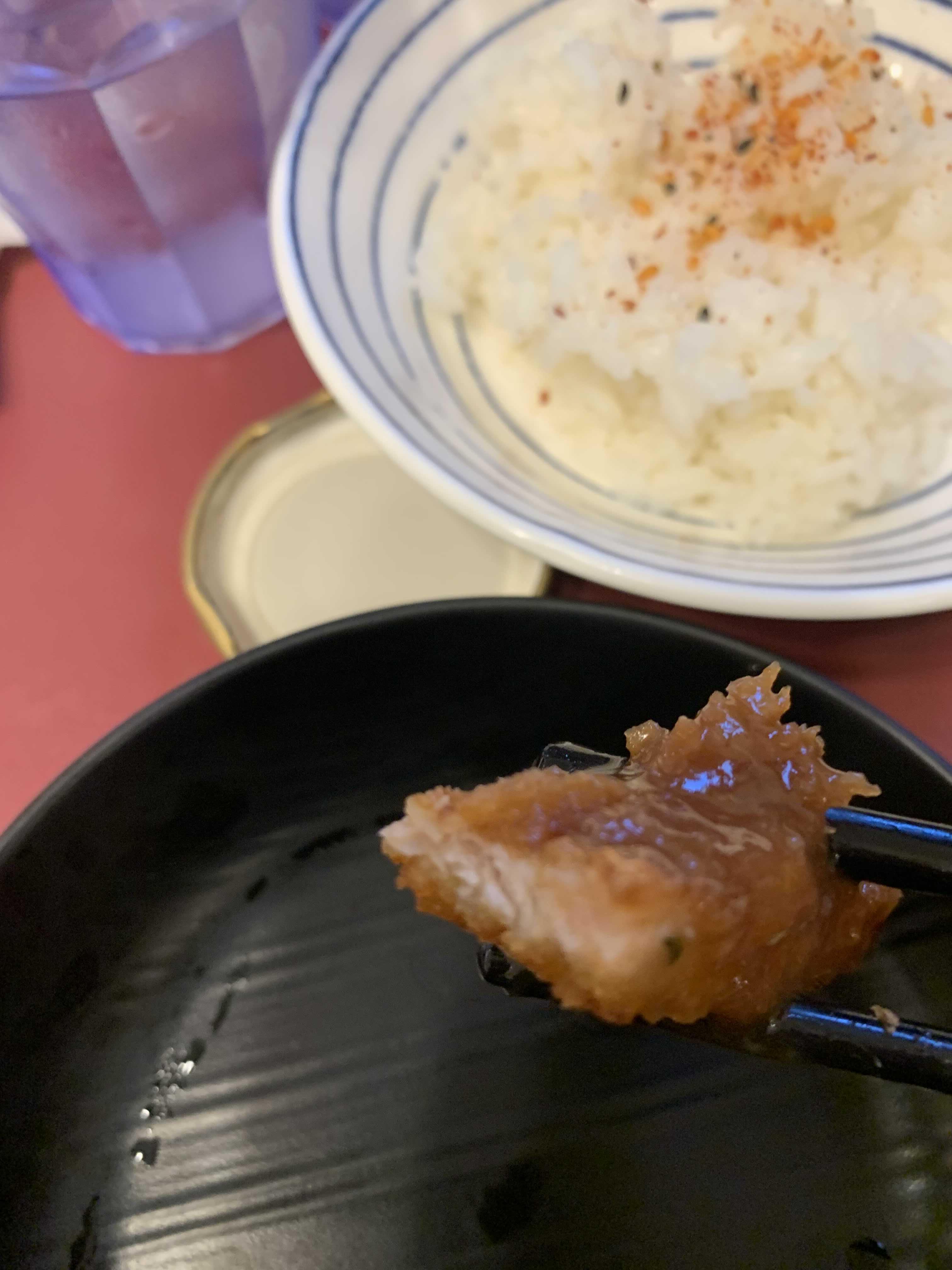 우선 돈가스부터 맛보았는데.... 고기는 그리 두껍지 않았고 바삭한 강한 돈가스입니다. 작은아이용 고기를 그릇에 담아주고 소스를 뿌려 먹기 시작했습니다. 작은 아이는 그리 좋아하지 않더군요. 큰아이는 무지 좋아하는데.... 제가 먹기에 맛이 나쁘지 않았습니다. 소스와 함께 먹으니 돈가스 맛집이라고 하기에는 좀 부족한 느낌이지만 평균 이상은 하더군요.