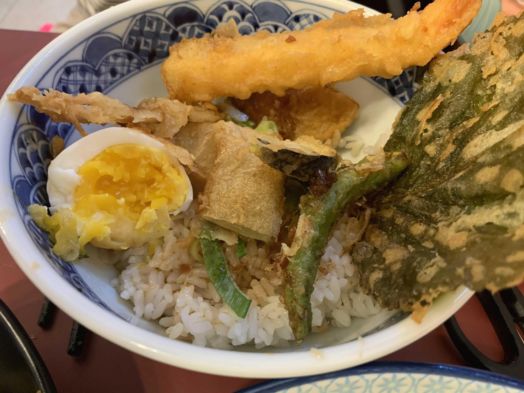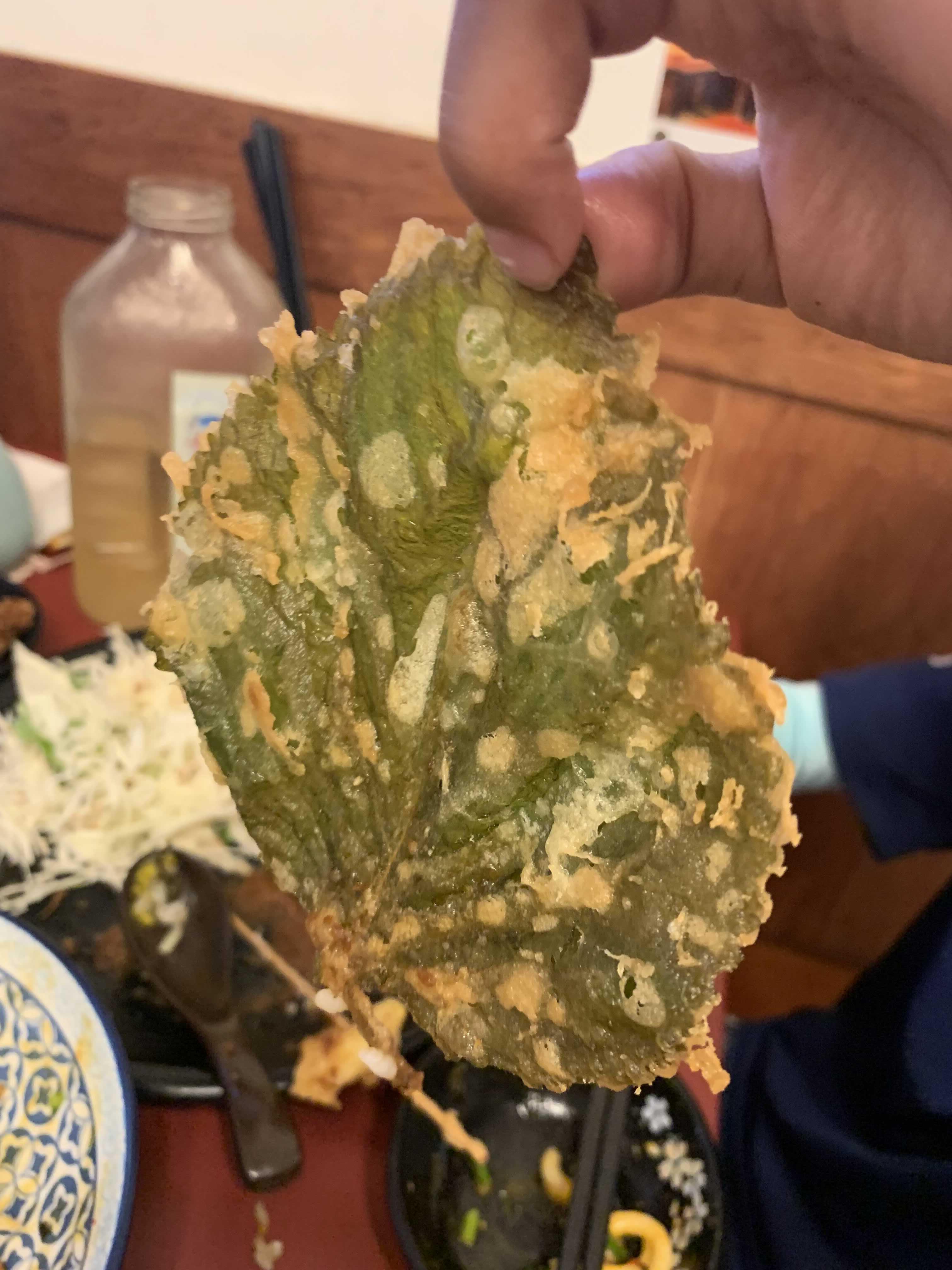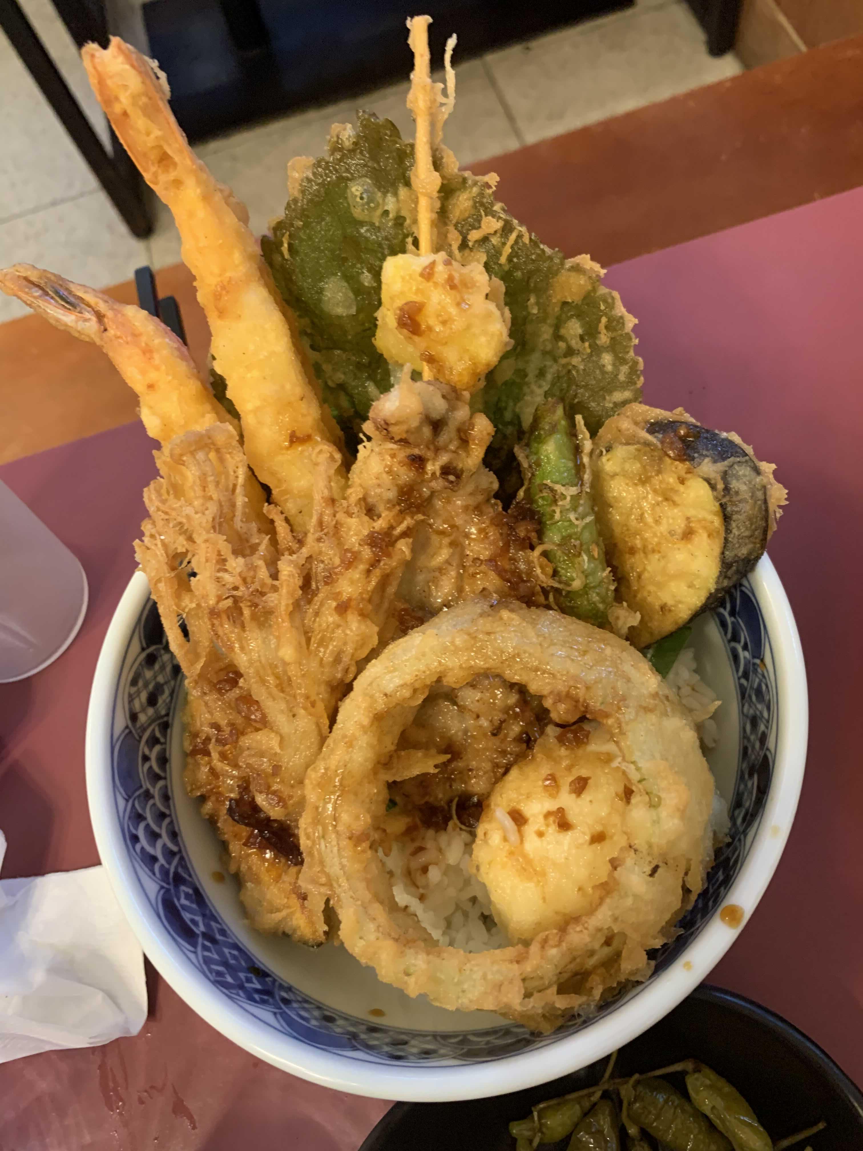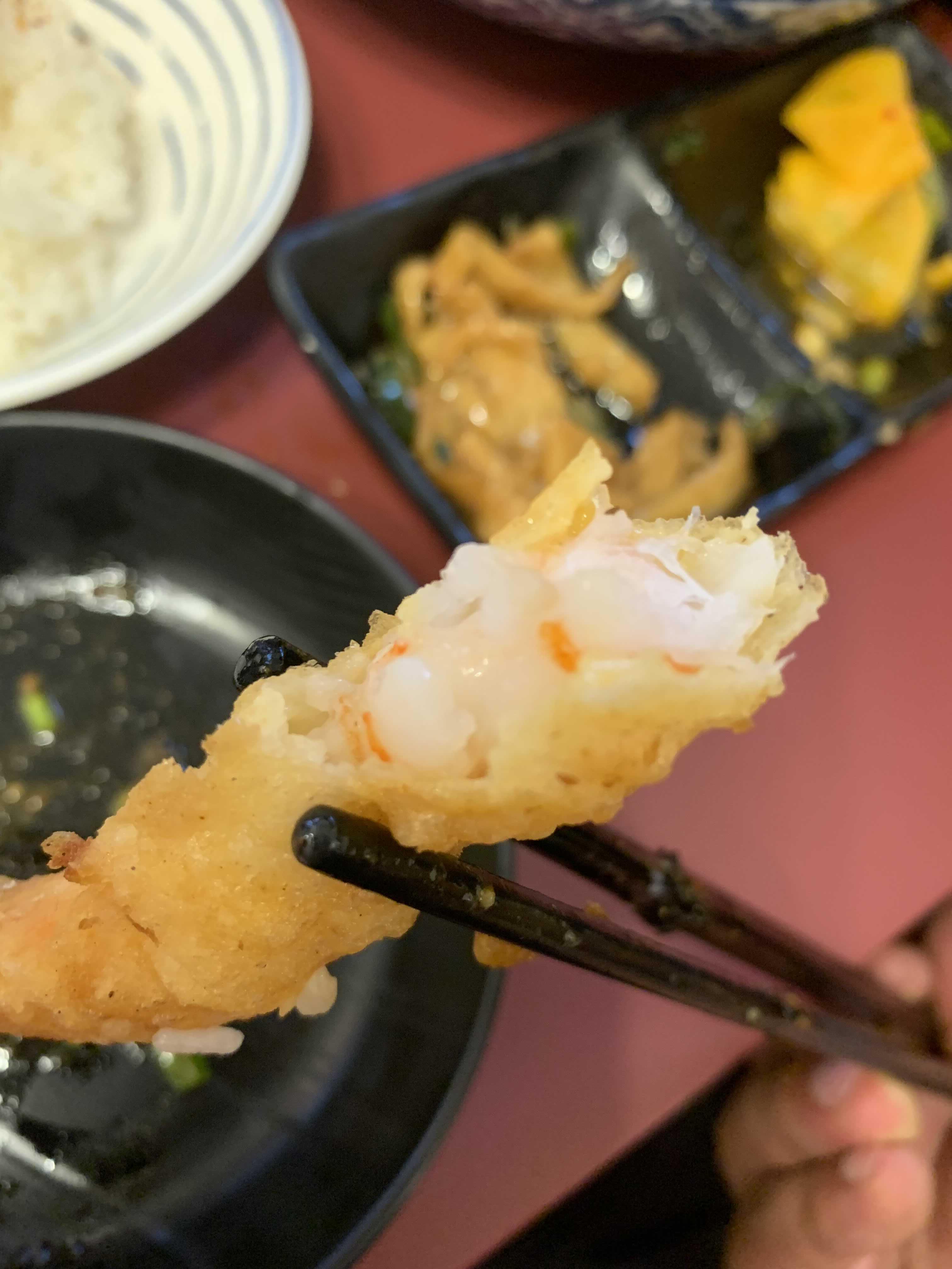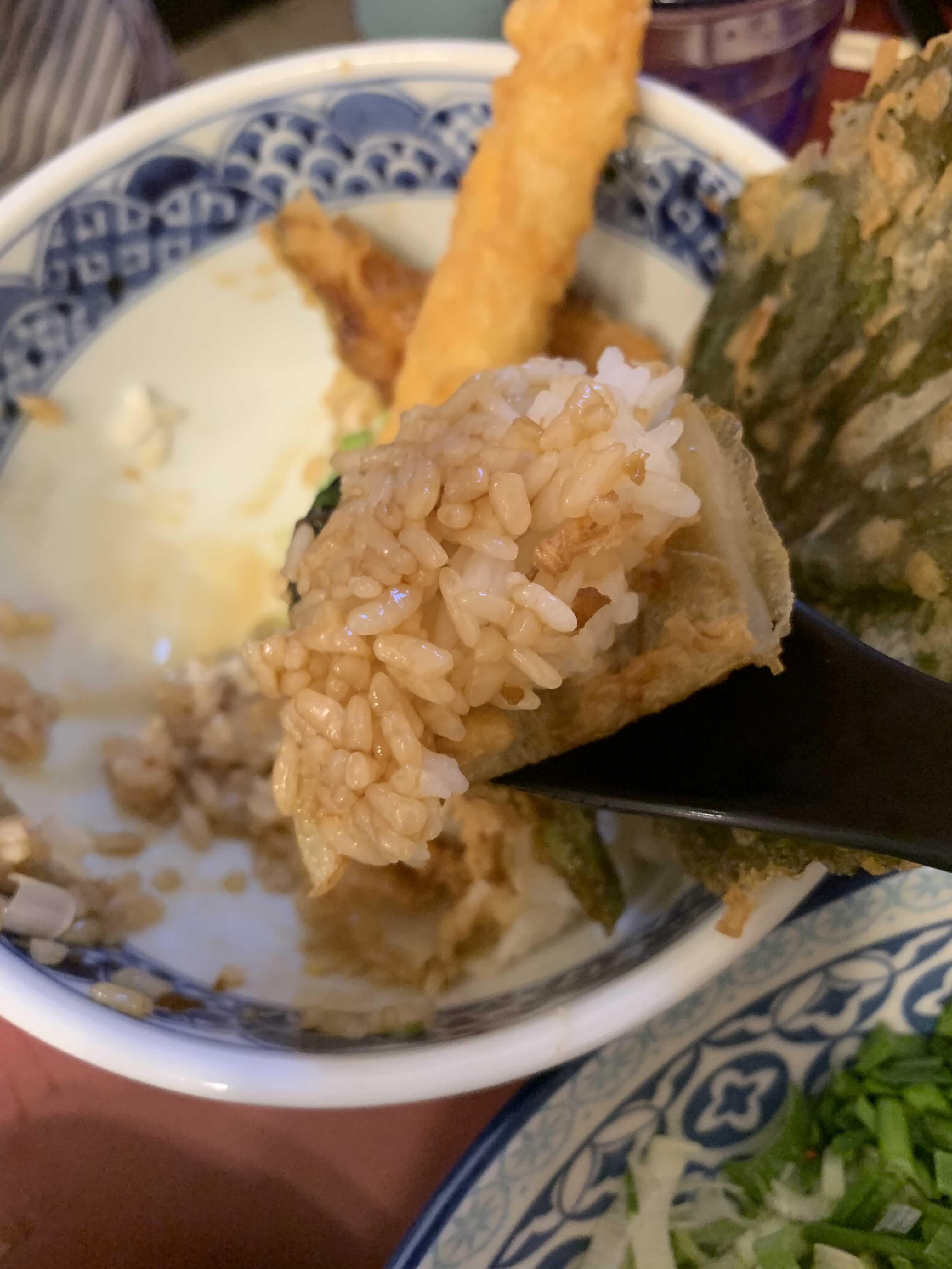 텐동에서 튀김은 역시 깻잎튀김!!! 튀김이 아닌 얇은~ 정말 얇은 비스킷을 먹는 느낌의 튀김! 새우튀김은 속살 부드럽고 뒤 김 옷은 바삭함은 약간 덜하더군요.