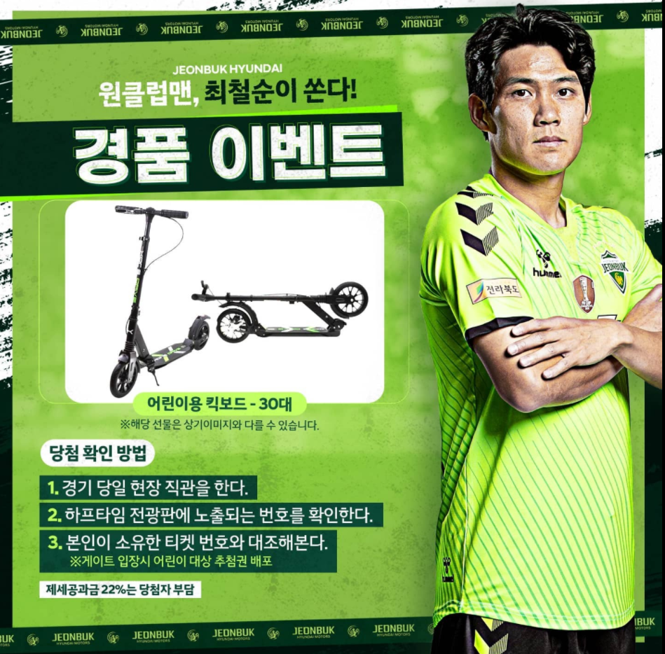 하프타임에 최철순이 쏜다! 400경기 출전 기념으로 최철순 선수가 어린이들에게 킥보드 30대를 선물하는 이벤트를 진행하였습니다. 하프타임에 티켓을 뽑고, 후반전 중반쯤 전광판으로 안내해주더군요. 경품이 당첨된 적이 없어.... 큰 기대를 안 하고 전광판과 내 티켓번호를 확인하니.... 비슷한 번호가 있더군요.