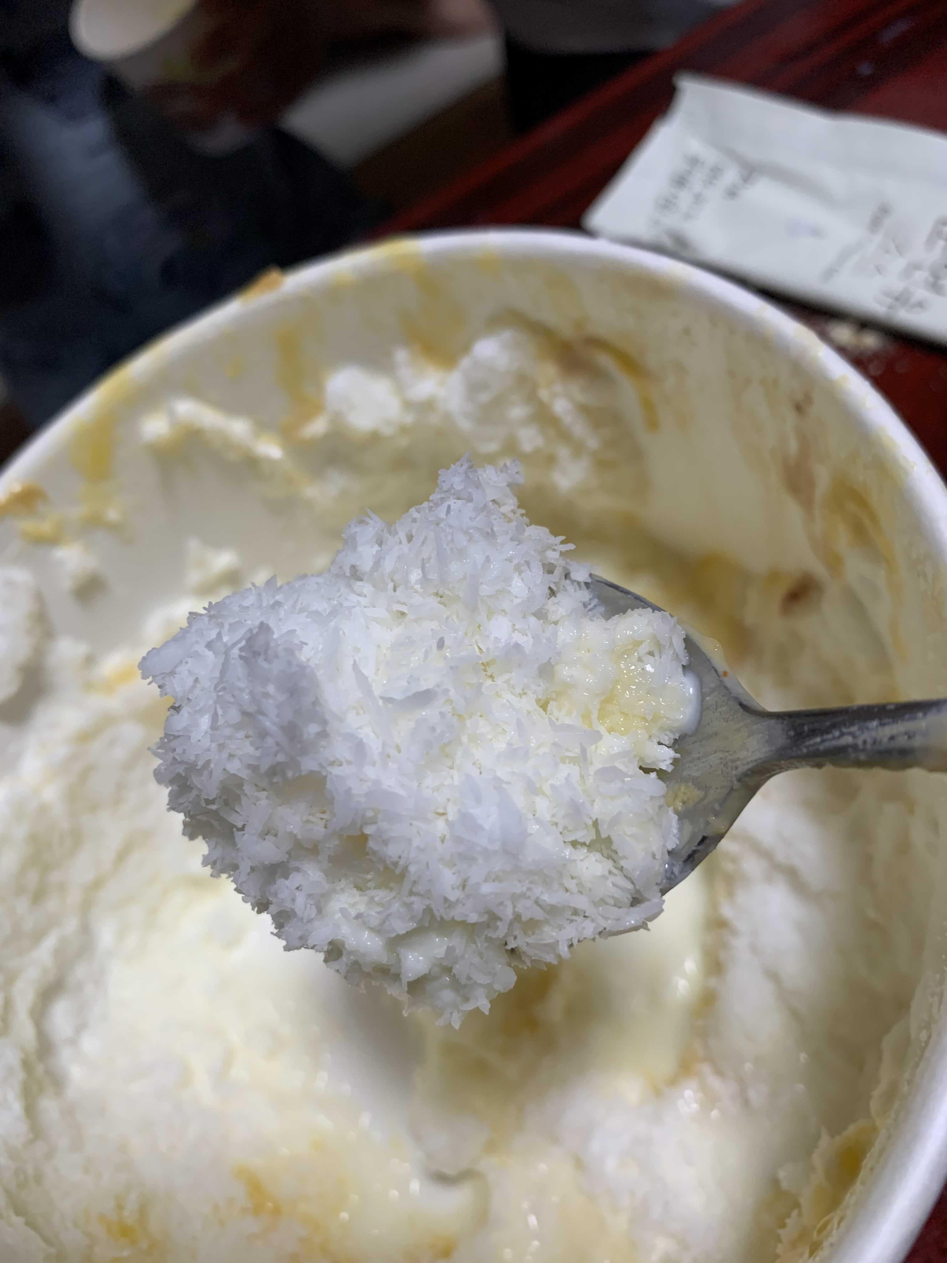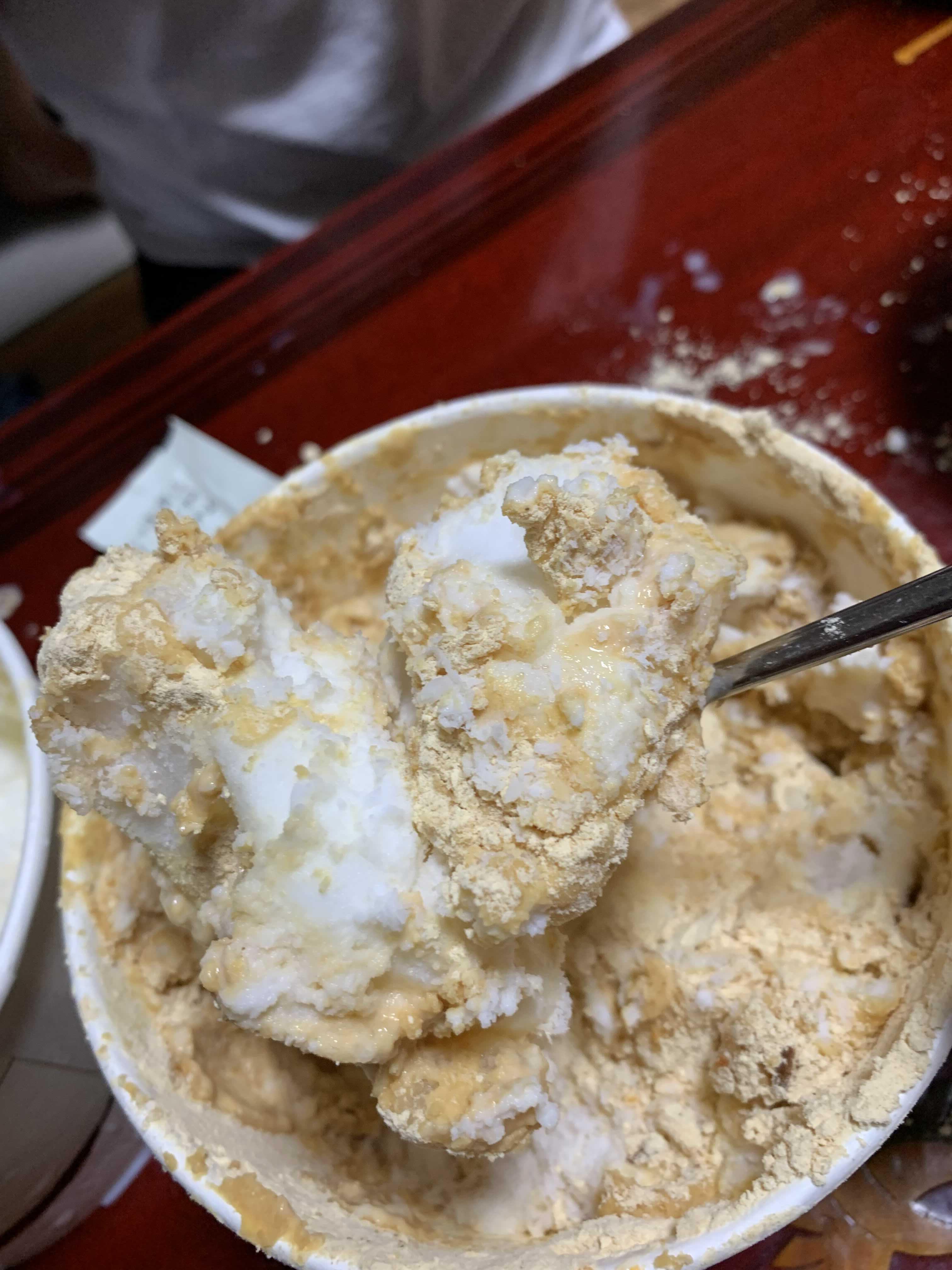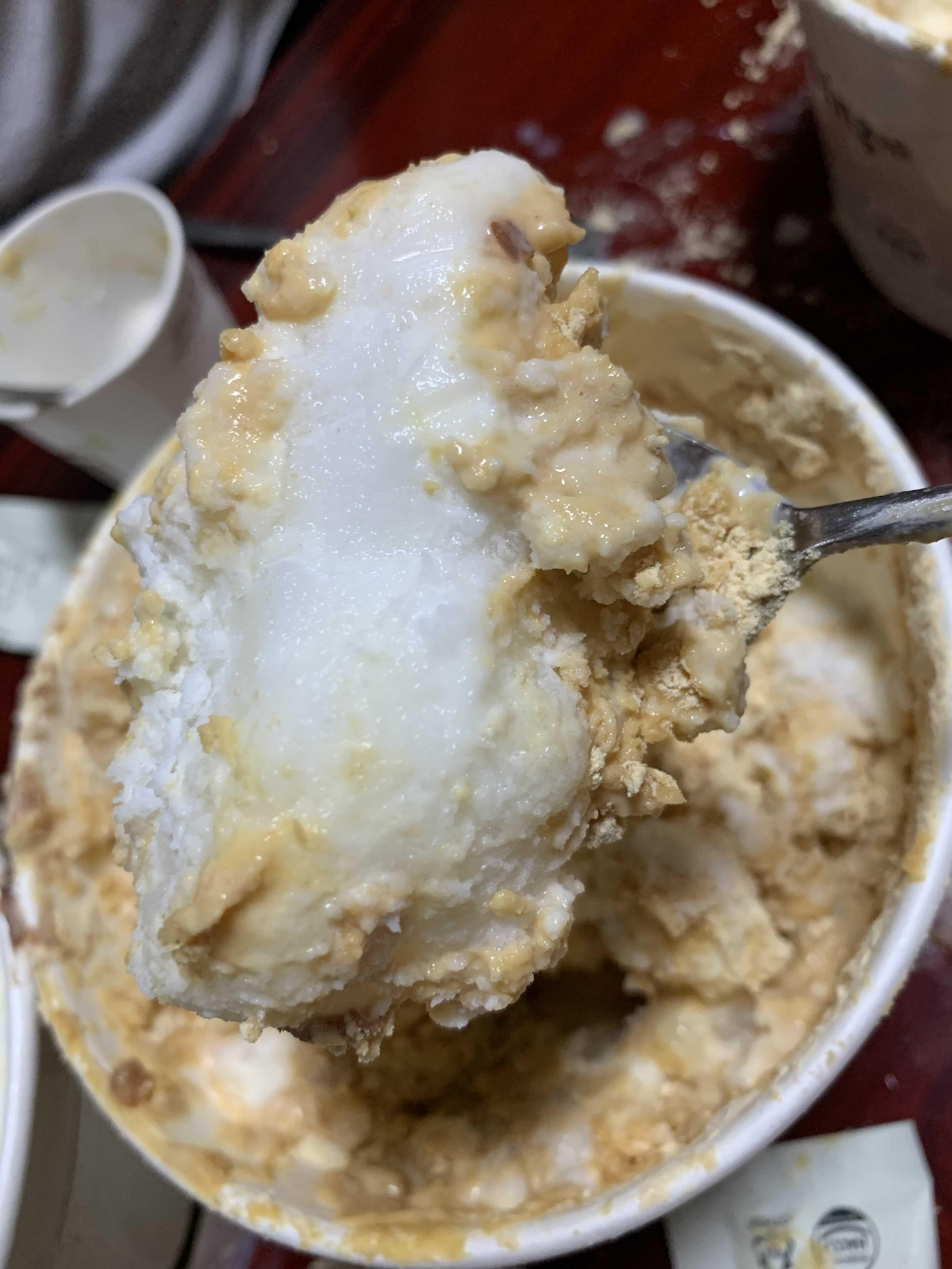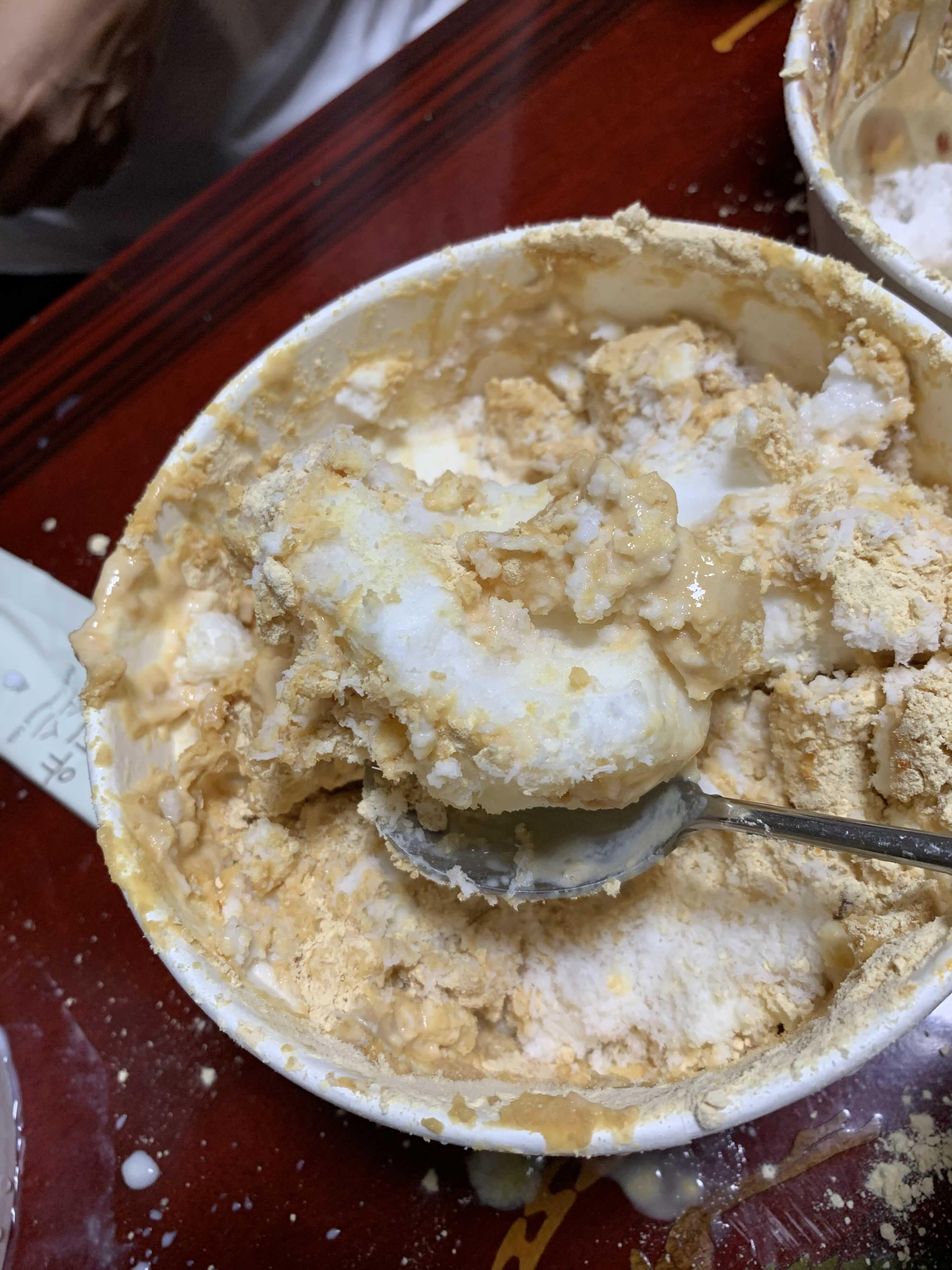 가장 기본적인 인절미 설빙부터 맛을 보았습니다. 뚜껑을 개봉하고 위쪽에는 눈꽃이 약간 덮여 있고, 그 내부에는 눈꽃 얼음덩어리가 있더군요. 설빙 맛의 핵심은 눈꽃!!! 부드러운 빙수 있데.... 눈꽃이 아닌 얼음빙수가 배달되었네요.
