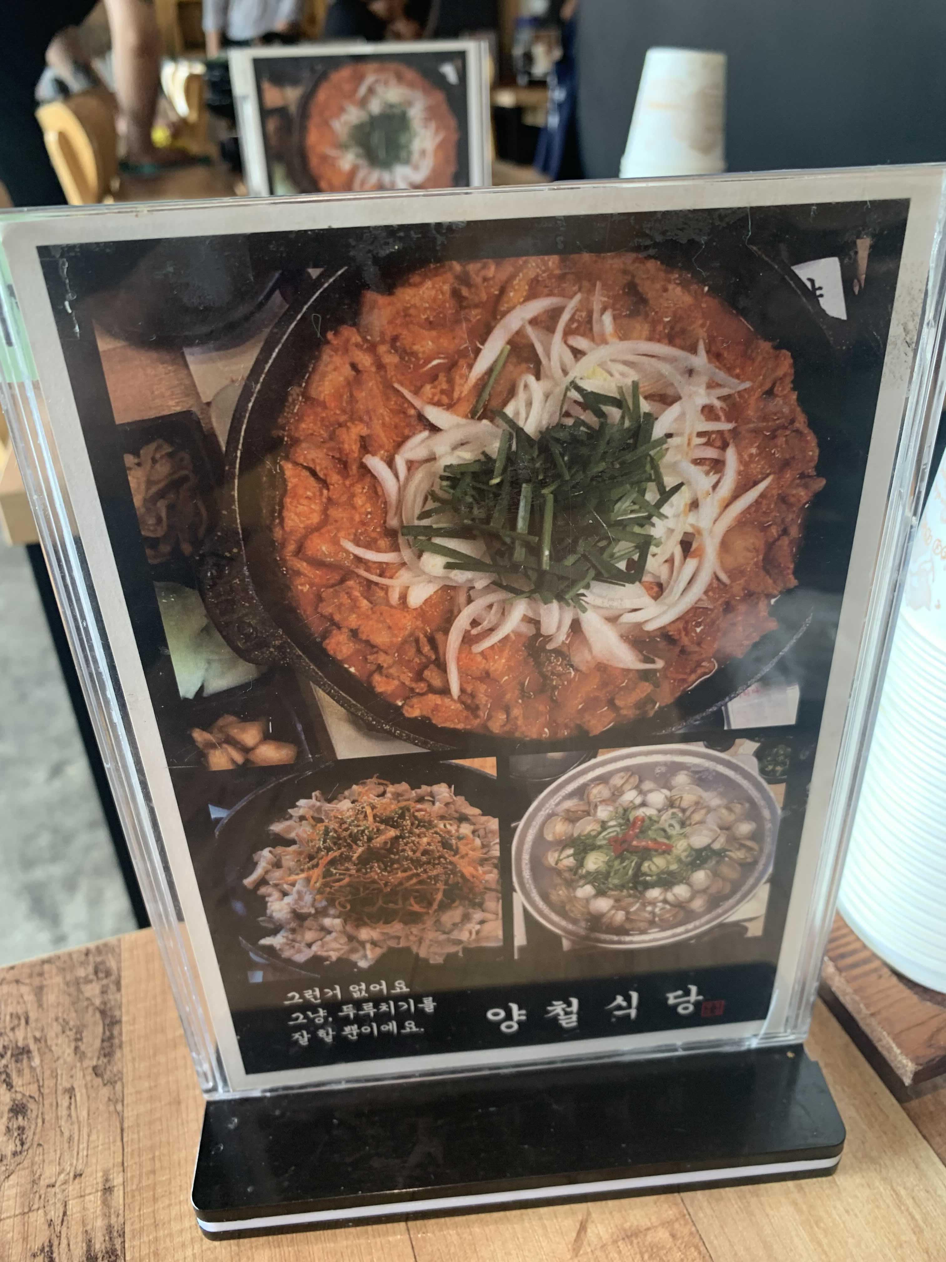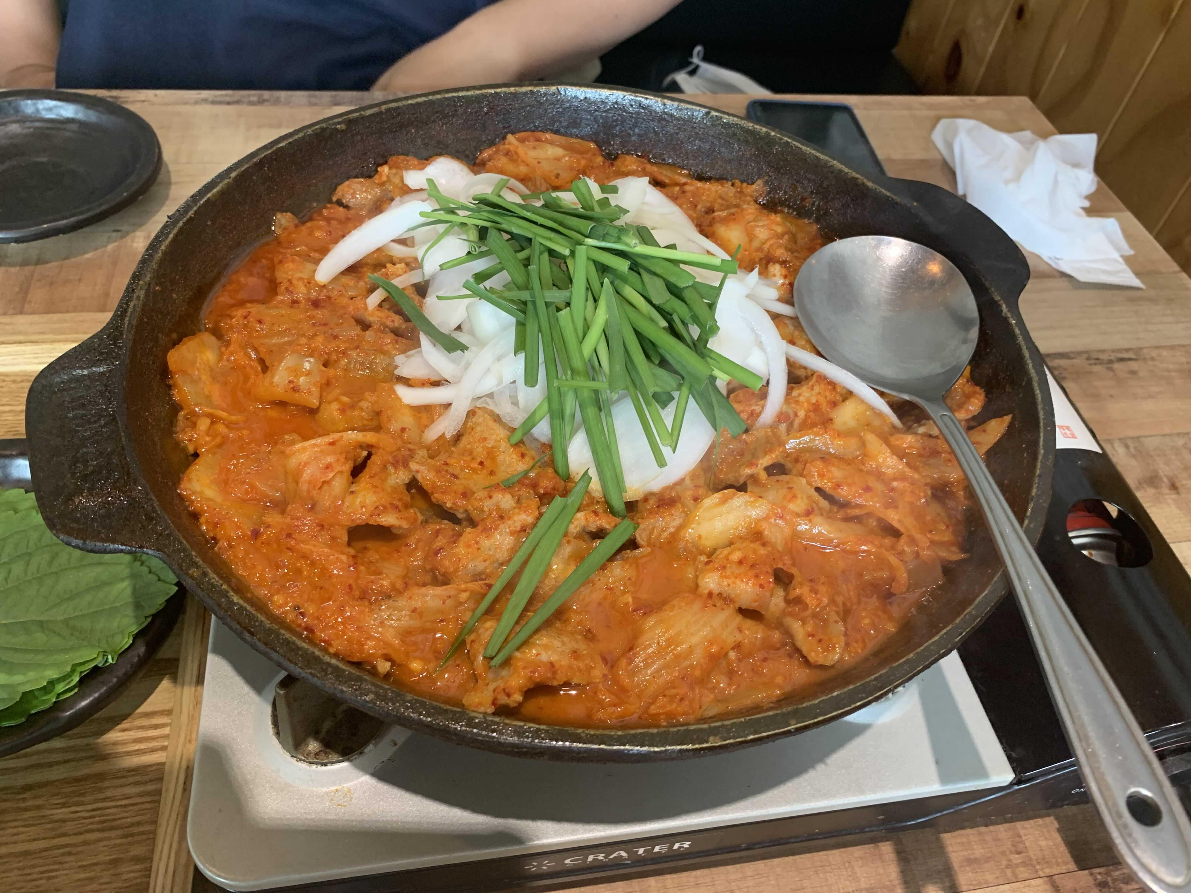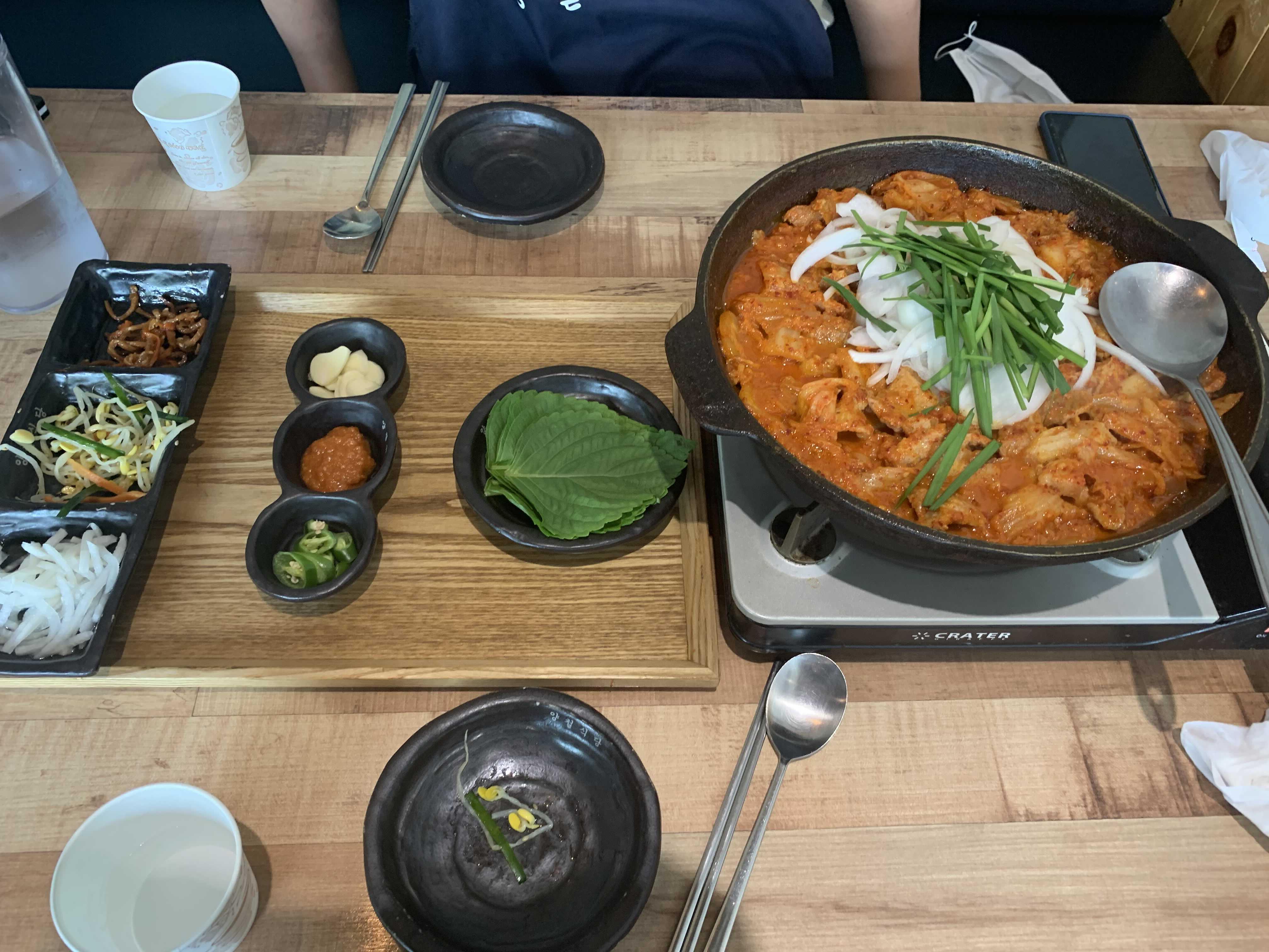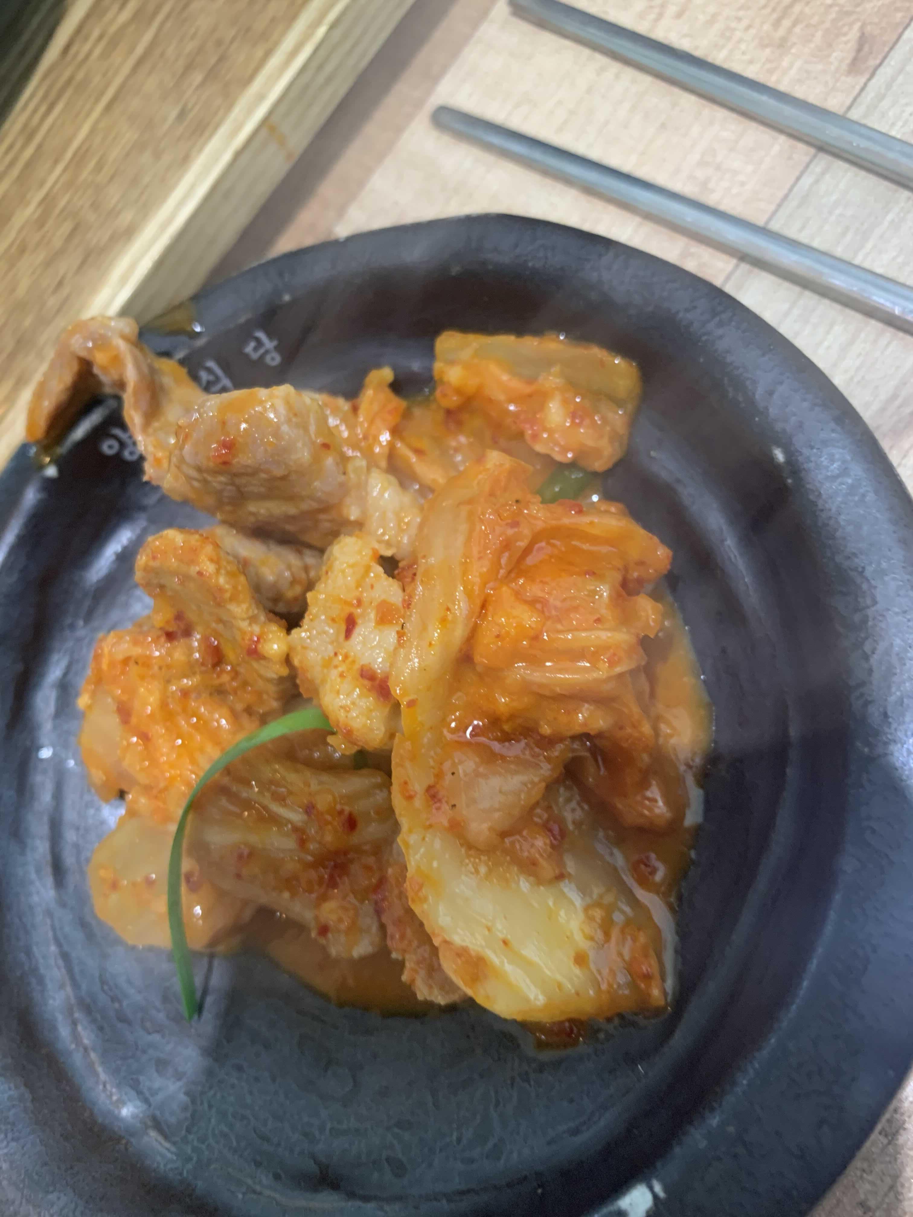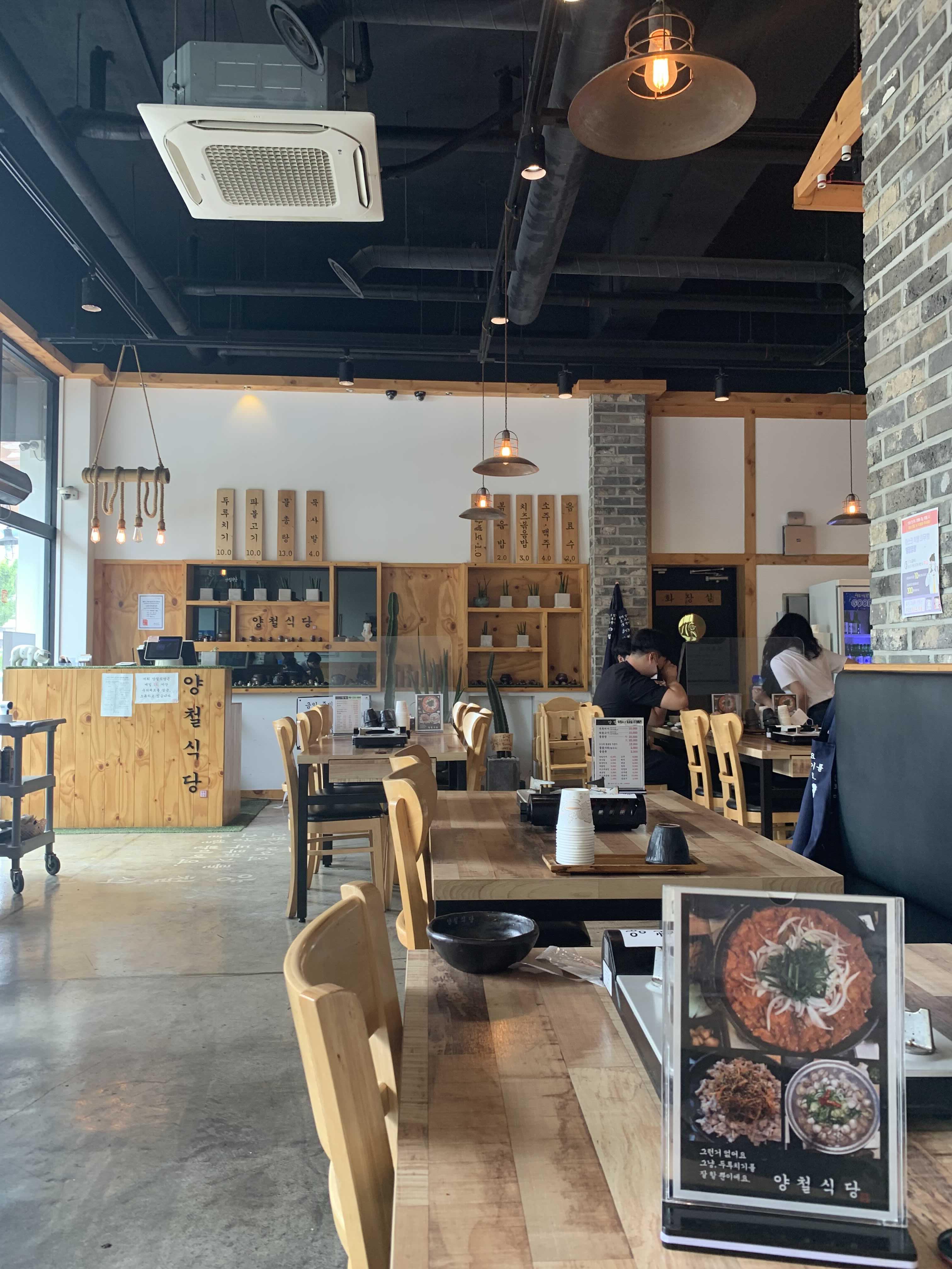 식당 내부는 천정 텍스가 없는 오픈형 천정으로 높은 층고로 개방감이 있었습니다. 식당 내부와 밑반찬으로 나온 어묵, 콩나물을 맛보는 사이 주문한 음식이 나왔습니다. 비주얼로는 국물이 적은 김치찌개와 비슷하나 양념은 김치찌개와 완전히 다른 맛이더군요. 달달함과 매운맛이 적절히 조화를 이루더군요.