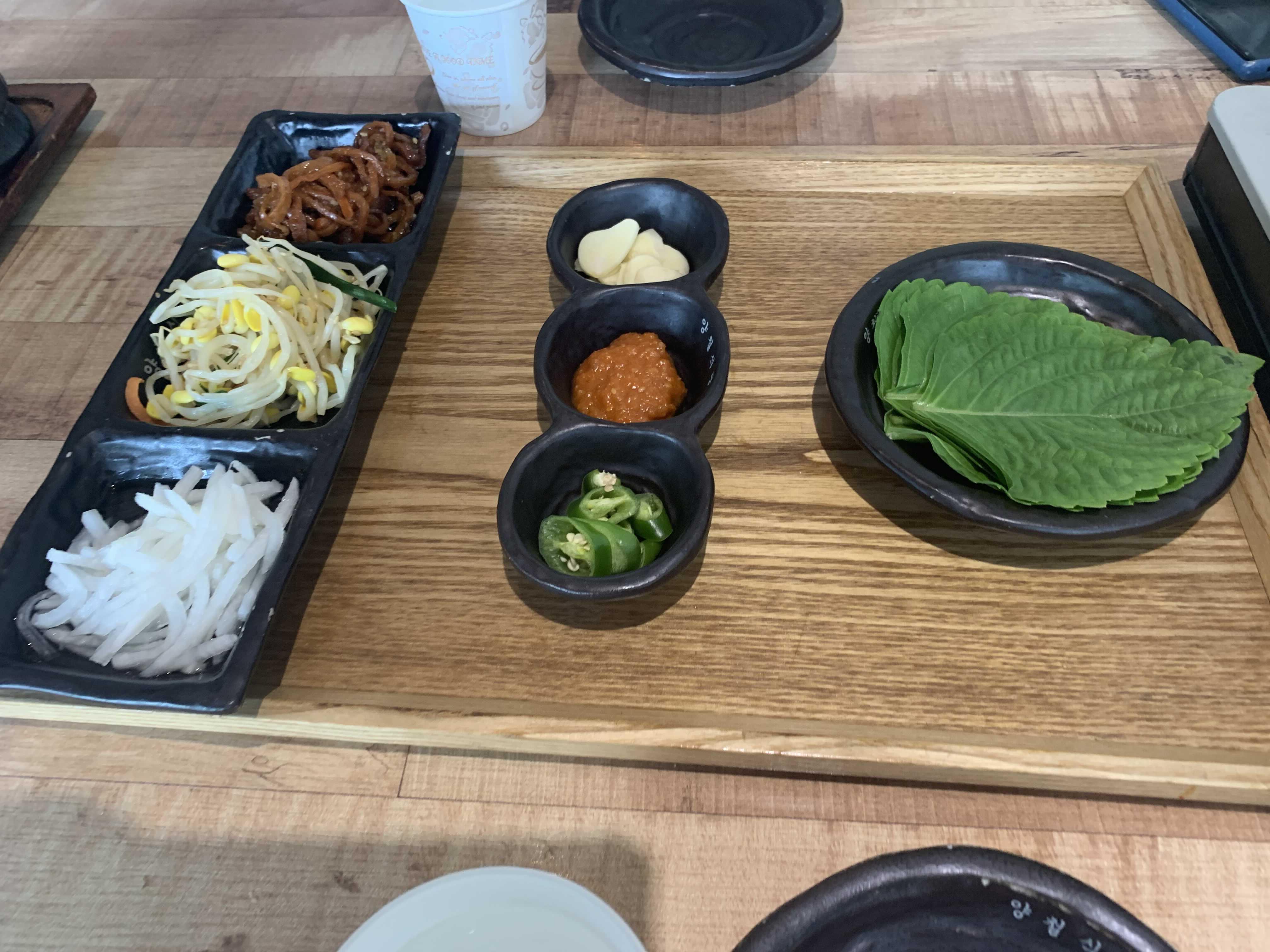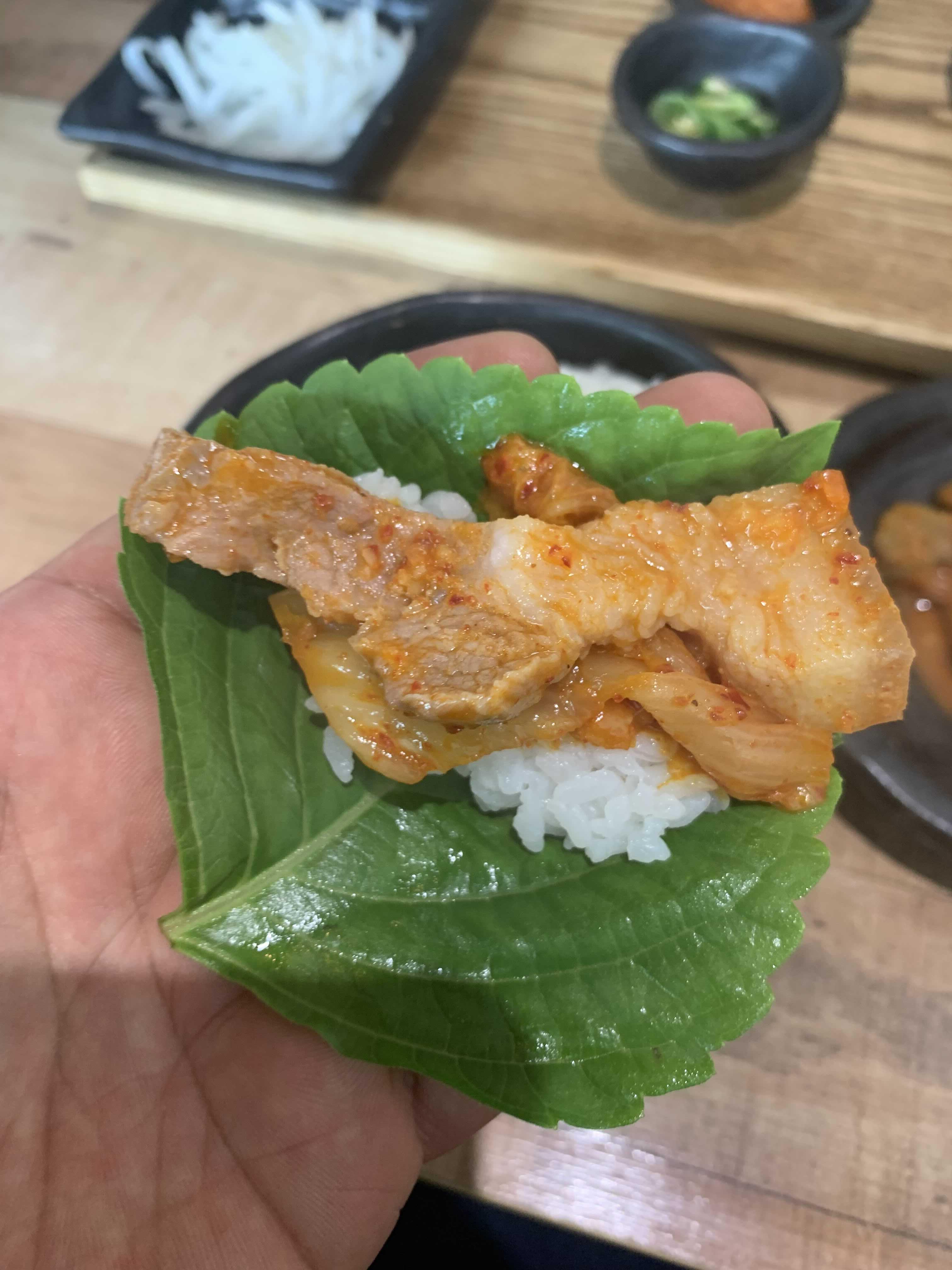 두루치기는 역시 쌈이 제맛이겠죠. 쌈 재료는 깻잎만 제공되는데... 이 깻잎쌈이 두루치기와 잘 어울리더군요. 저녁식사면 술안주로 고기 양념이 적당하겠으나, 술 없이 고기만 먹기에는 양념이 좀 강하더군요. 공깃밥을 주문하고 쌈에 밥을 넣어서 함께 싸 먹으니 완벽한 조합을 이루더군요. 특히 돼지고기 비게 부분이 쫄깃한 식감이 있더군요.
