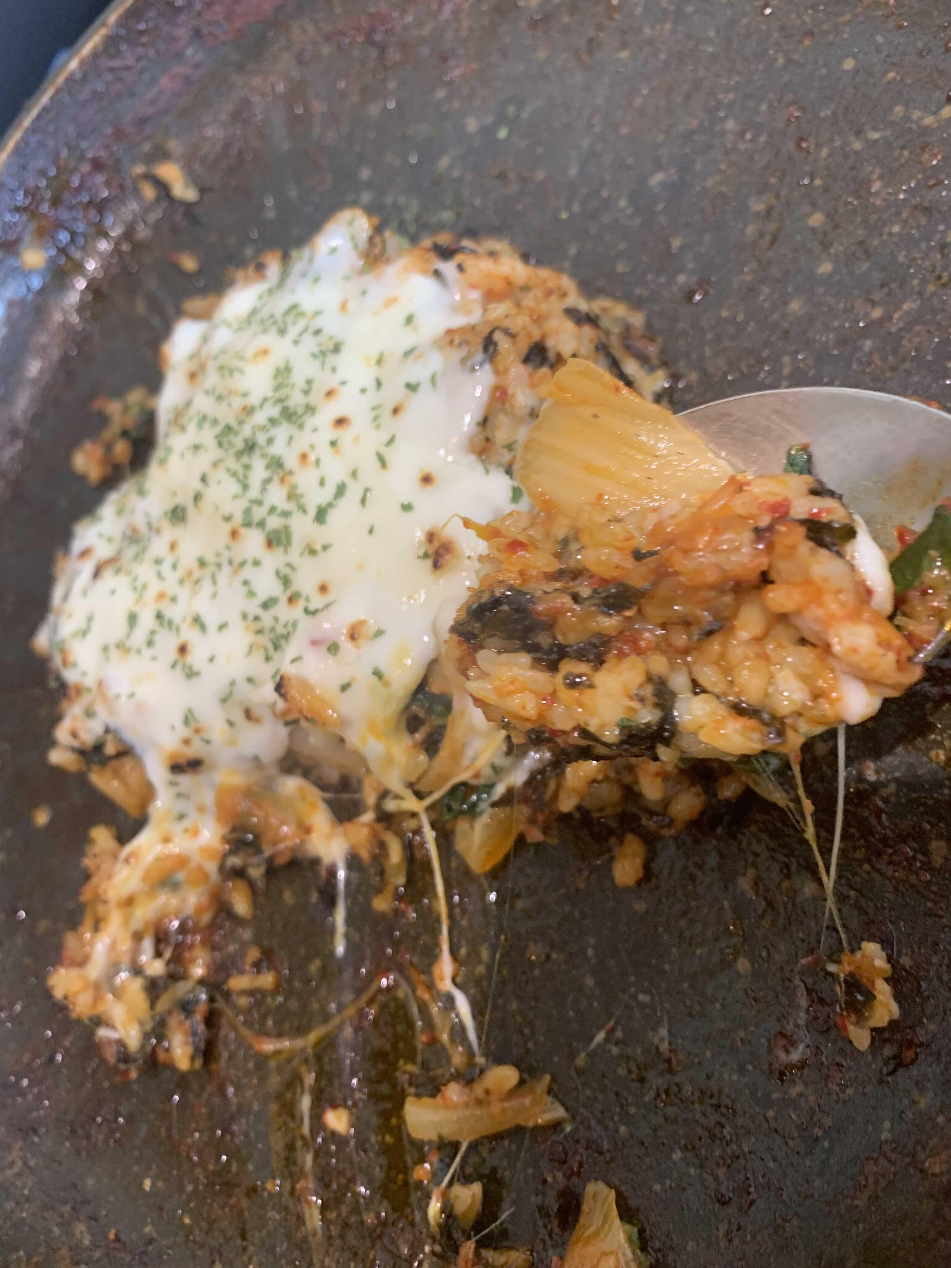 공깃밥을 주문하여 밥을 이미 먹었지만, 메뉴판의 치즈 볶은밥이 눈에 들어오더군요. 남은 고기와 양념이 들어있는 불판을 가져가 만들어 오시더군요. 이미 공깃밥은 먹어서 1인분 치즈 볶은밥^^ 사이즈가 꼭 햄버거 패티 느끼이 들더군요.