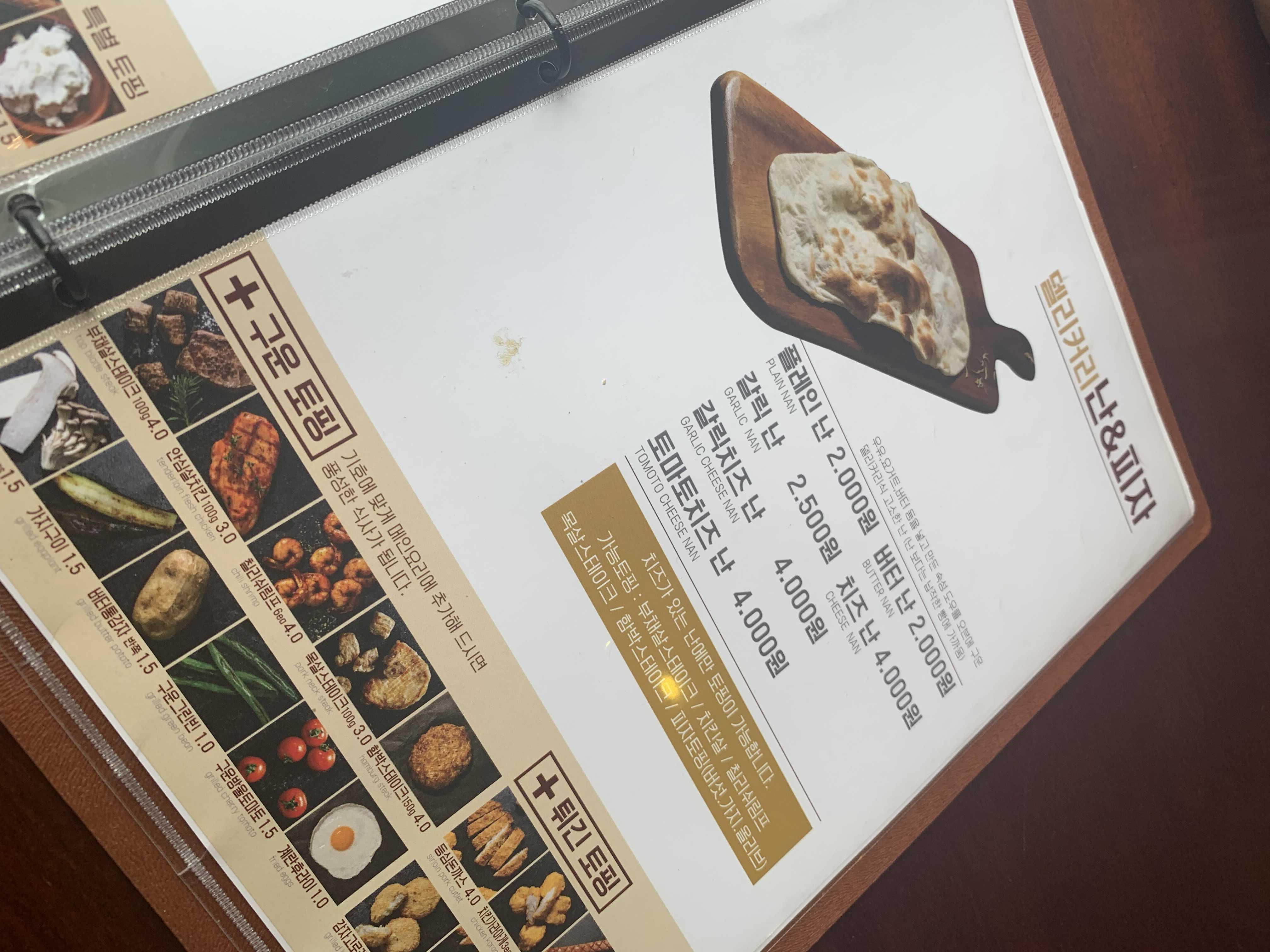 카레 음식은 주로 먹는 음식이 아니다 보니.... 메뉴판을 한참을 스캔하다 지인 추천으로 "치킨 살 마살라 카레"를 주문했습니다. 그리고, 카레와 함께 먹는 "난"을 주문했습니다. "난"은 처음 먹는 음식이라 생소했던 음식이었습니다.