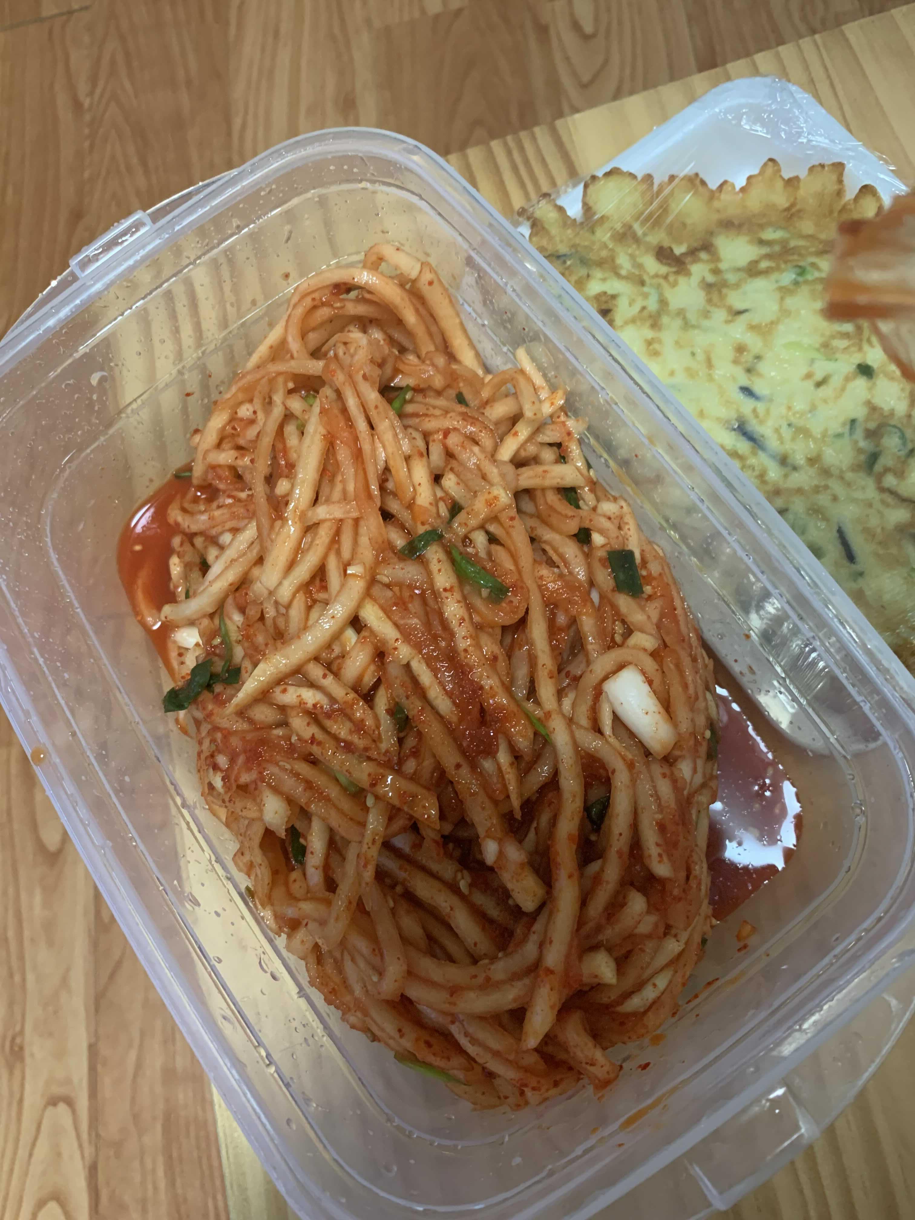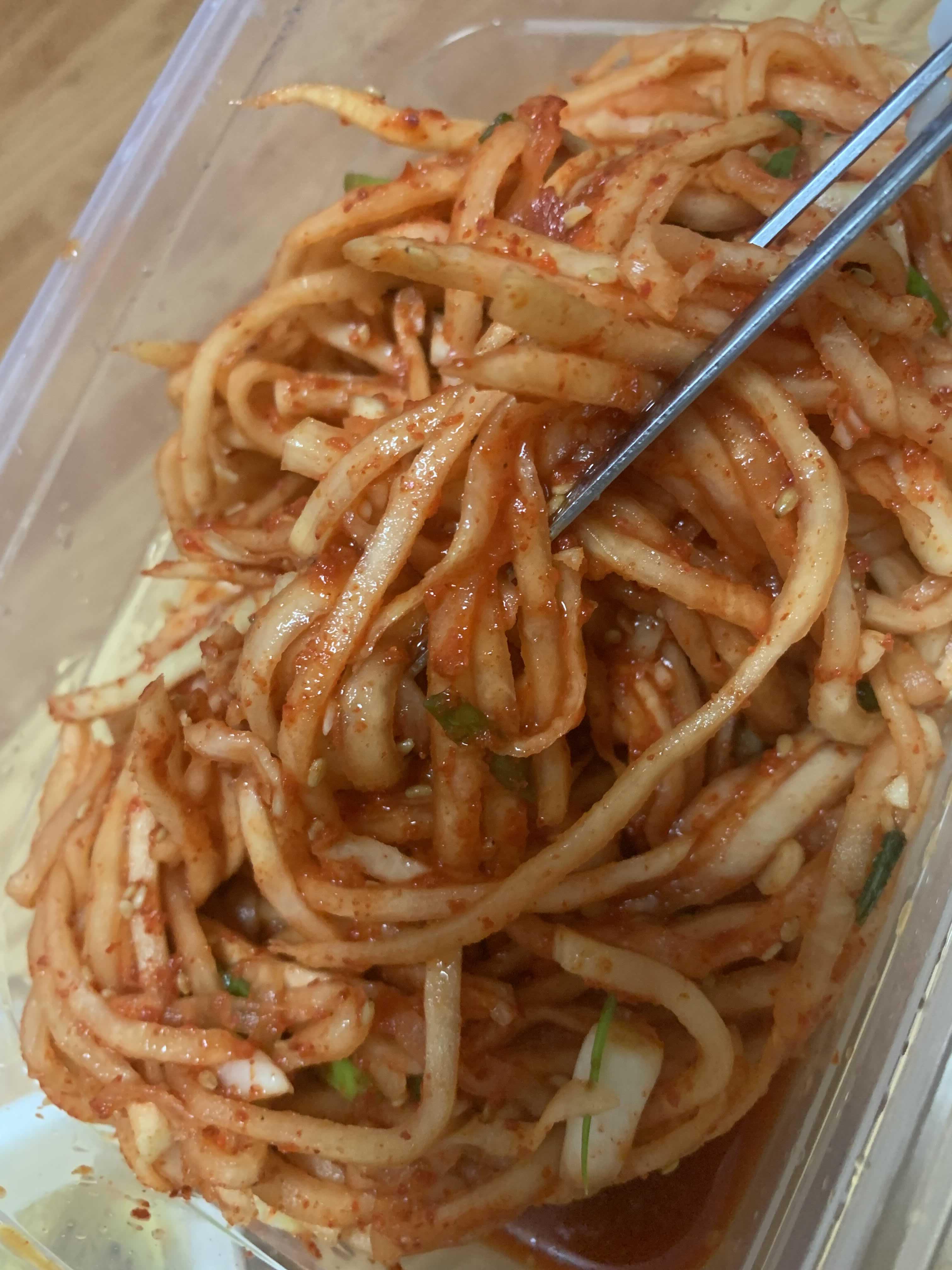 반찬 중 가장 많이 사 먹는 반찬은 김치!!! 그중 무생채를 가장 많이 사 먹습니다. 가격은 2,000원으로 가격은 저렴, 양은 많습니다. 특히 라면과 함께 먹기 좋은 반찬 중에 하나입니다. 무생채 외 자주 사 먹는 김치는 열무김치로 가격은 5,000원으로.... 양이 상당히 많습니다. 반찬 그릇에 하나에 넘쳐.... 한통 채우고, 다른 하나는 비닐봉지 그대로 보관 후 나중에 먹고 있네요.ㅎㅎ