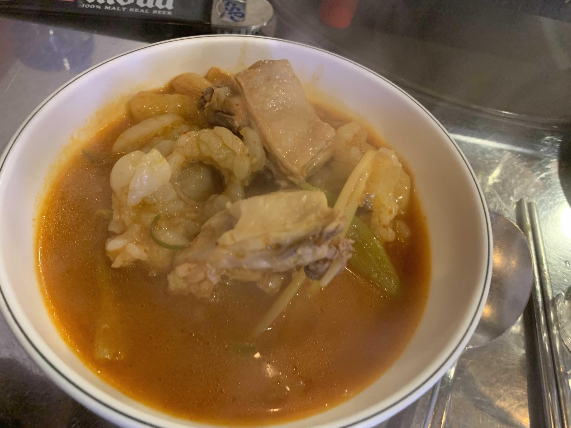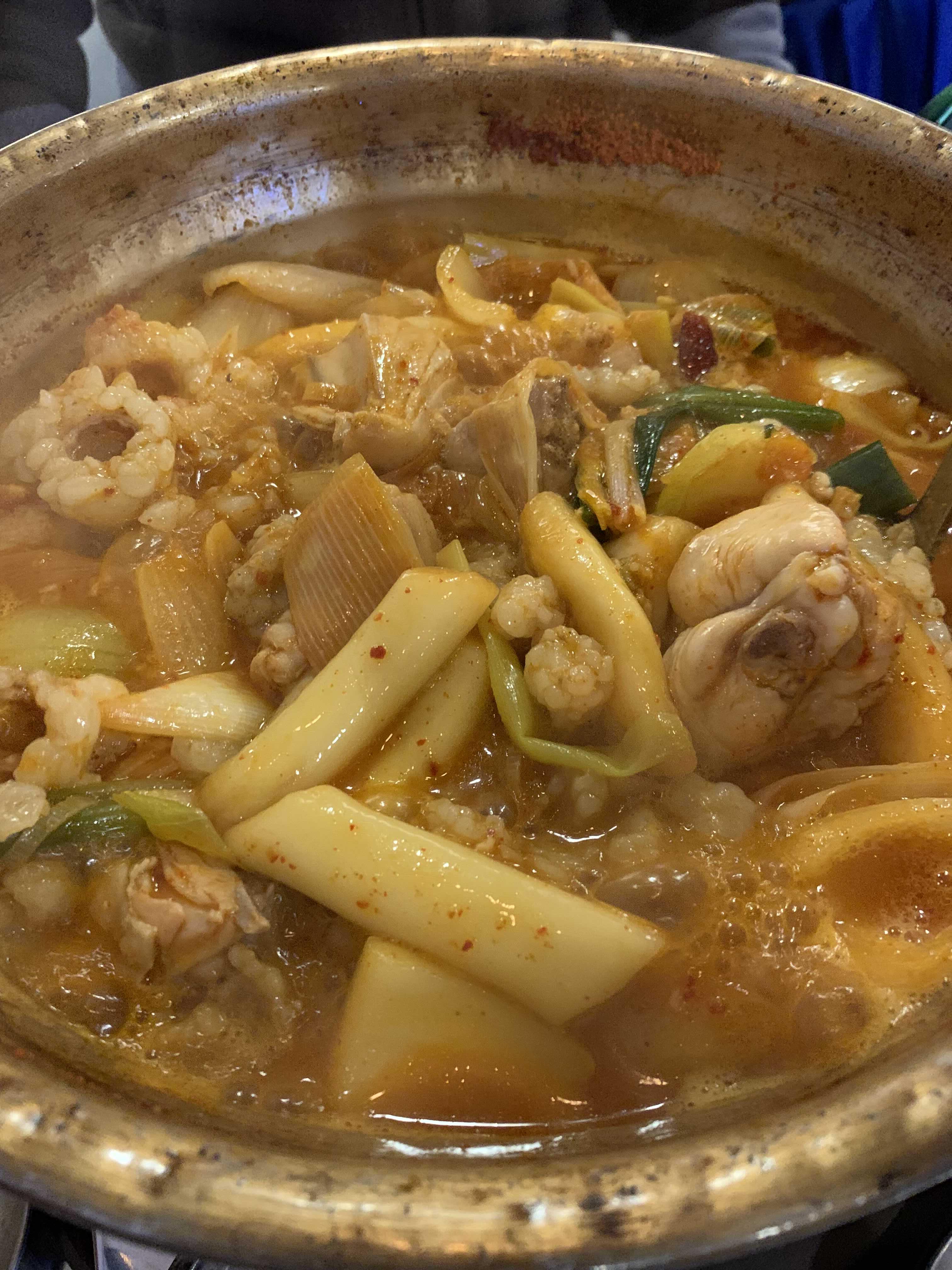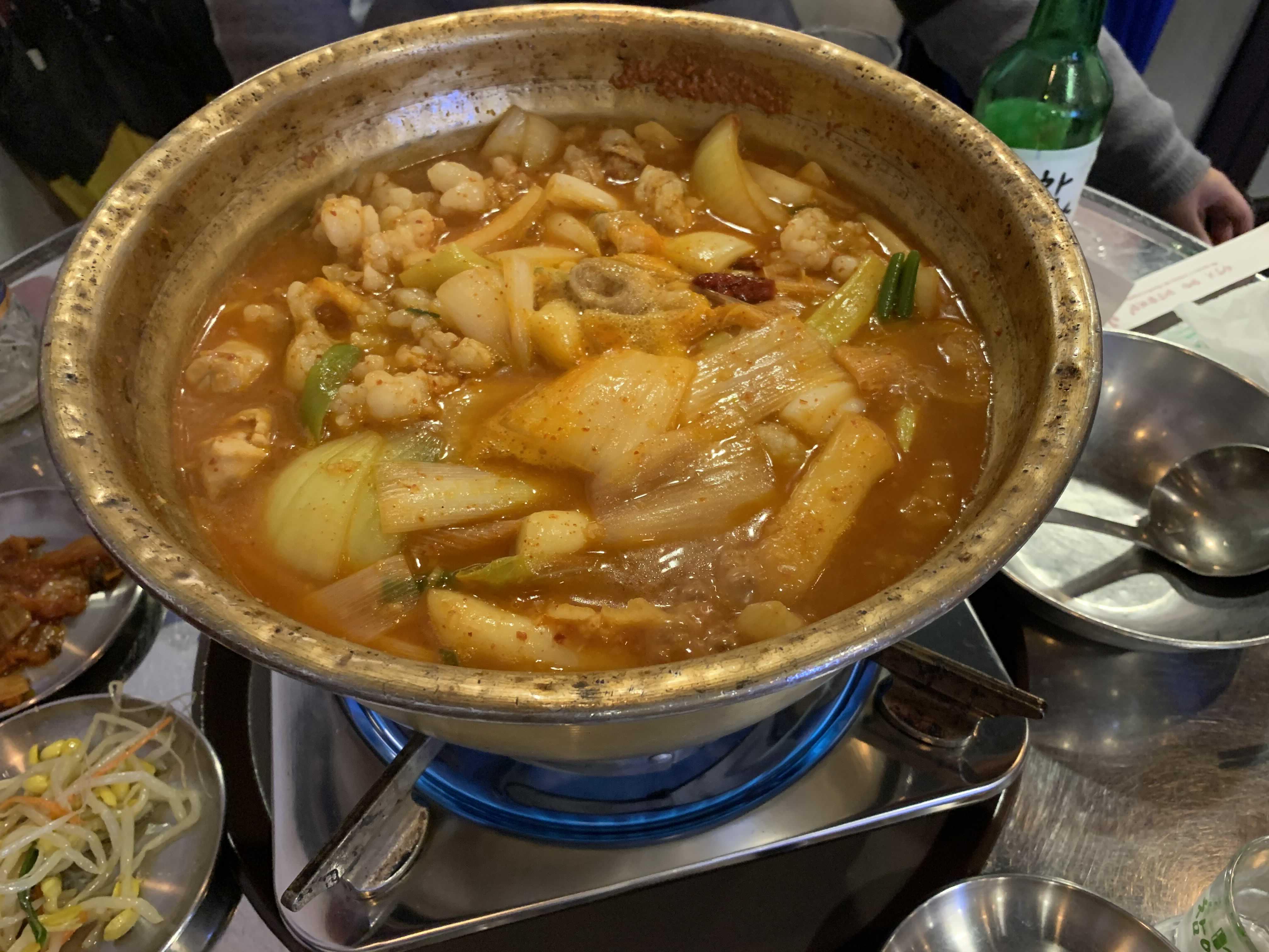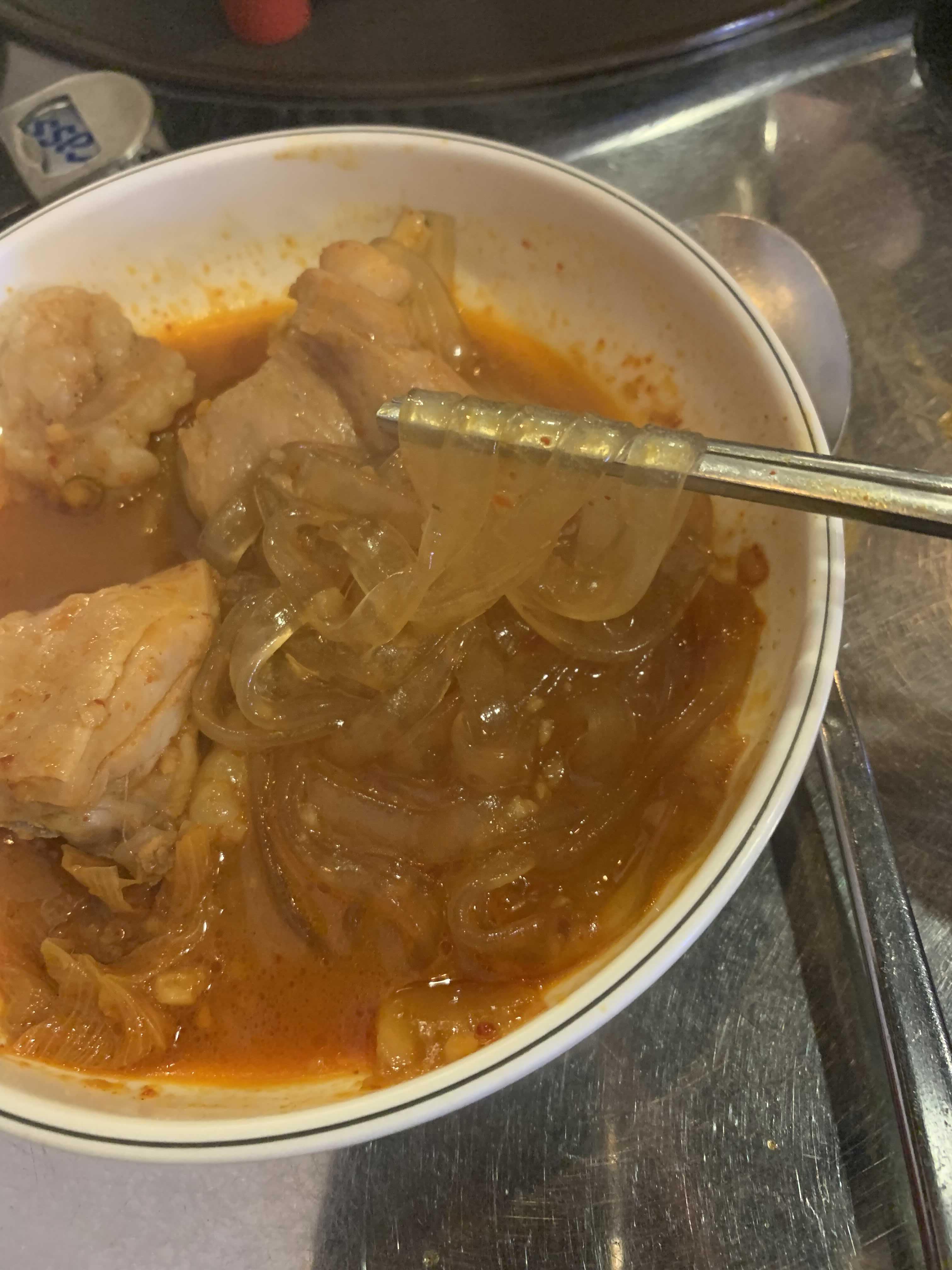 달걀프라이를 만들어 먹는 사이 주메뉴 곱도리탕이 나왔습니다. 메뉴 비주얼은..... 이게 무슨 잡당인가?라는 느낌이 드는 비주얼이더군요. 건더기와 국물을 한국자 떠 국물을 먼저 맛을 보니^^ 약간의 매콤함에 담백함이 가득한 국물 맛이더군요.