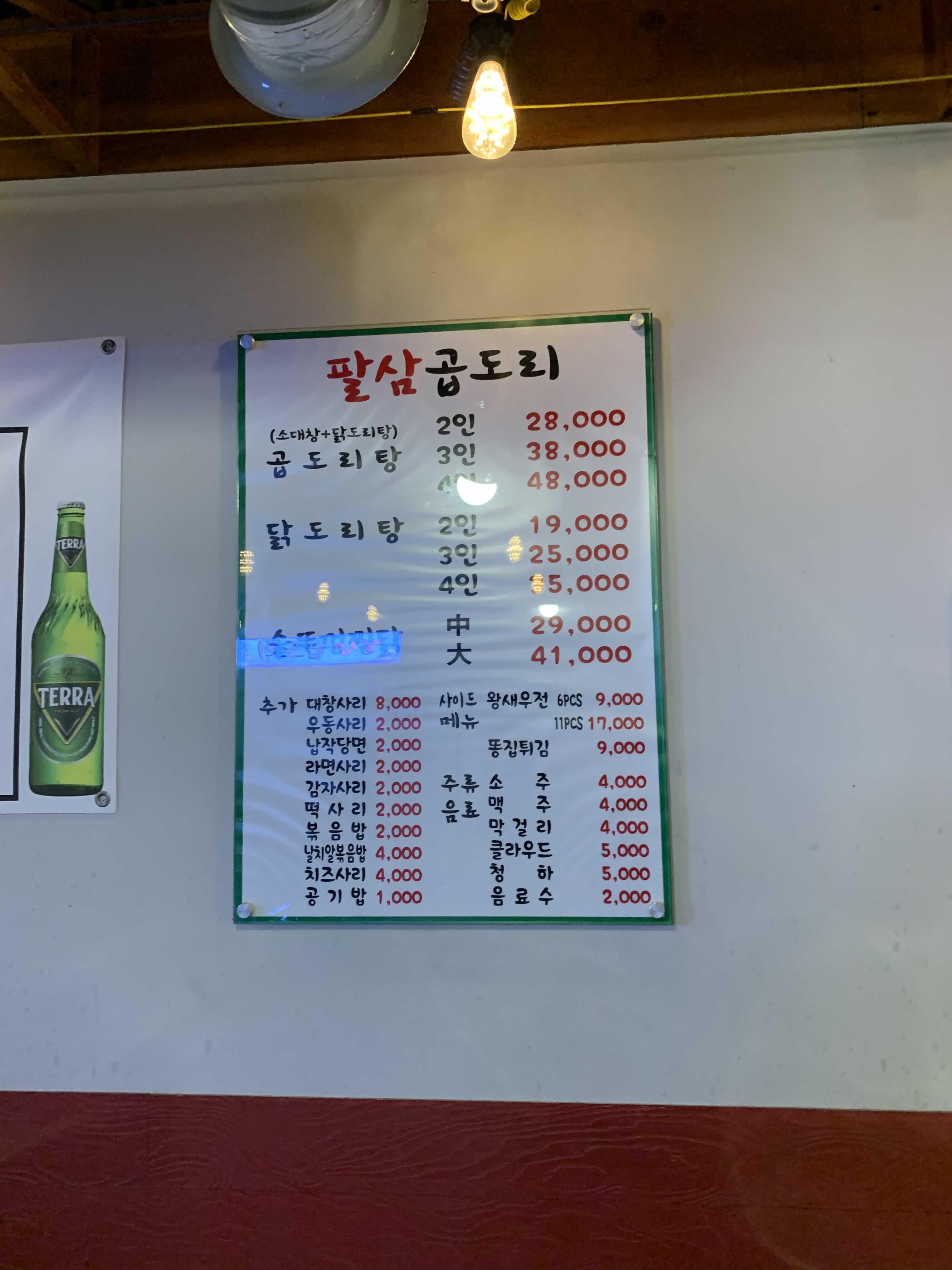 메뉴는 3가지로 곱도리탕, 닭볶음탕, 솥뚜껑 찜닭으로 구성되어 있더군요. 이 중 곱도리탕(소 대창+닭볶음탕) 3인 메뉴로 주문했습니다. 가격은 38,000원으로 3명이 저녁 안주 메뉴로는 비싸게 느껴지지 않는 가격이더군요.